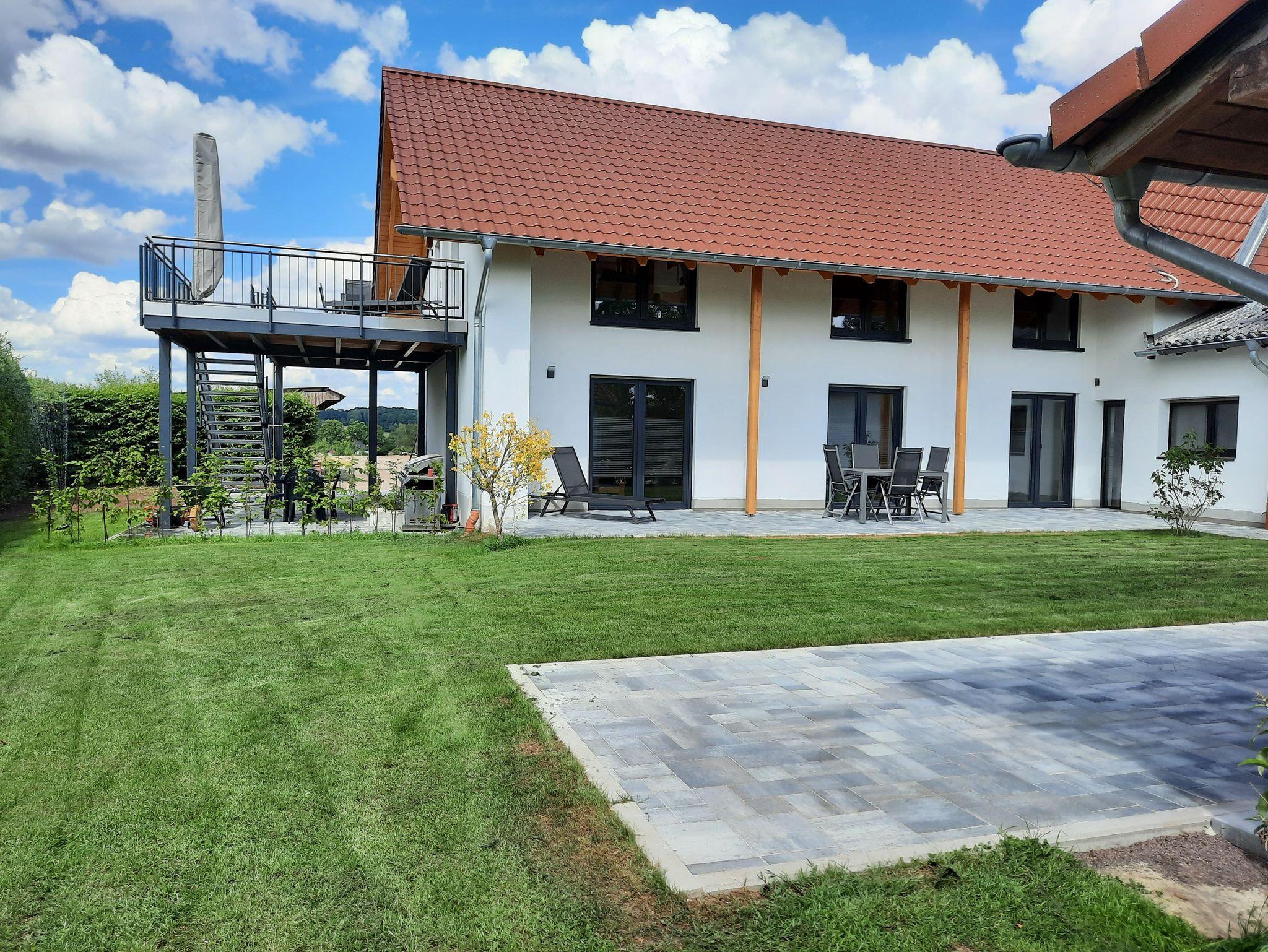 Unsere familienfreundliche Obergeschosswohnung mit 88 m² wurde liebevoll und modern eingerichtet und beinhaltet eine vollwertig ausgestattete, offene Küche mit großem Essbereich. Im gemütlichen Wohnbereich befindet sich eine moderne Wohnlandschaft auf der alle Familienmitglieder Platz finden. Die beiden gleichwertigen Schlafzimmer sind ausgestattet mit je einem Doppelbett. Ein Kleinkinderbettchen steht auf Wunsch bereit. Das Badezimmer, mit Tageslicht, ist freundlich und geräumig mit einer ebenerdigen Dusche. In der gesamten Wohnung nutzen Sie W-LAN und Fußbodenheizung, elektrische Rollläden in Schlaf- und Wohnräumen. Im Kellergeschoss befindet sich ein Hauswirtschaftsraum für beide Wohnungen. Der Zugang zur wohnungseigenen, möbilierten Sonnenterrasse mit Liegewiese ist von Wohn- und beiden Schlafräumen gegeben.