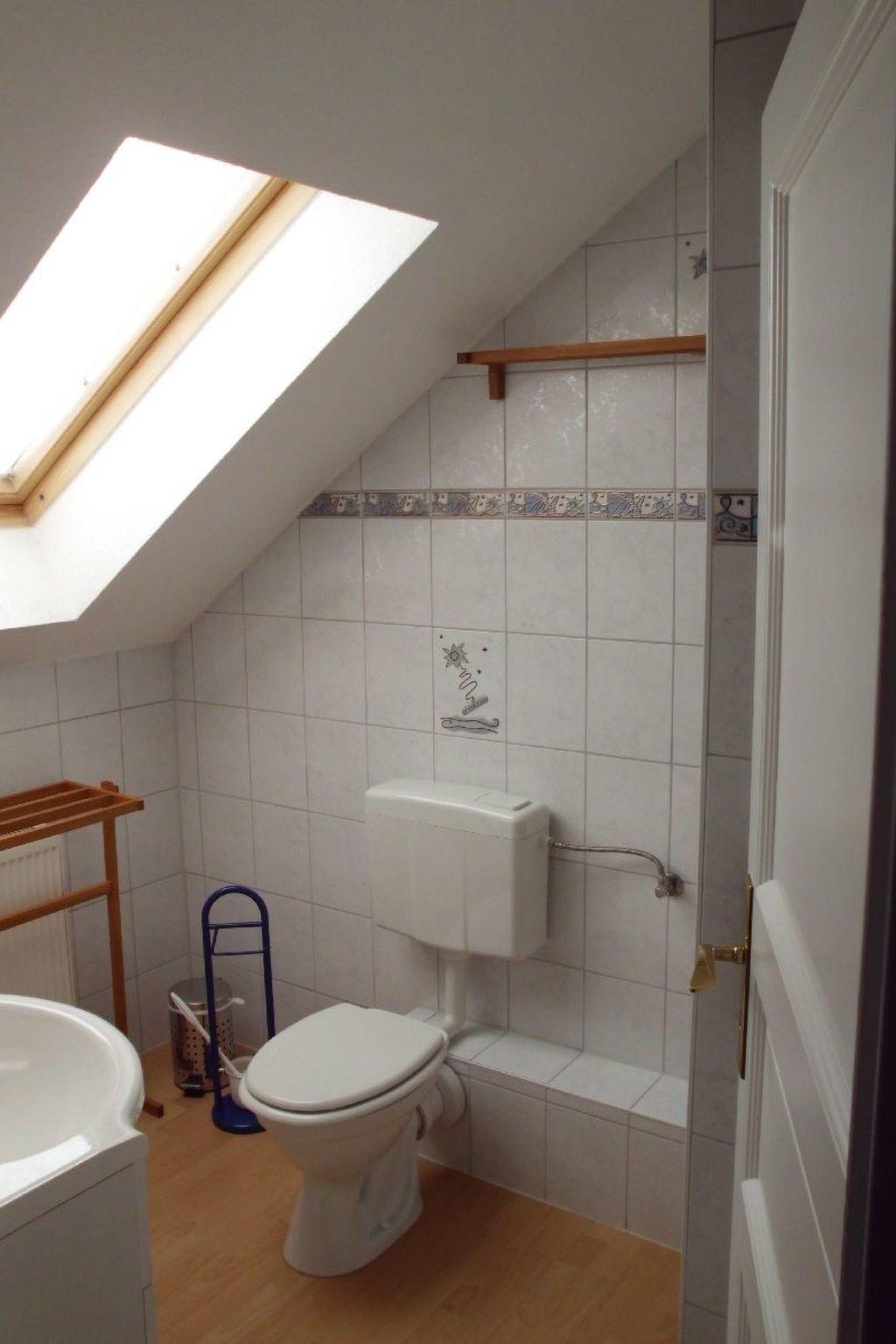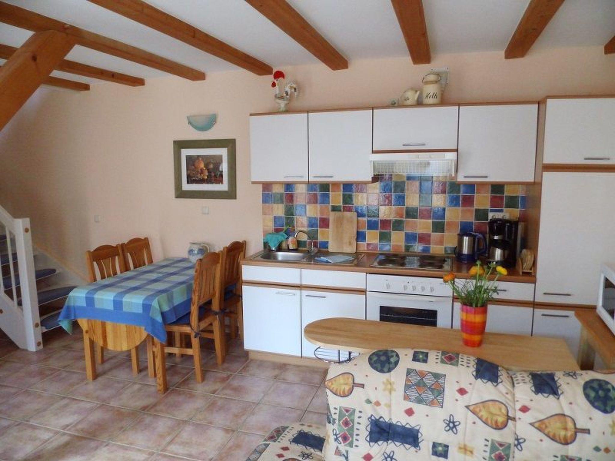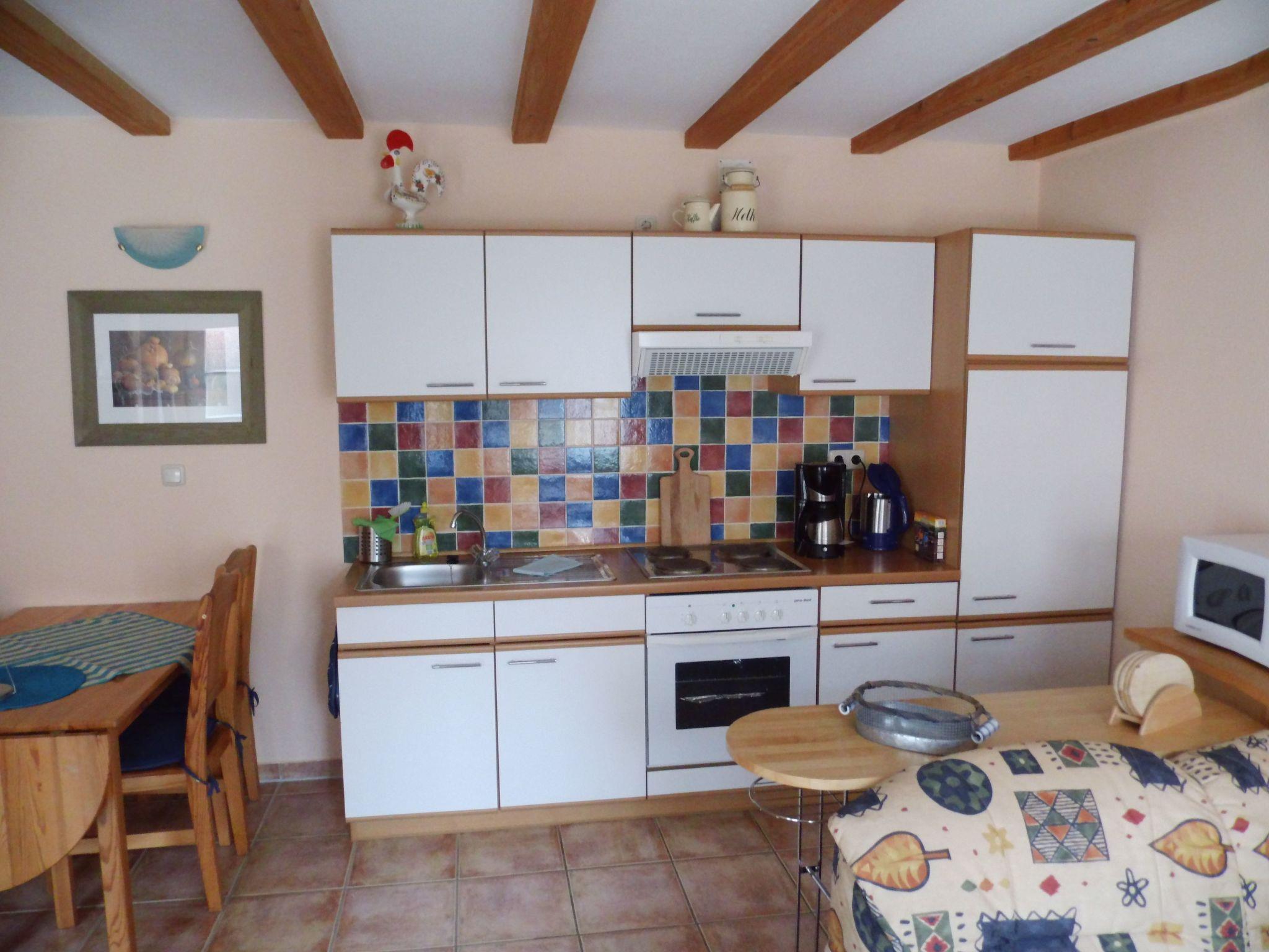 On the ground floor of the approx. 30m² holiday flat you will find a cosy living room with a seating area and satellite TV. The sofa can also be used as a bed. You will also find a small, fully equipped kitchen here. In addition to all the important kitchen utensils, there is also a microwave, a toaster, a two-ring hob and a fridge with freezer compartment. The dining table for four people not only invites you to eat together but also to socialise. An open staircase leads to the sleeping area with a double bed and a wardrobe to store your clothes. The shower room with WC is also located here.