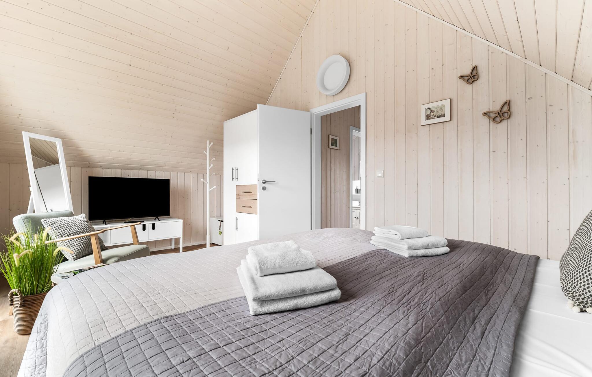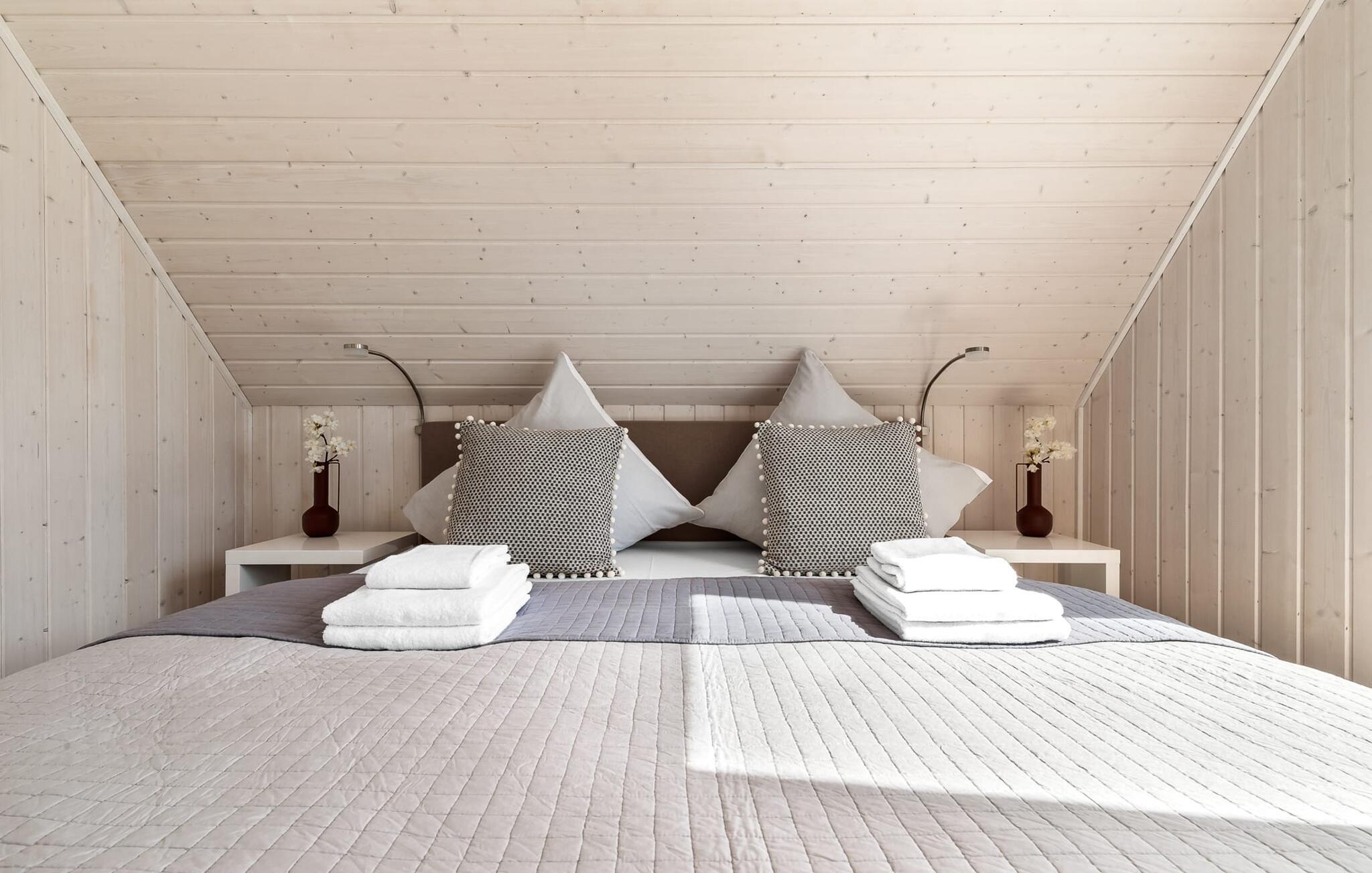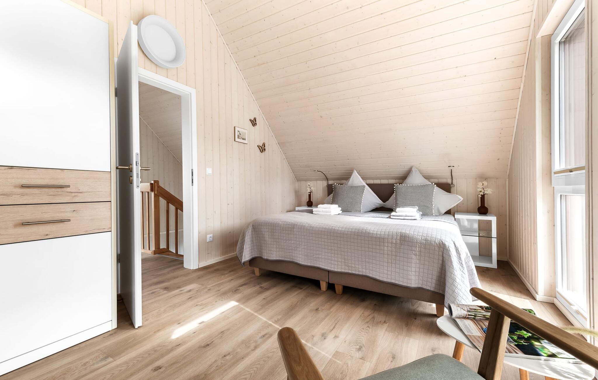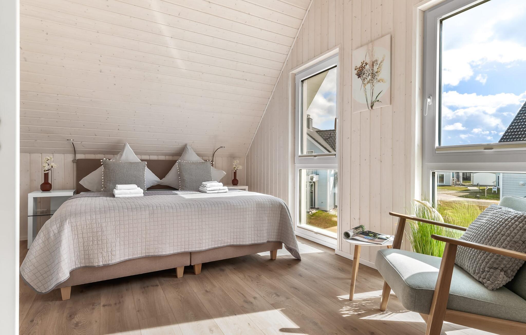Til wellness-elskere: Også på denne etage sikrer det rummelige gæstebadeværelse med brusebad i gulvniveau og en infrarød sauna maksimal afslapning. Når I ankommer til første sal, vil I blive budt velkommen af husets afslapningsområde. Herfra er der adgang til de to soveværelser. Et af soveværelserne er udstyret med en komfortabel boxmadras-dobbeltseng, og det andet soveværelse har to enkeltbokse med springmadrasser. Begge soveværelser er udstyret med TV til hyggelige filmaftener. Udover de to soveværelser fuldender det andet badeværelse feriefølelsen med badekar og integreret bruseanlæg.