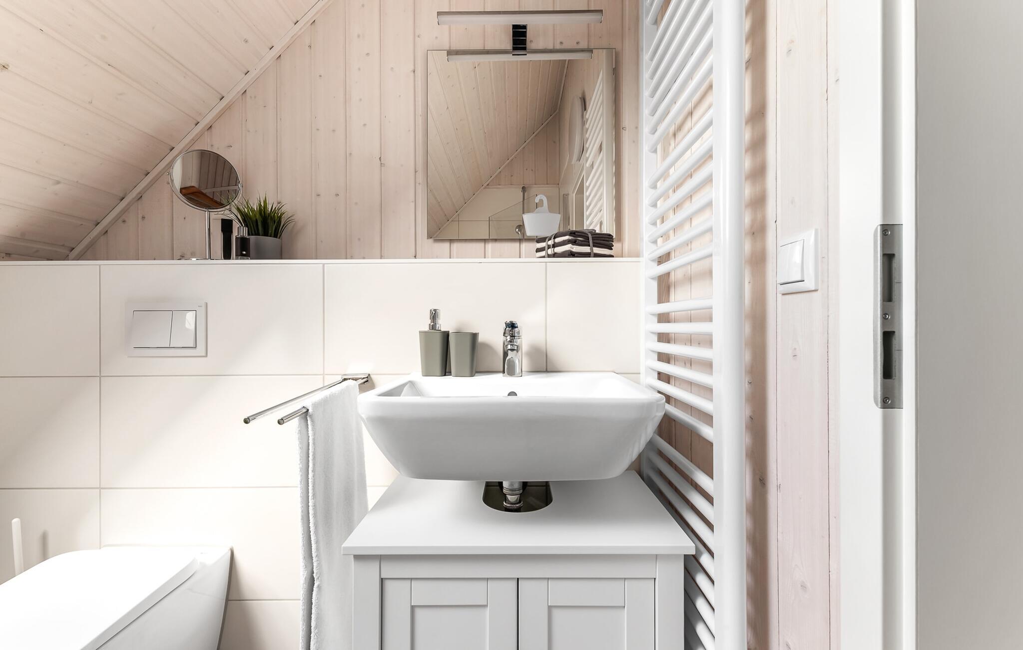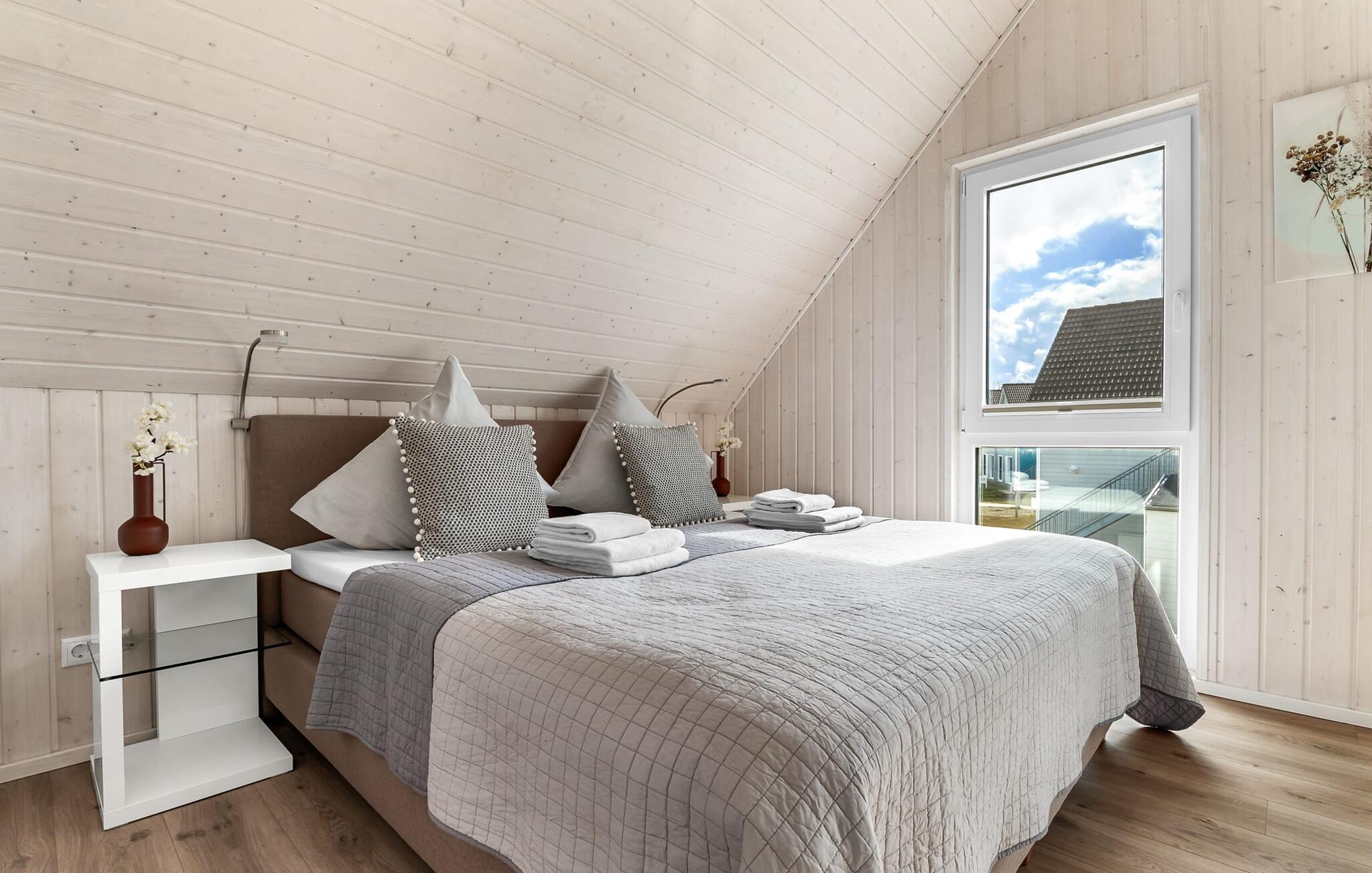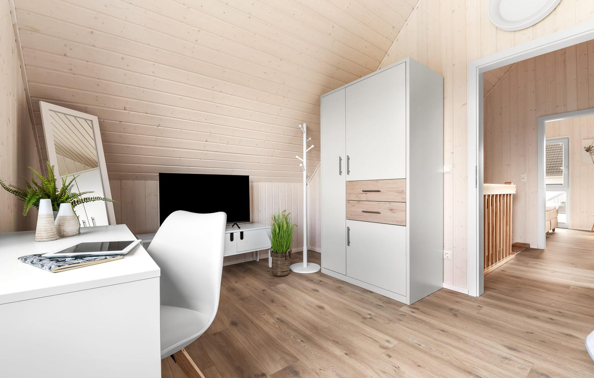 Til wellness-elskere: Også på denne etage sikrer det rummelige gæstebadeværelse med brusebad i gulvniveau og en infrarød sauna maksimal afslapning. Når I ankommer til første sal, vil I blive budt velkommen af husets afslapningsområde. Herfra er der adgang til de to soveværelser. Et af soveværelserne er udstyret med en komfortabel boxmadras-dobbeltseng, og det andet soveværelse har to enkeltbokse med springmadrasser. Begge soveværelser er udstyret med TV til hyggelige filmaftener. Udover de to soveværelser fuldender det andet badeværelse feriefølelsen med badekar og integreret bruseanlæg.