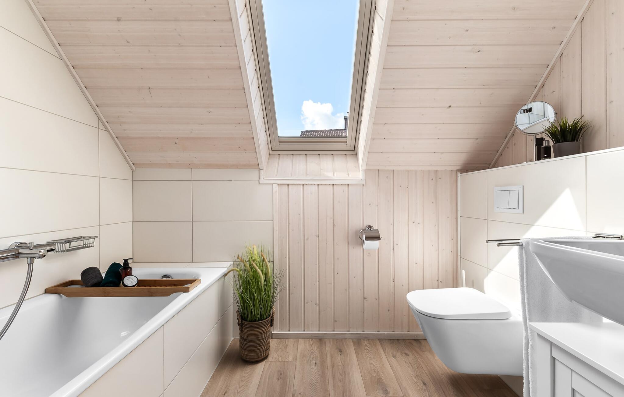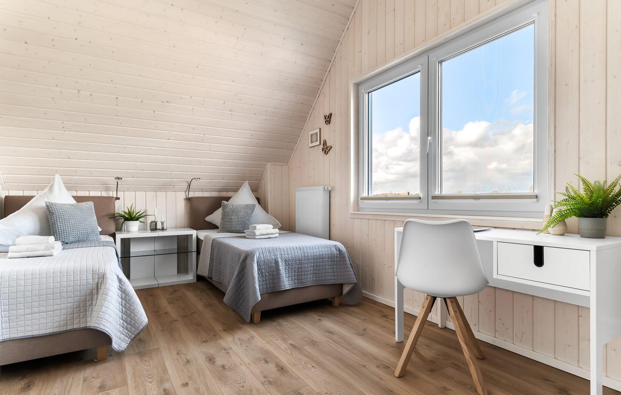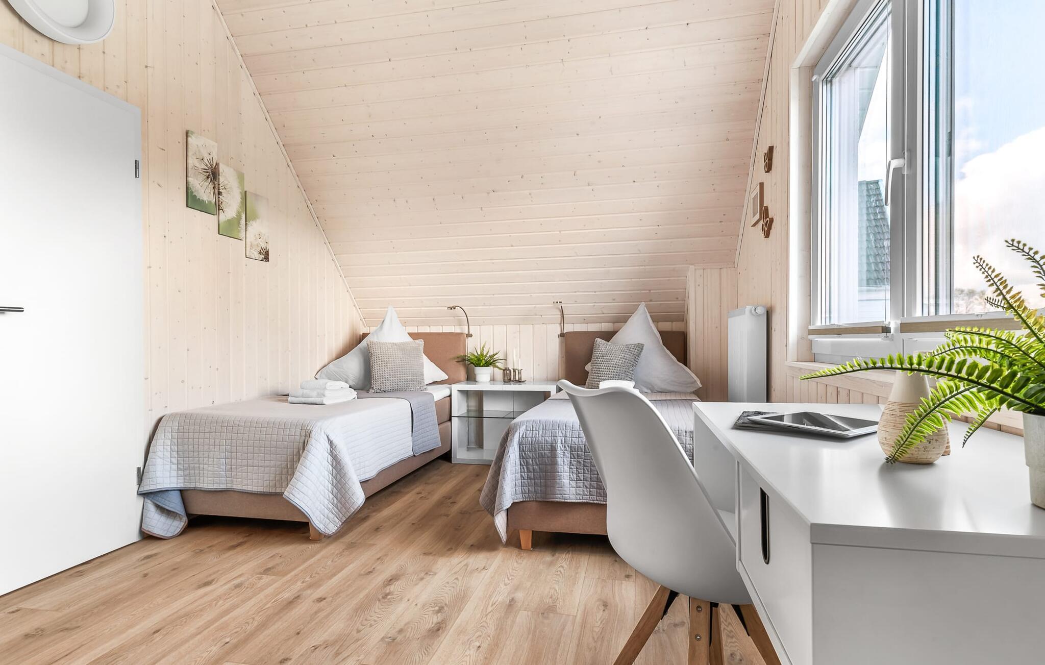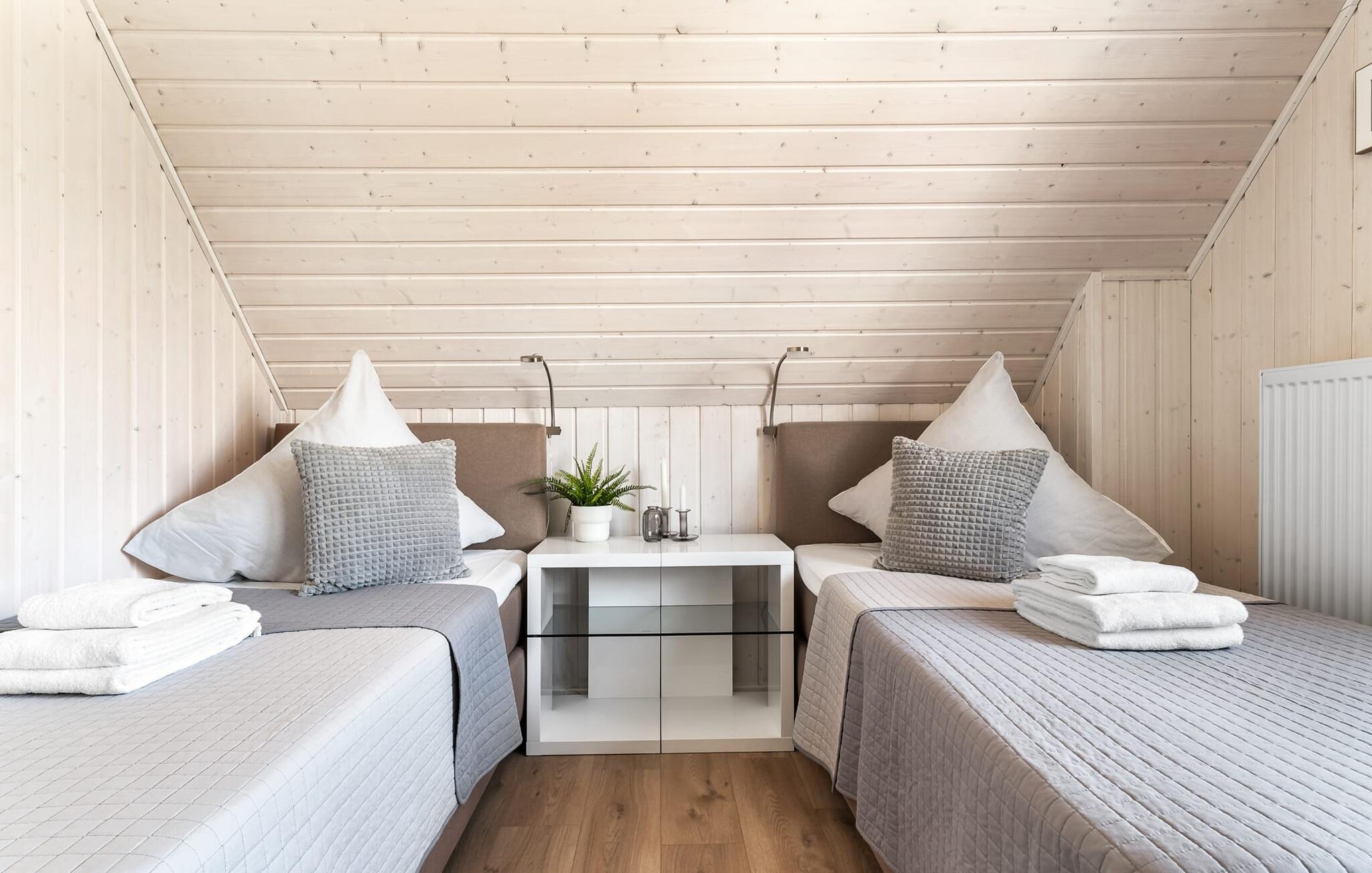 Til wellness-elskere: Også på denne etage sikrer det rummelige gæstebadeværelse med brusebad i gulvniveau og en infrarød sauna maksimal afslapning. Når I ankommer til første sal, vil I blive budt velkommen af husets afslapningsområde. Herfra er der adgang til de to soveværelser. Et af soveværelserne er udstyret med en komfortabel boxmadras-dobbeltseng, og det andet soveværelse har to enkeltbokse med springmadrasser. Begge soveværelser er udstyret med TV til hyggelige filmaftener. Udover de to soveværelser fuldender det andet badeværelse feriefølelsen med badekar og integreret bruseanlæg.