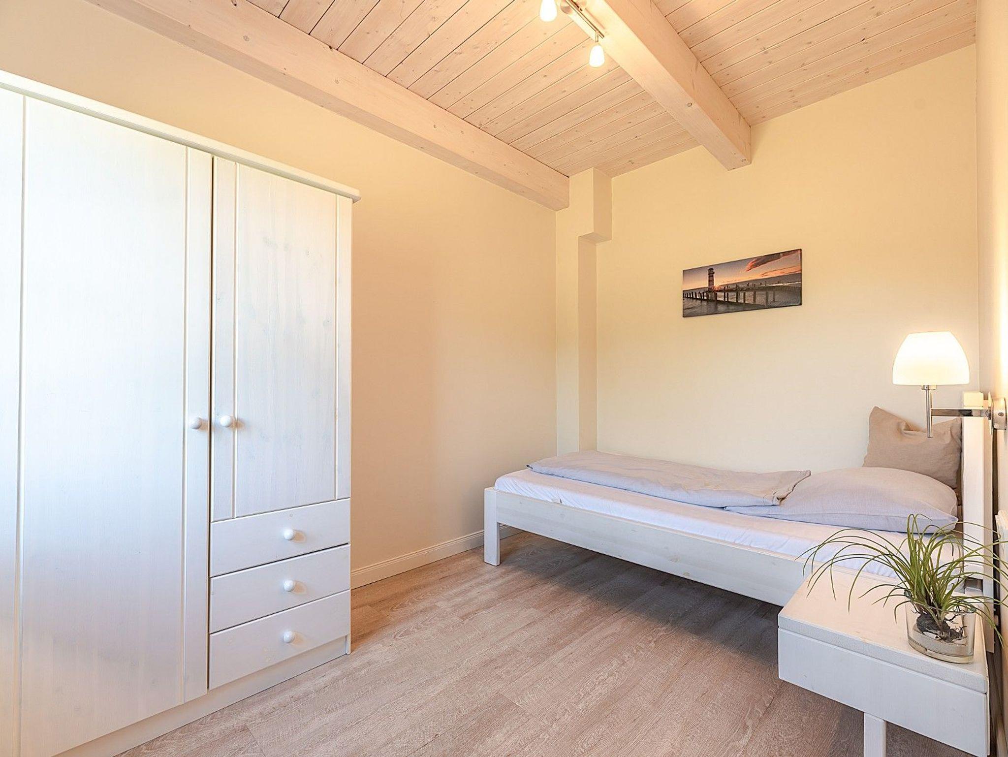 Der offene Wohnbereich mit gemütlicher Sofaecke, Kaminofen und voll ausgestatteter Küche bildet das Herz des Hauses. Im Erdgeschoss befinden sich ein Schlafzimmer mit breitem Einzelbett sowie ein barrierearmes Bad mit schwellenloser Dusche ? ideal für Gäste, die auf Treppen verzichten möchten.