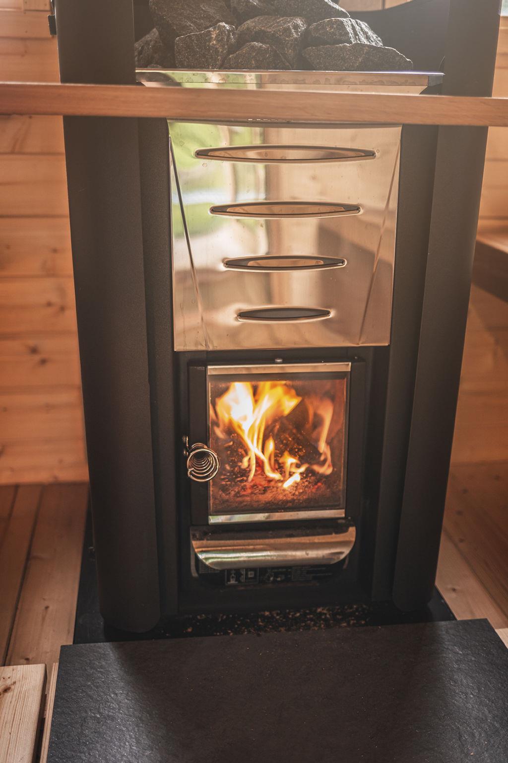 Next to it there is a large panoramic hot tub (wood-heated whirlpool) and a wood-heated outdoor sauna with a view of the valley.