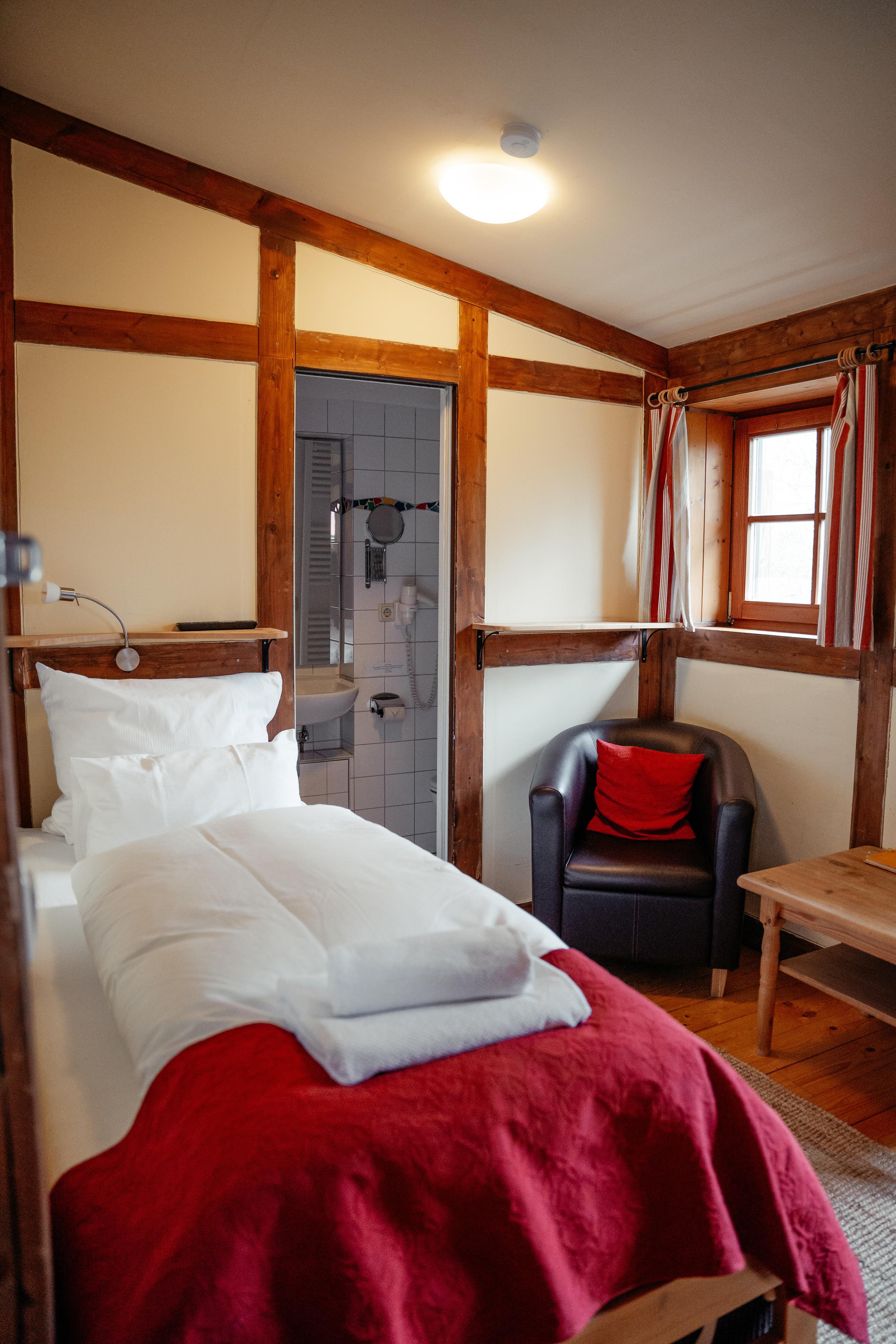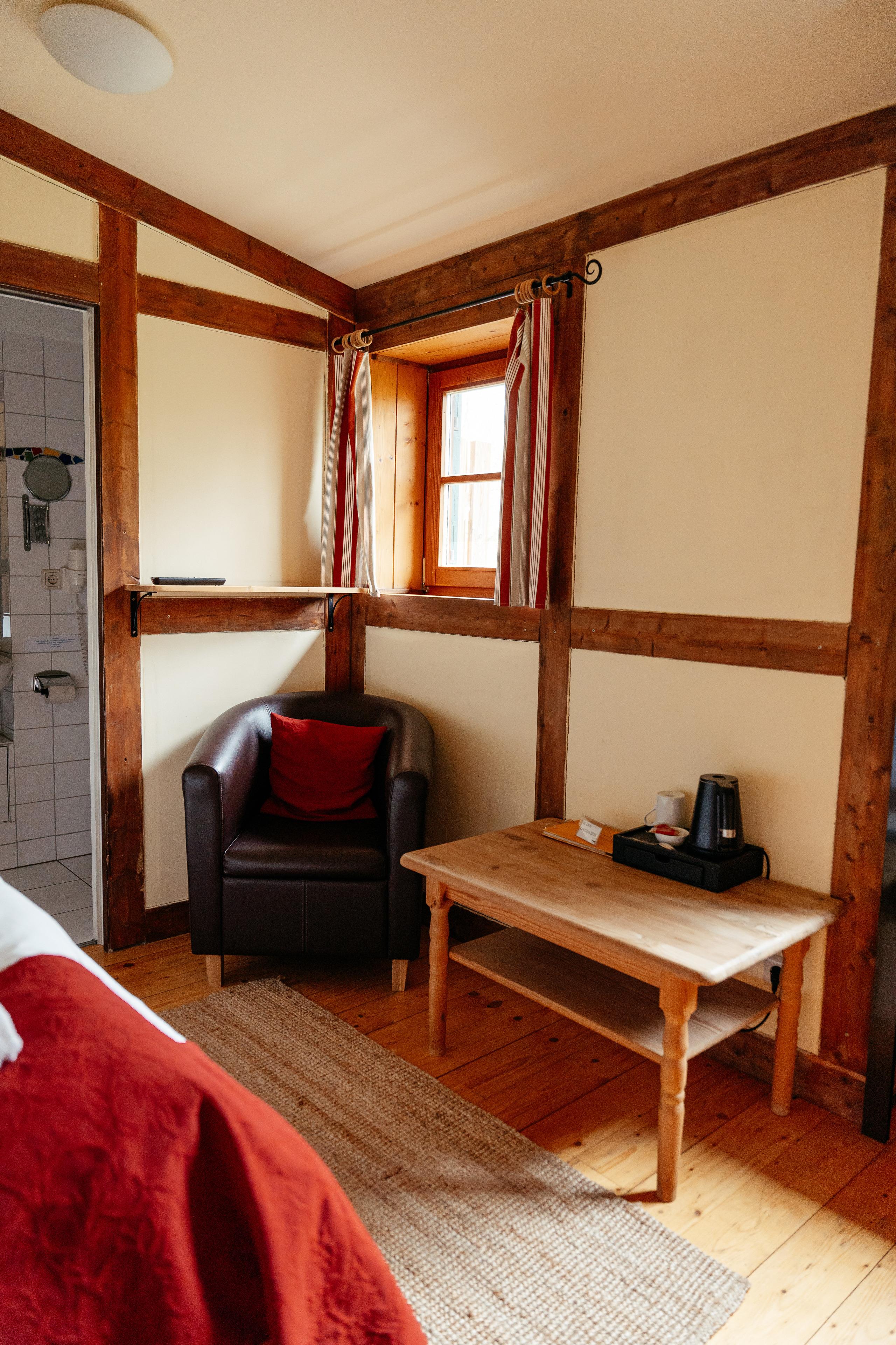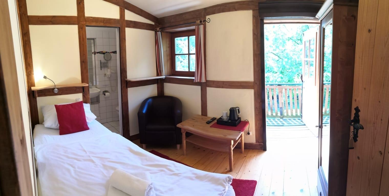 Die Haferkammer ist ein Einzelzimmer, welches sich im ersten Stock unserer Scheunensuiten befindet. Mit einem eigenen Balkon mit Blick auf den Bauerngarten, kann man sich hier sehr gut entspannen und die Ruhe genießen.