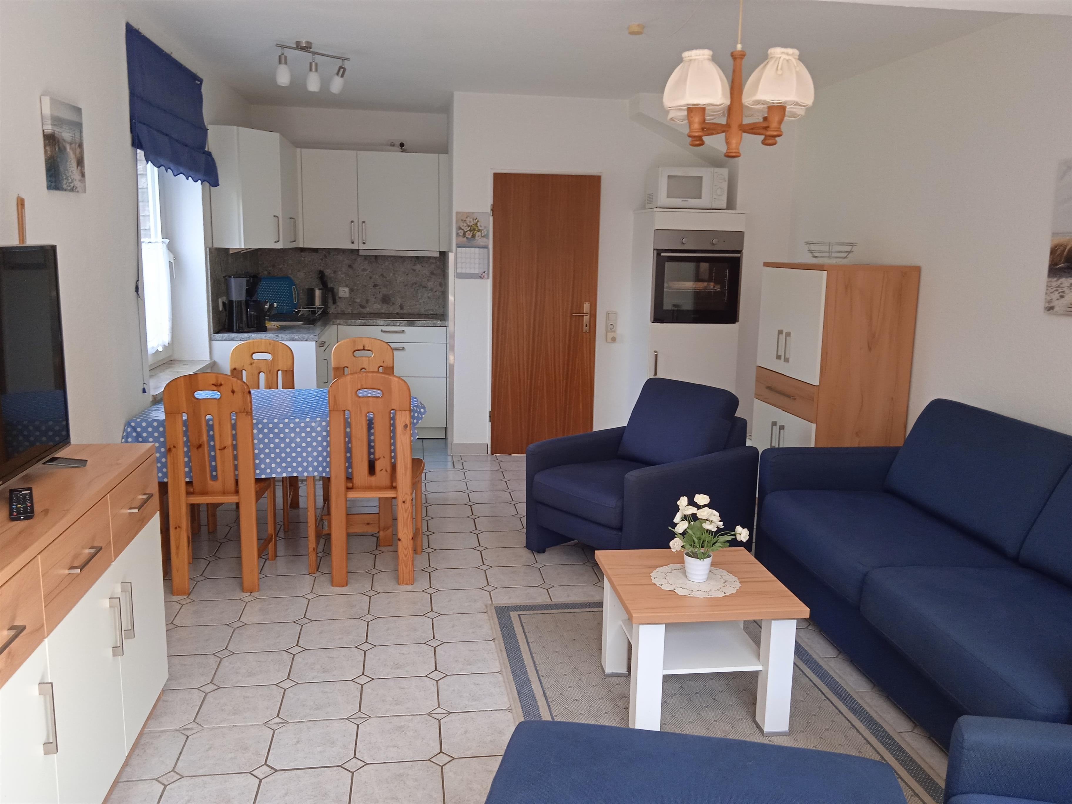 Im EG befinden sich das in 2021 renovierte Duschbad mit Fenster und das in 2020 renovierte Wohnzimmer (ca. 25m²) mit eigener, eingezäunter Terrasse (Zaunhöhe ca. 1m). Es ist eingerichtet mit 1 Sofa mit Schlaffunktion (für 2 Personen - 1,60m x 2m), 2 Sesseln, SAT-TV, Esstisch mit Stühlen und offen zur ebenfalls in 2020 renovierten Küche mit Dunstabzugshaube, Backofen, Geschirrspülmaschine, Mikrowelle, Cerankochfeld, Kühlschrank mit Gefrierfach, Kaffeemaschine, Wasserkocher, Toaster, Mixer, Eierkocher und Geschirr.