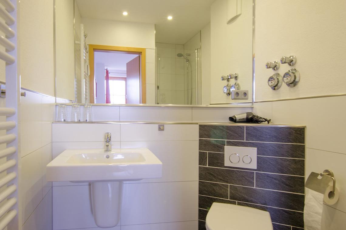 Das Badezimmer ist mit einer Dusche, WC, Fön und Handtuchheizung eingerichtet.