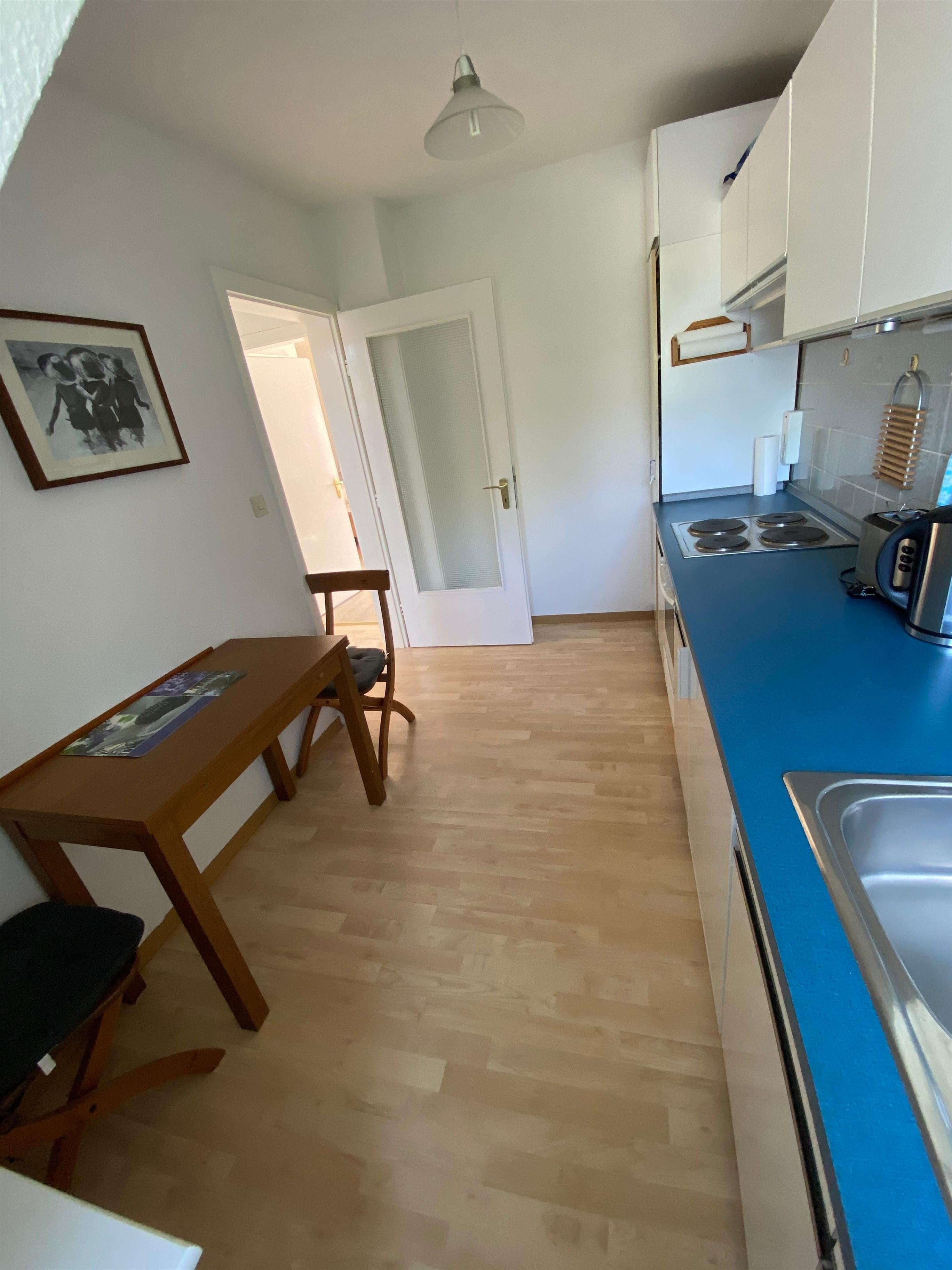 Der Wohnschlafraum mit Couch, Sessel, Doppelbett und Kleiderschrank bietet Platz zum Entspannen und Wohlfühlen. Von hier aus haben Gäste auch Zugang zum Balkon. Die Küche ist mit einem Essplatz und zwei Stühlen ausgestattet. Darüber hinaus verfügt die Ferienwohnung über ein Bad mit Dusche und WC.