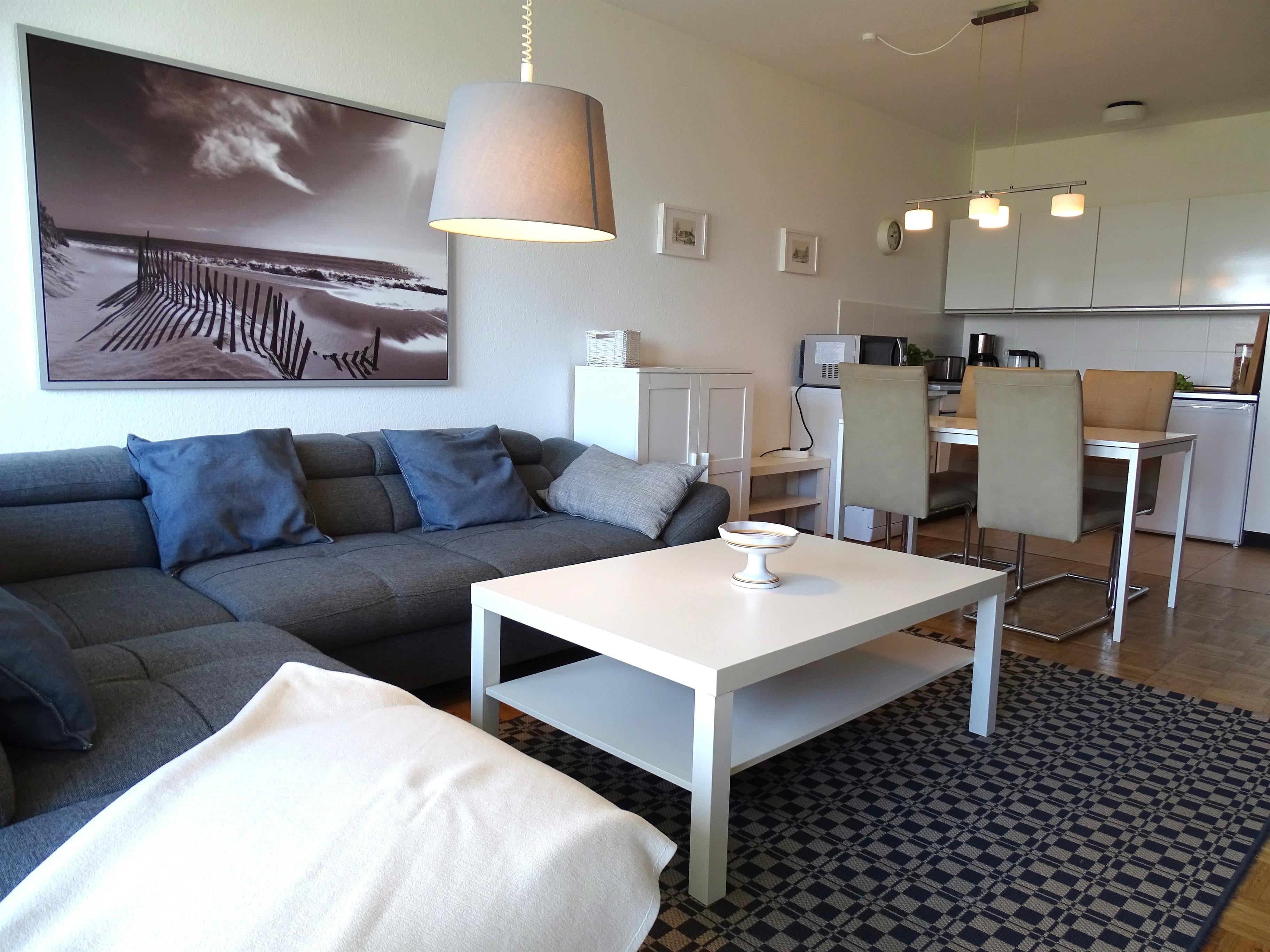 Das Appartement befindet sich in hervorragender Lage, direkt am Deich. Es ist aufgeteilt in Flur mit Garderobe, einem separatem Schlafzimmer mit Doppelbett (180x200cm) mit Kleiderschrank , einem modern gestalteten Duschbad und einem Wohn/-Koch und Schlafbereich im Wohnzimmer. Hier befindet sich eine Küchenzeile, ein modernes Ecksofa und 2 seitlich ausklappbare Einzelschrankbetten. Der möblierte Balkon ist gen Südosten ausgerichtet. Ein direkt am Gebäude überdachter offener Kfz- Garagenstellplatz gehört zum Objekt. Bettwäsche und Handtücher können für den Aufentahlt beim Vermittlungsbüro Wandelt -Strandurlaub Dahme- dazu gebucht werden...