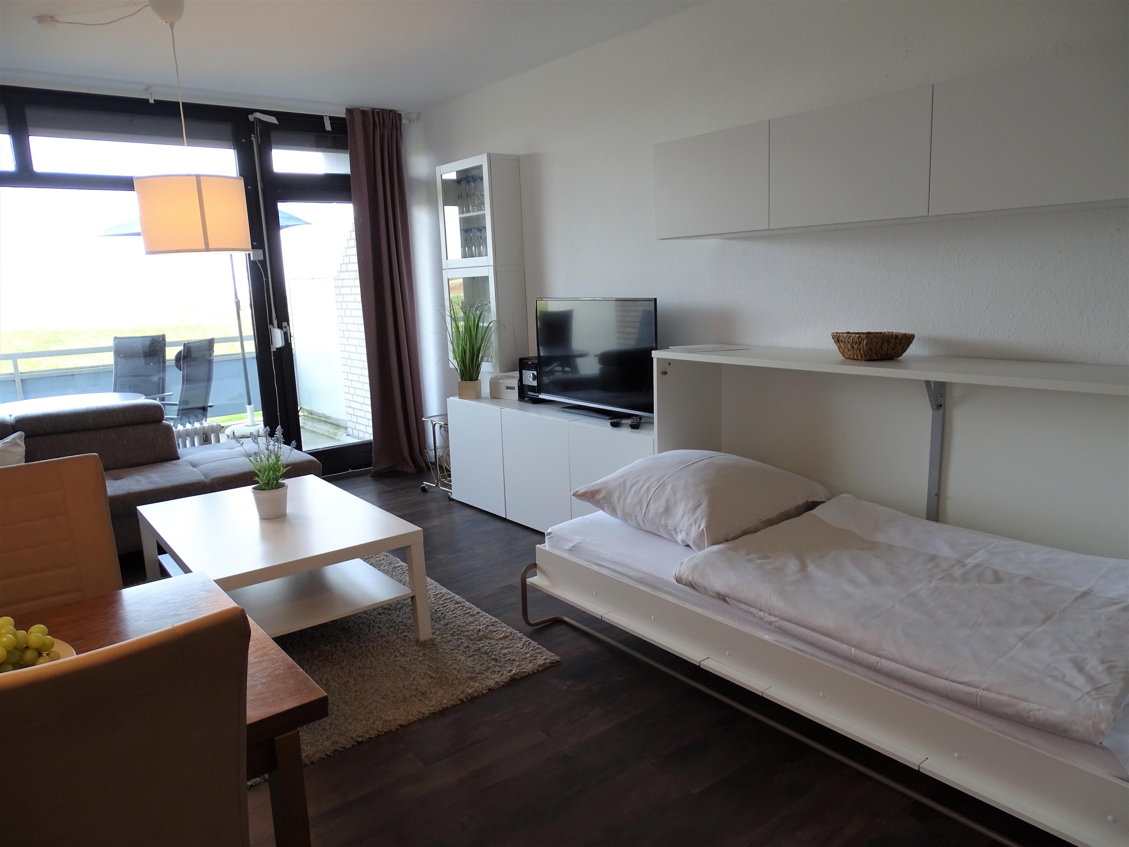 Das Appartement befindet sich in hervorragender Lage, direkt am Deich. Es ist aufgeteilt in Flur mit Garderobe, einem separatem Schlafzimmer mit Doppelbett (180x200cm) mit Kleiderschrank und 2. TV , einem Duschbad und einem Wohn/-Koch und Schlafbereich im Wohnzimmer. Hier befindet sich eine Küchenzeile, ein modernes Ecksofa und -1- seitlich ausklappbares Einzelschrankbett. Der möblierte Balkon ist gen Südosten ausgerichtet. Ein direkt am Gebäude überdachter offener Kfz- Garagenstellplatz gehört zum Objekt. Bettwäsche und Handtücher können für den Aufentahlt beim Vermittlungsbüro Wandelt -Strandurlaub Dahme- dazu gebucht werden...