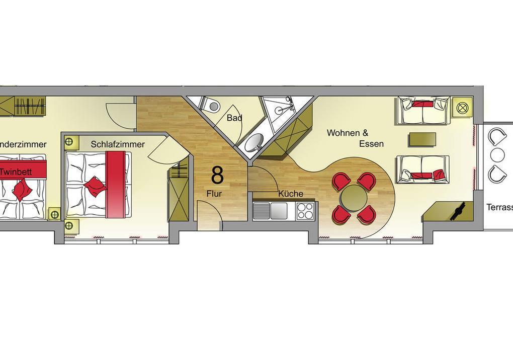 Die Wohnung verfügt über einen sehr schönen und geschmackvoll eingerichteter Wohnraum mit integrierter Küche und Zugang zur Terrasse, einen separaten Schlafraum mit einem Doppelbett (2x90x200cm), einen separaten Schlafraum mit 2 getrennten Einzelbetten (je 90x200cm) und ein helles Badezimmer mit bodentiefer Dusche. Kein Strandwetter? Das macht doch nichts - ein moderner Flatscreen -TV sorgt auch an Regentagen für Unterhaltung. Der Urlaub kann kommen!