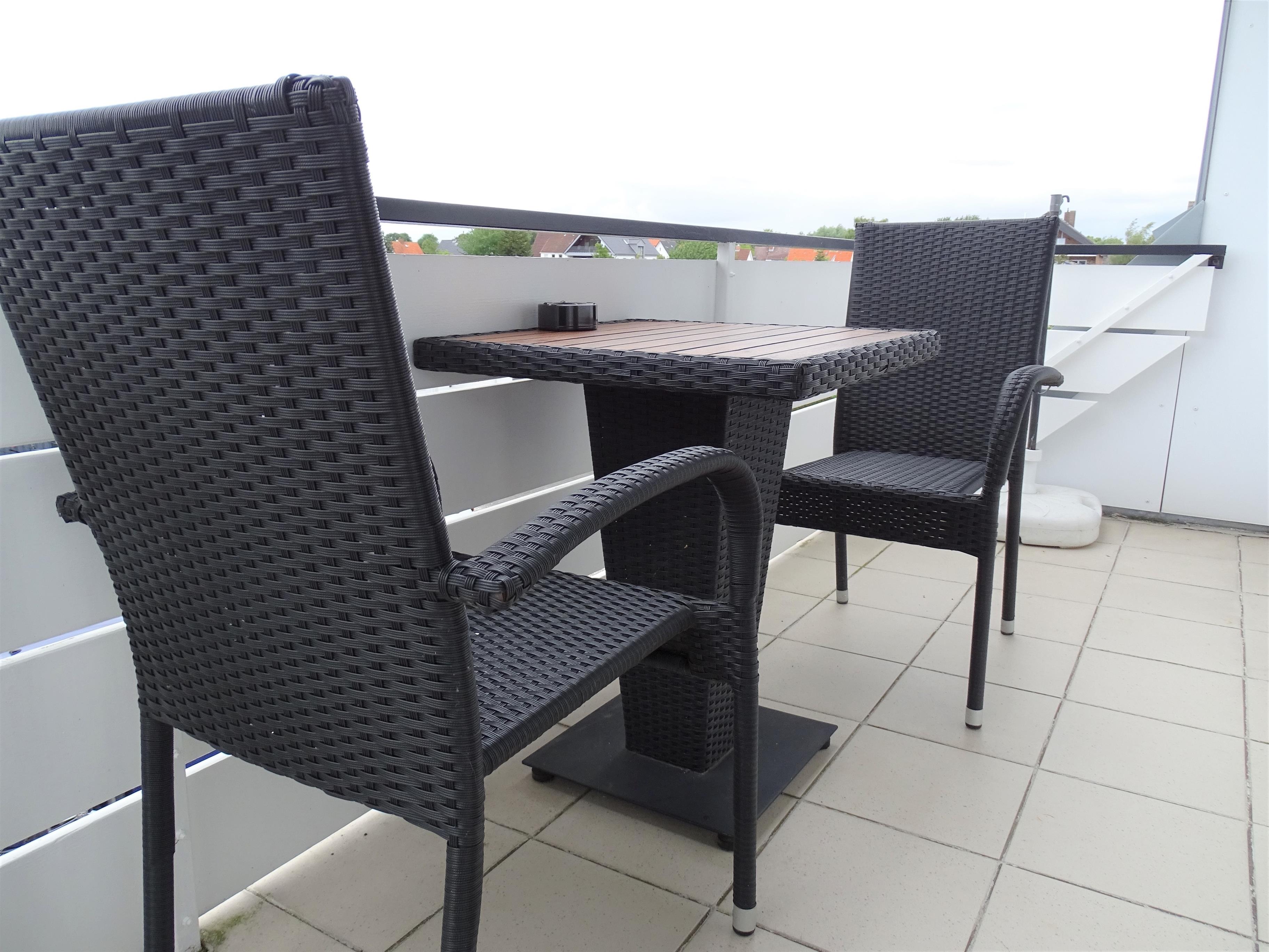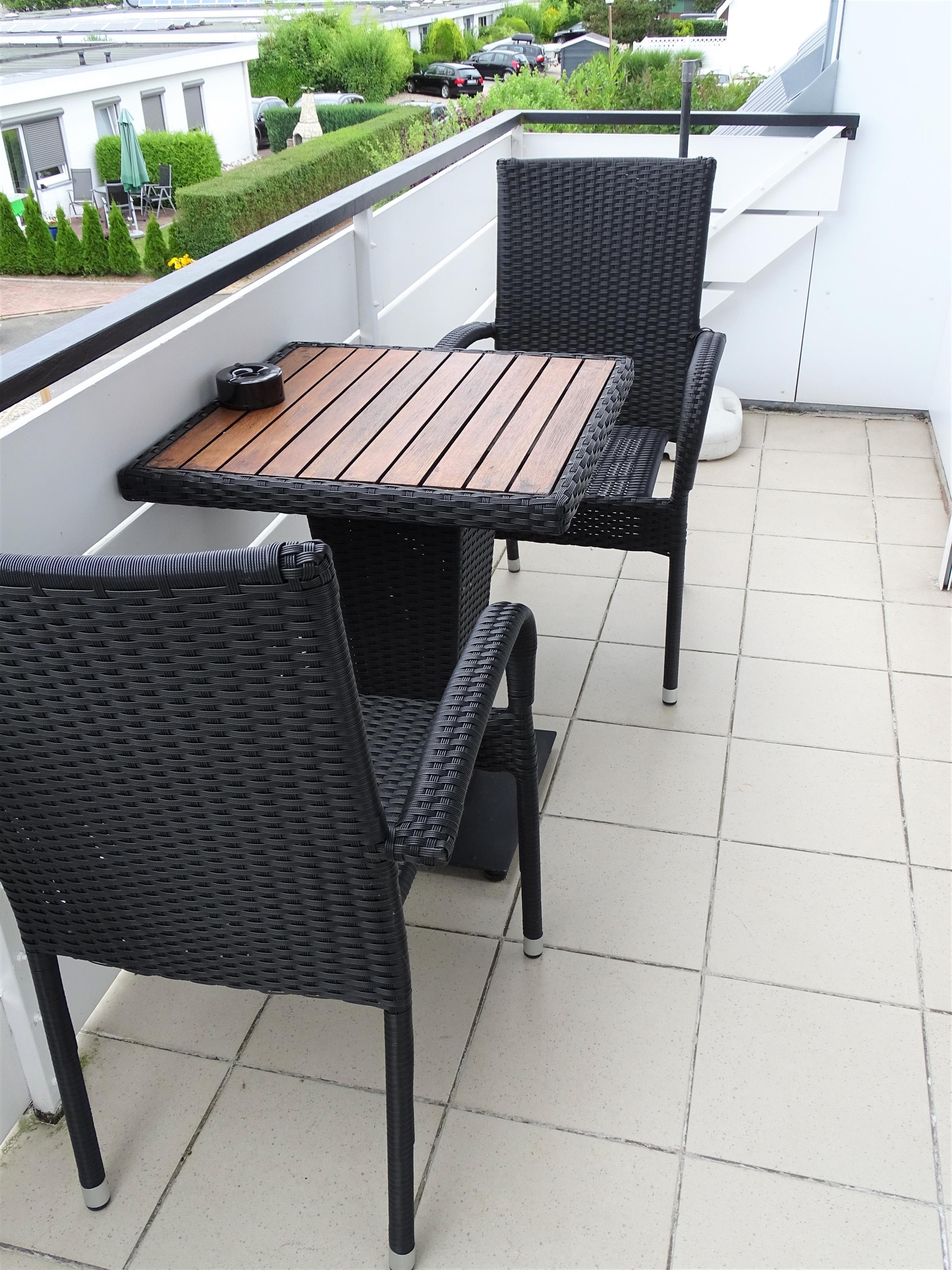 - Balkon nach Südwest (mit Abendsonne und Blick auf den Naherholungswald), Balkonmöbel
