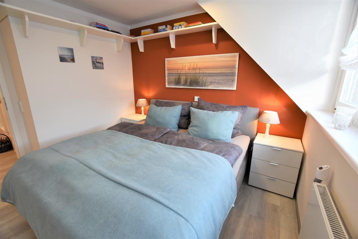 1.OG: Über die Treppe im Flur gelangen Sie in die obere Etage, wo sich die beiden Schlafzimmer befinden. Geruhsame Nächte verbringen sie im kuscheligen Boxspringbett (180x200 cm), ihre Urlaubsgarderobe können sie im geräumigen Kleiderschrank verstauen. Das zweite Schlafzimmer ist mit einem praktischen Schlafsofa (ca, 150x200 cm) ausgestattet. Beide Räume lassen sich durch Außenjalousien angenehm abdunkeln.
