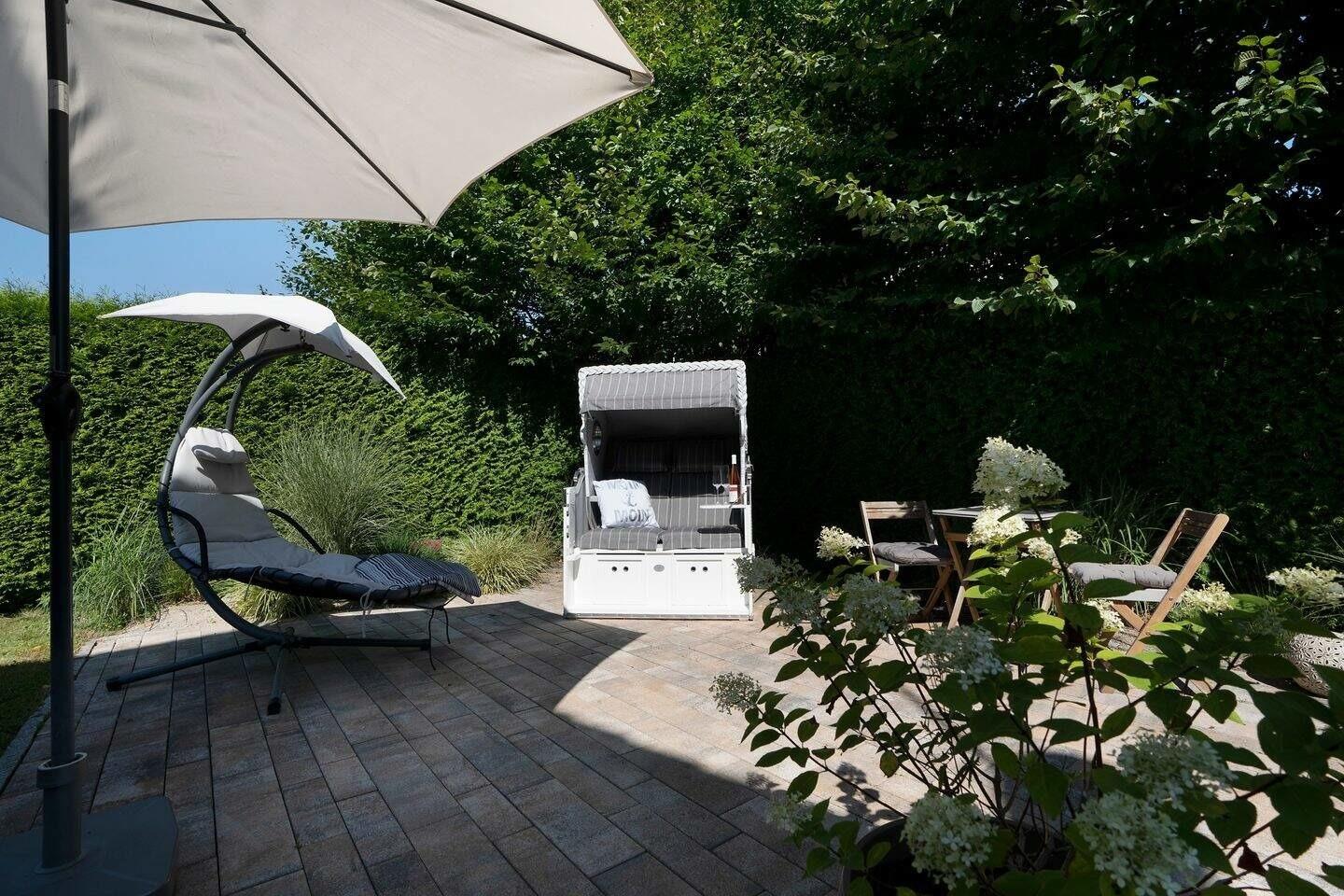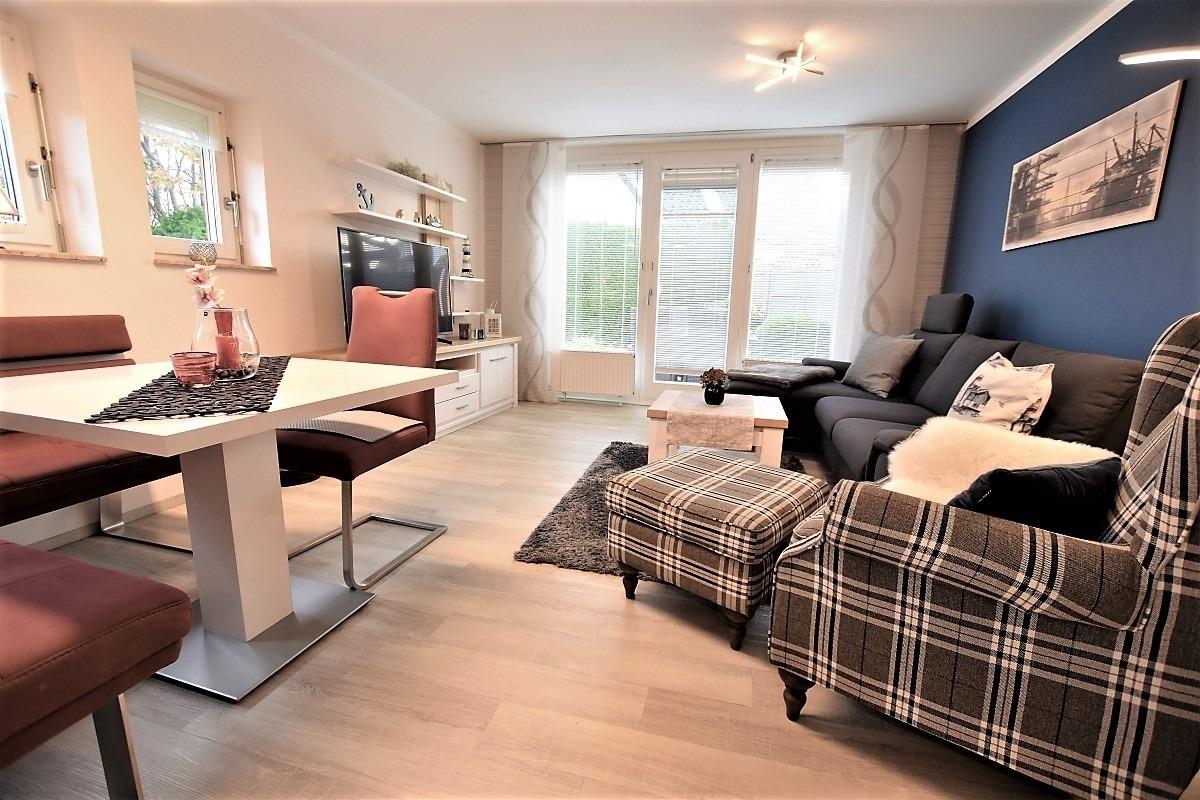 Vom Flur aus gelangen Sie geradezu in den modernen Wohnbereich, wo Sie es sich vor dem Fernseher auf der Couch oder dem Sessel gemütlich machen können. Am angrenzenden Esstisch finden bequem 3 Personen zum Essen oder Spielen Platz. Vom Wohnzimmer aus gelangen Sie auch auf die sichtgeschützte Terrasse, die mit Strandkorb und Gartenmöbeln ausgestattet ist und zu traumhaften Stunden im Freien einlädt. Ihre Mahlzeiten können Sie in der voll ausgestatteten Küche zubereiten, hier fehlt es wirklich an nichts und Kaffeeliebhaber können sich sogar auf eine Nespresso-Maschine freuen.
