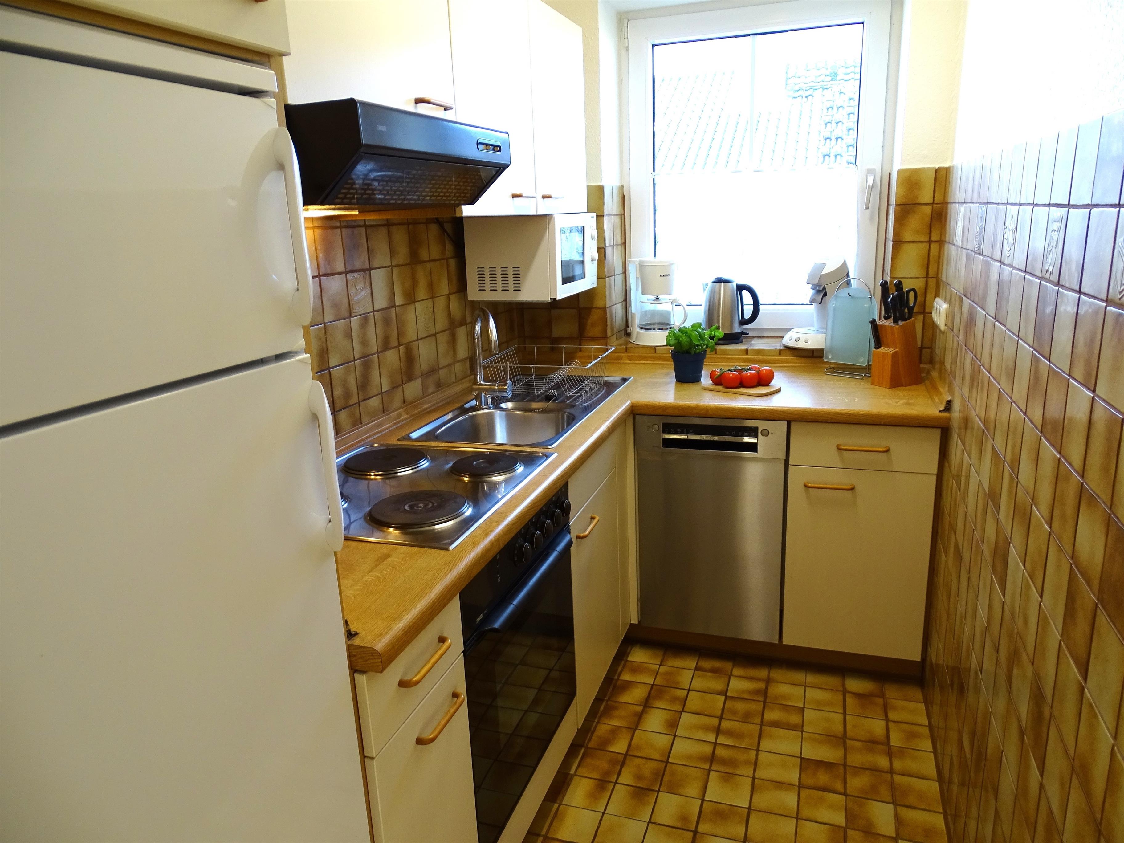 - voll eingerichtete Einbauküche mit Kühlschrank, Geschirr, 4-Plattenherd mit Backofen, Spülmaschine, Toaster, Kaffemaschine usw.