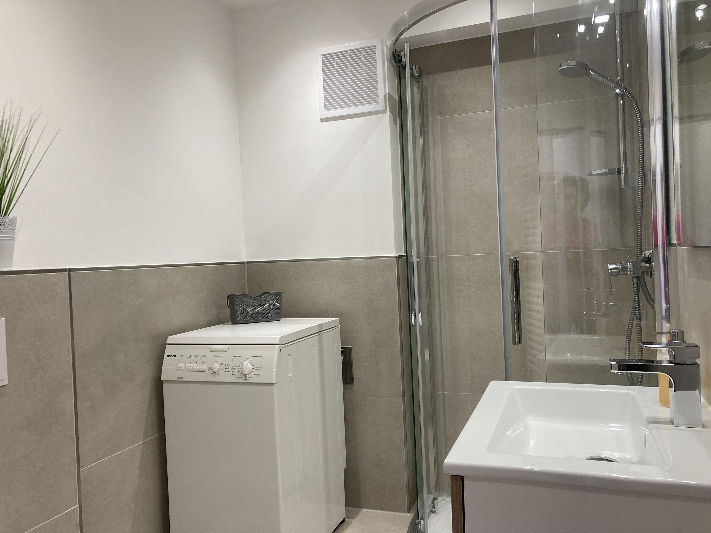 - Badezimmer mit Dusche, WC und Waschmaschine