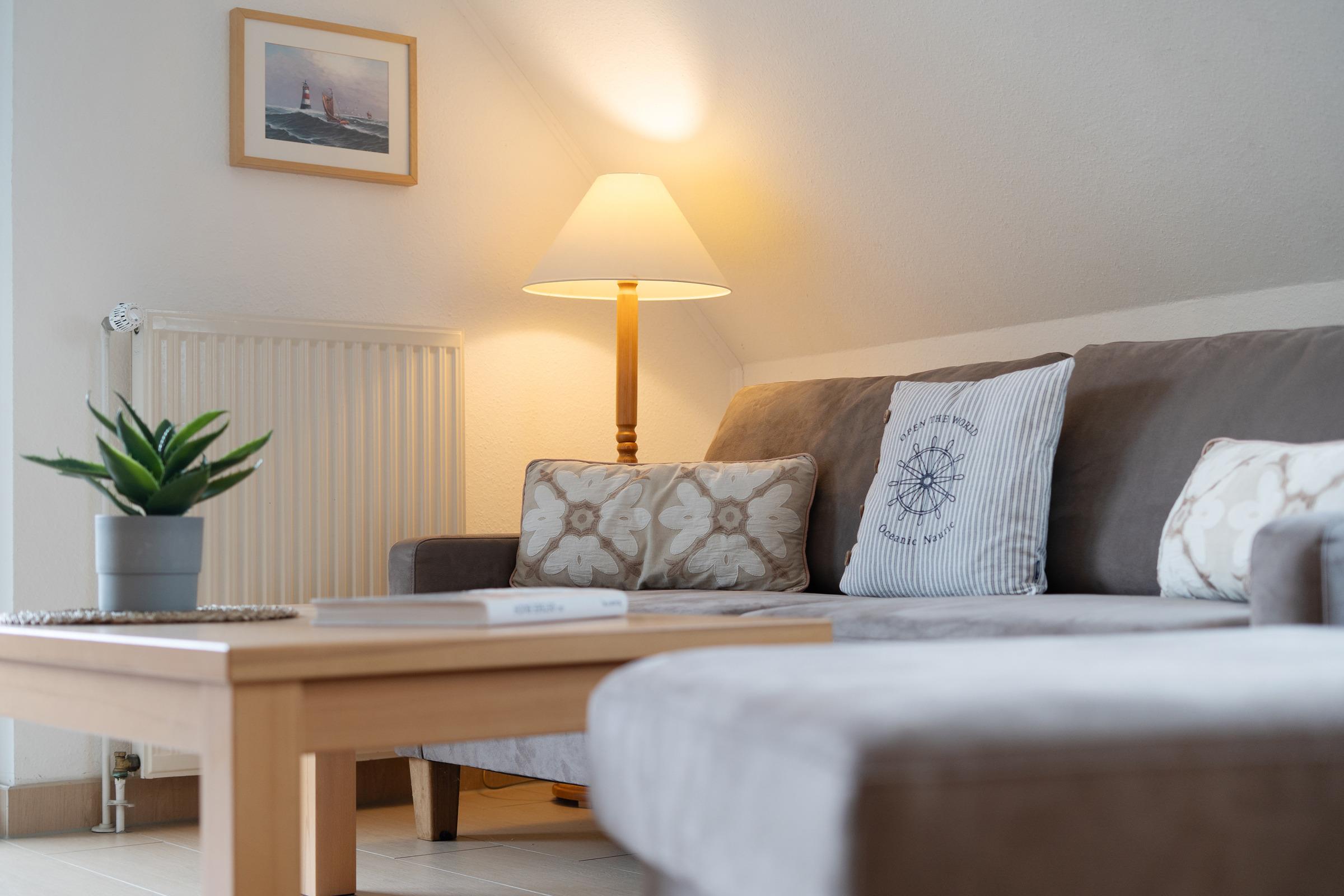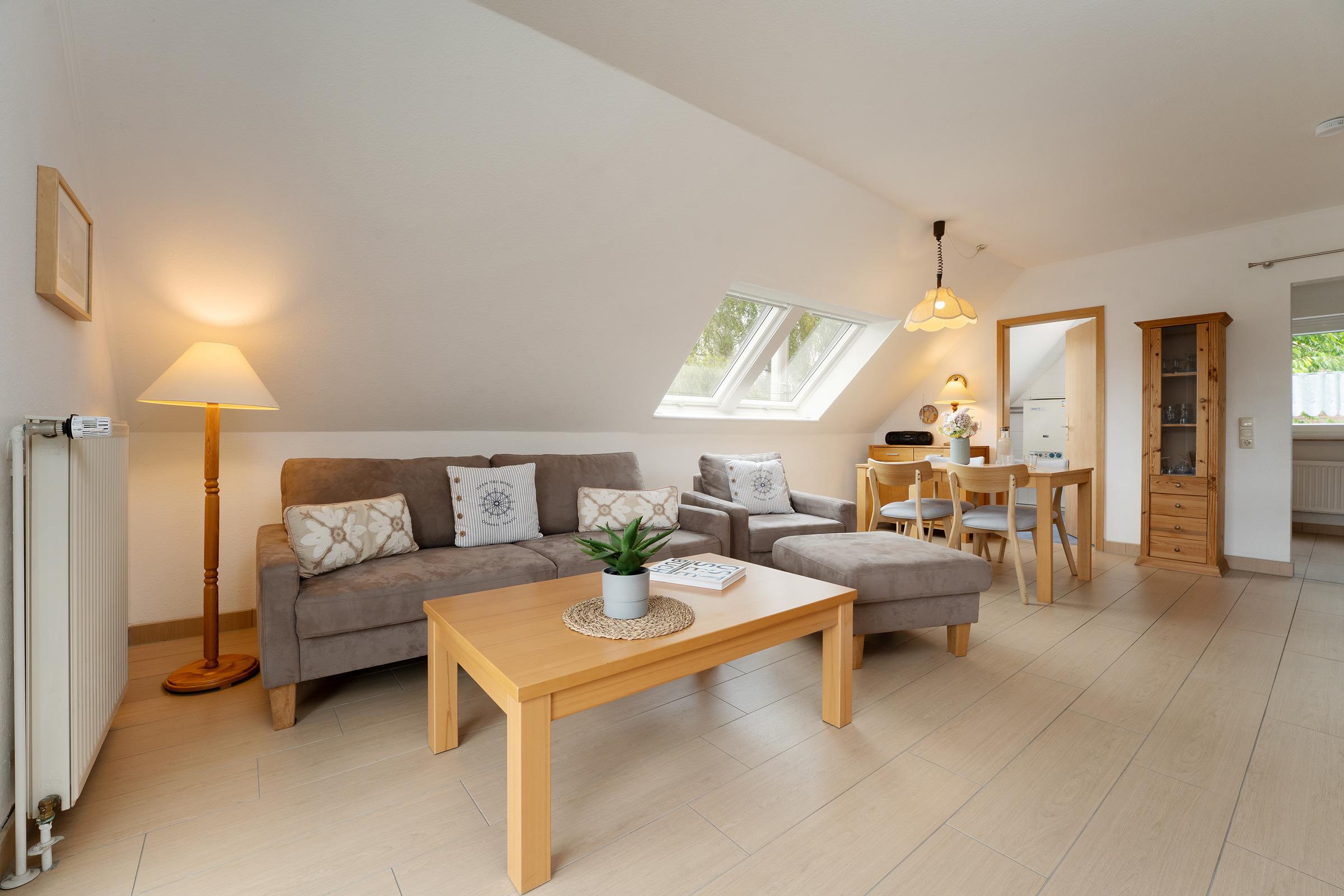 Der Wohn-/Essbereich mit offener Küche lädt zum gemeinsamen Essen, Fernsehen und erholsamen Urlaubsstunden ein. In der offenen voll ausgestatteten Küche finden Sie alles, um sich und Ihre Lieben kulinarisch zu verwöhnen. Die Ferienwohnung ist mit einem separaten Schlafzimmer mit Doppelbett (180x200 cm), einem Schlafzimmer mit 2 Einzelbetten (je 90x200 cm) und einem bequemen Schlafsofa (140x200 cm) im Wohnbereich ausgestattet. Das hell geflieste Badezimmer mit Dusche rundet das Angebot dieser Ferienwohnung ab.