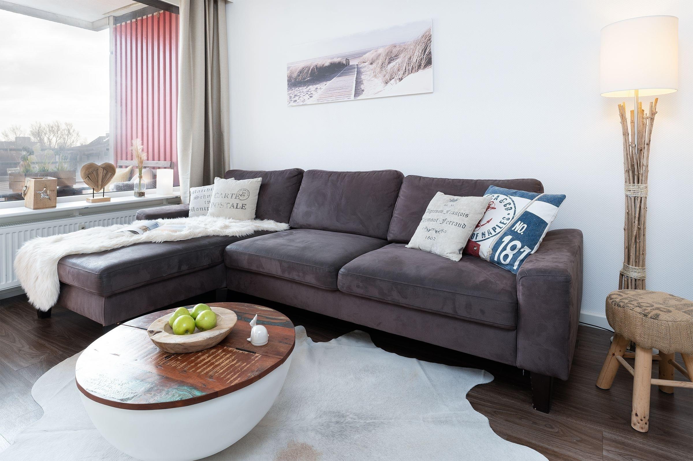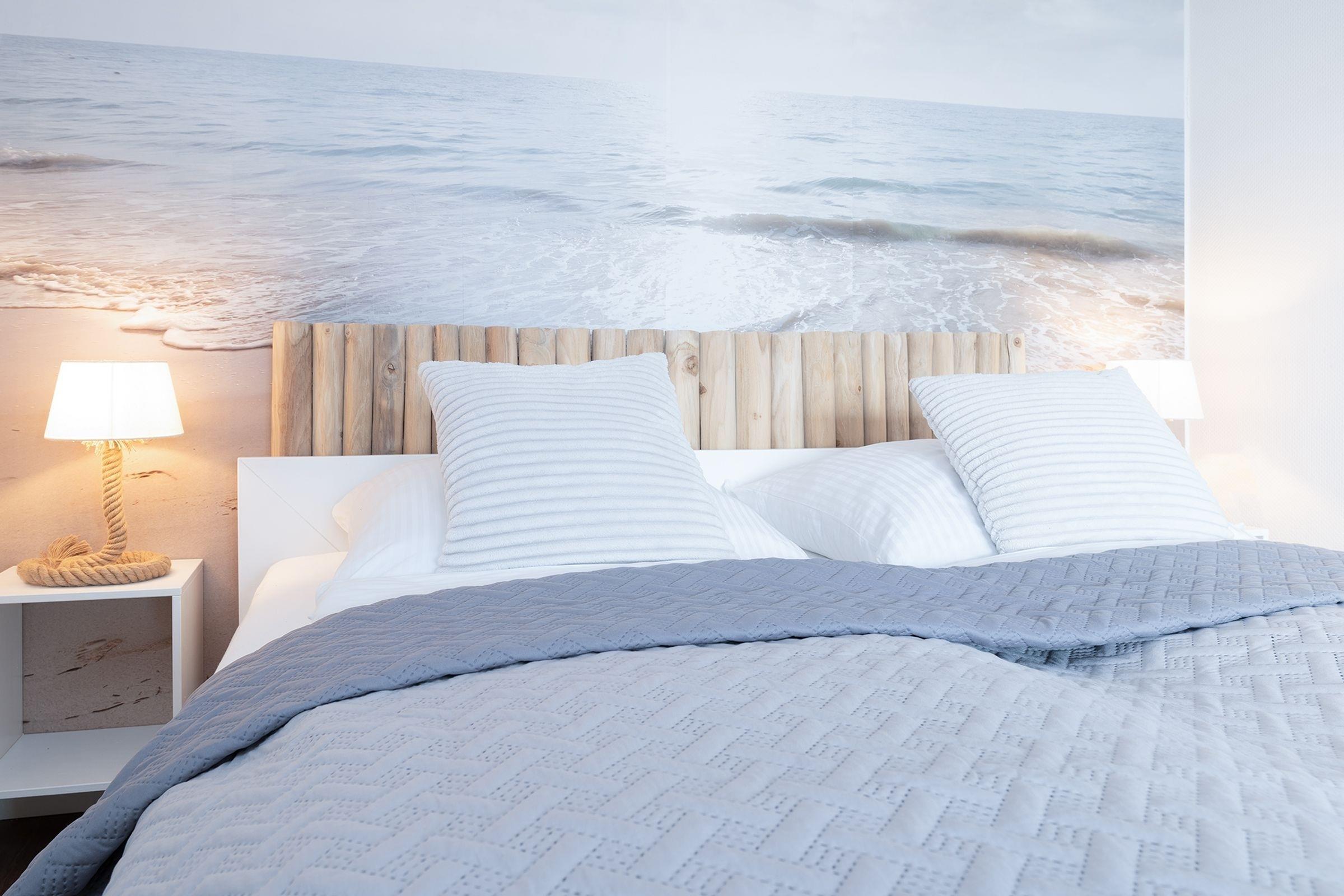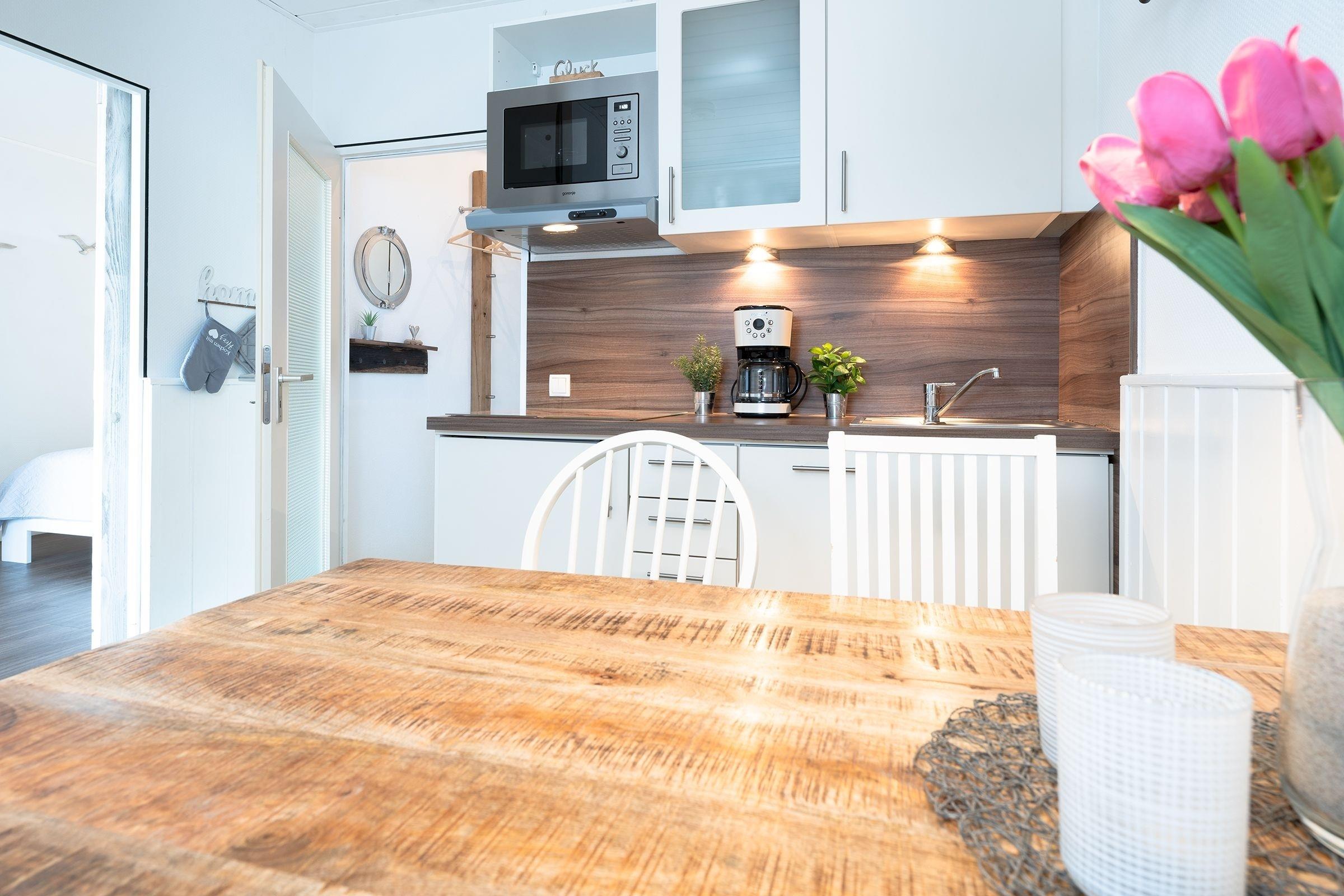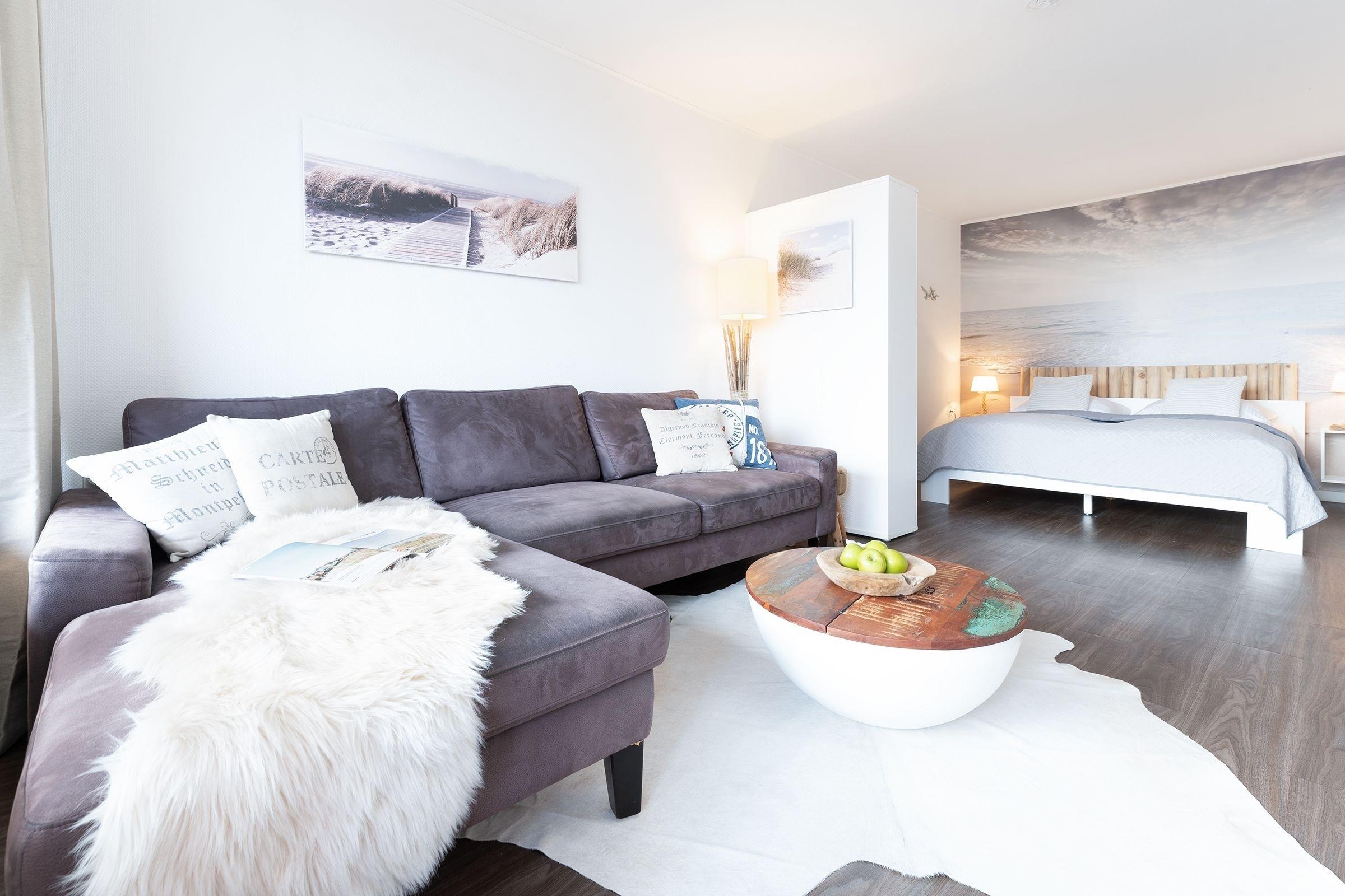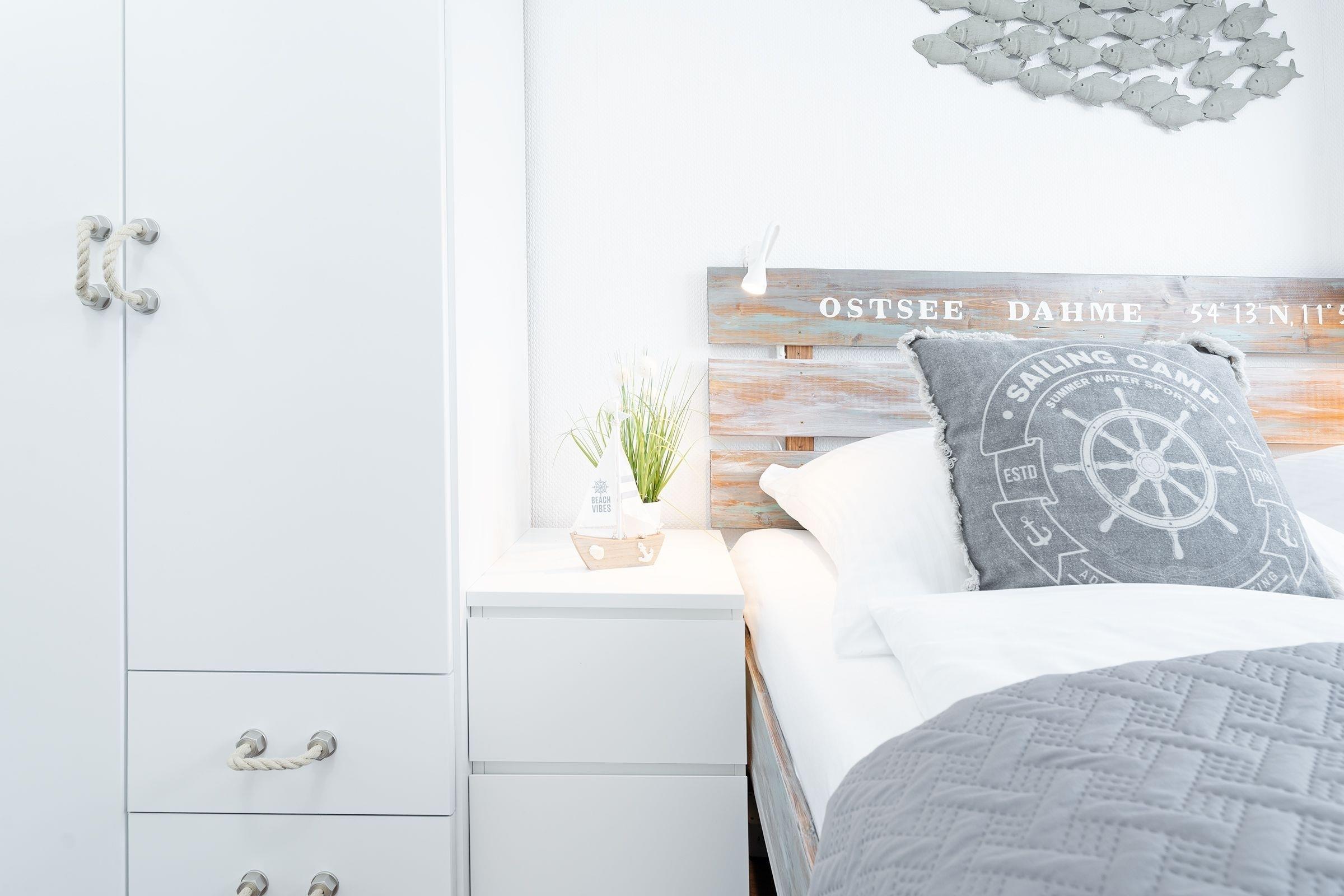 Der stilsichere Wohn- und Schlafbereich überzeugt in maritimem Design. Kuscheln Sie sich auf das großzügige Sofa und lassen Sie den Abend vor dem Smart-TV mit Soundbar bei einem spannenden Film ausklingen. Auf dem überdachten Balkon lässt es sich bei Sonnenschein, aber auch bei etwas frischeren Temperaturen gut aushalten. Der Schlafbereich ist charmant durch einen Eckkleiderschrank abgetrennt - hier können Sie sich nach einem langen Tag an der frischen Ostseeluft entspannt in das hochwertige Doppelbett (ca. 2x 90x200cm) kuscheln. Im separaten, kleinen Schlafzimmer wartet ein weiteres Doppelbett (2x 80x200 cm), ein Kleiderschrank sowie ein eigener TV auf Sie. Die Wohnung verfügt über ein Vollbad und eine gut ausgestattete Einbauküche mit modernsten Geräten inklusive Geschirrspüler, Heißluftfriteuse und 4-Platten-Cerankochfeld.