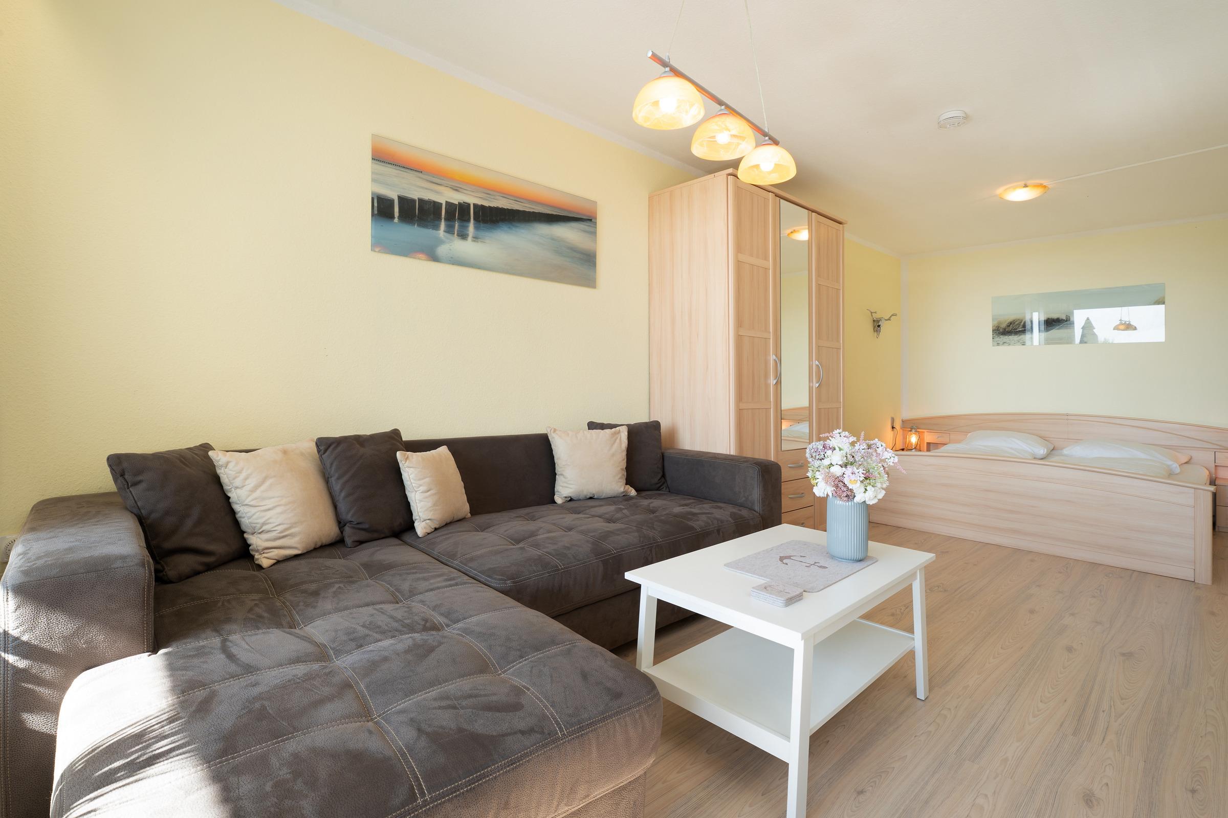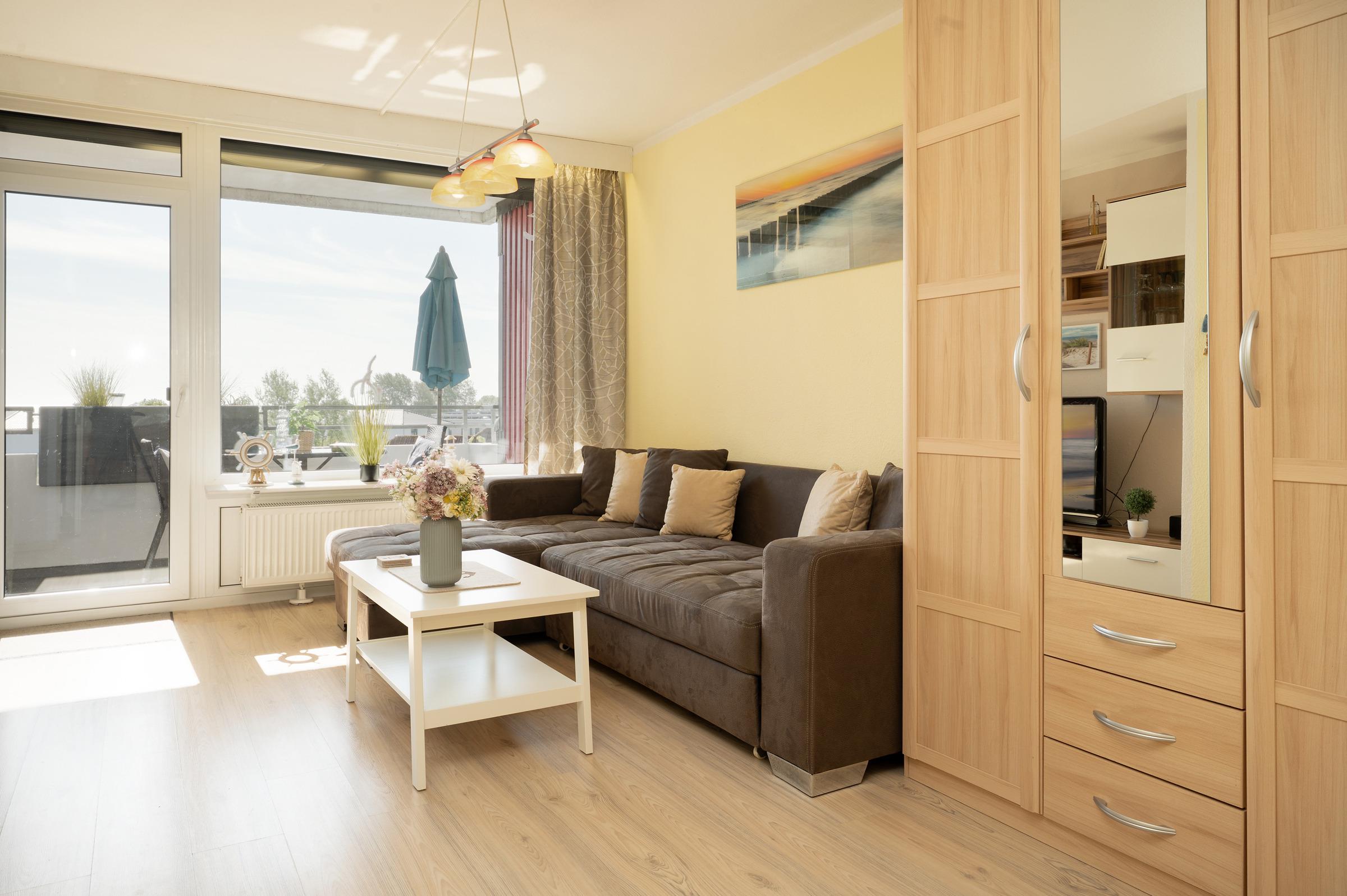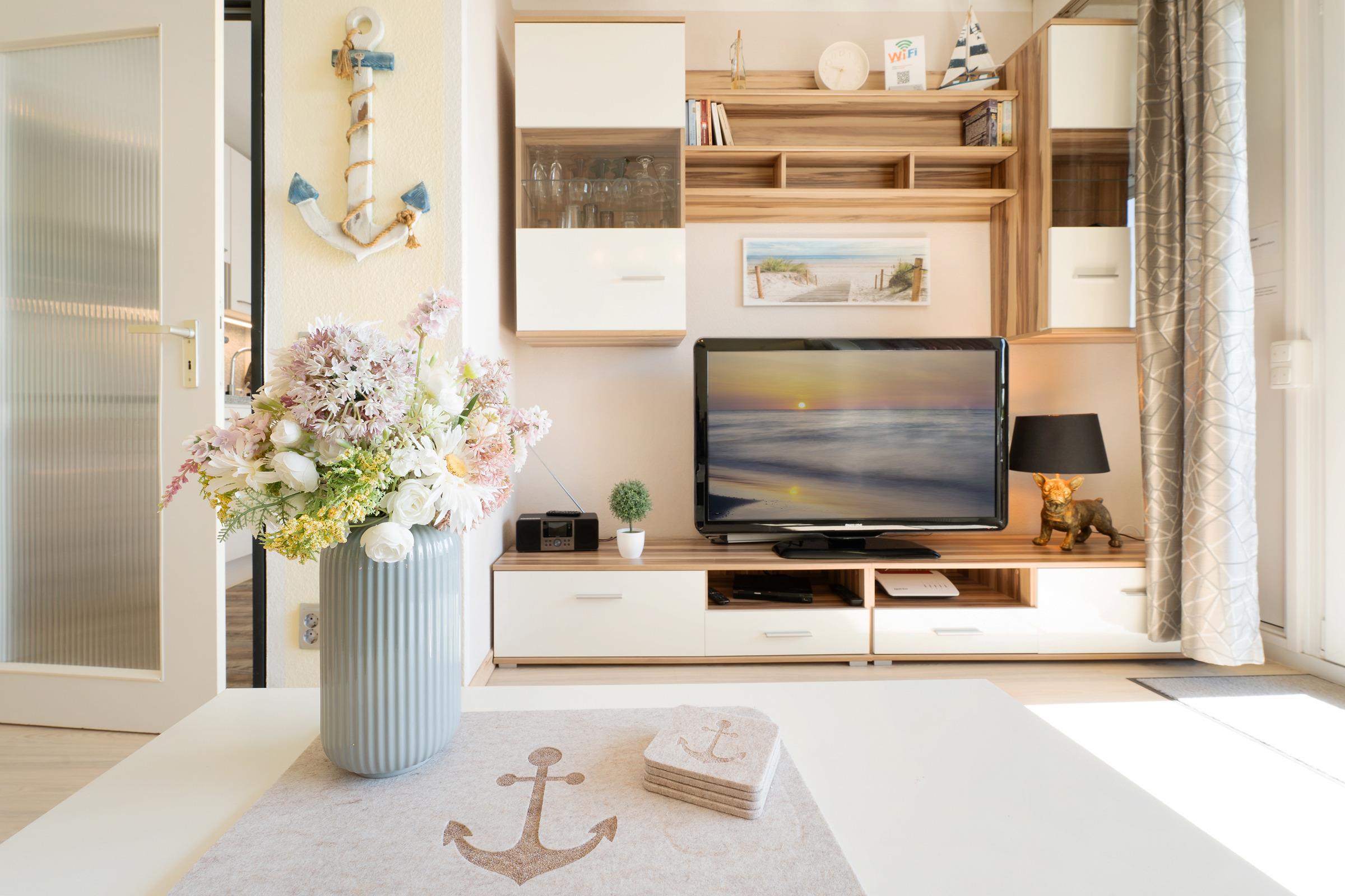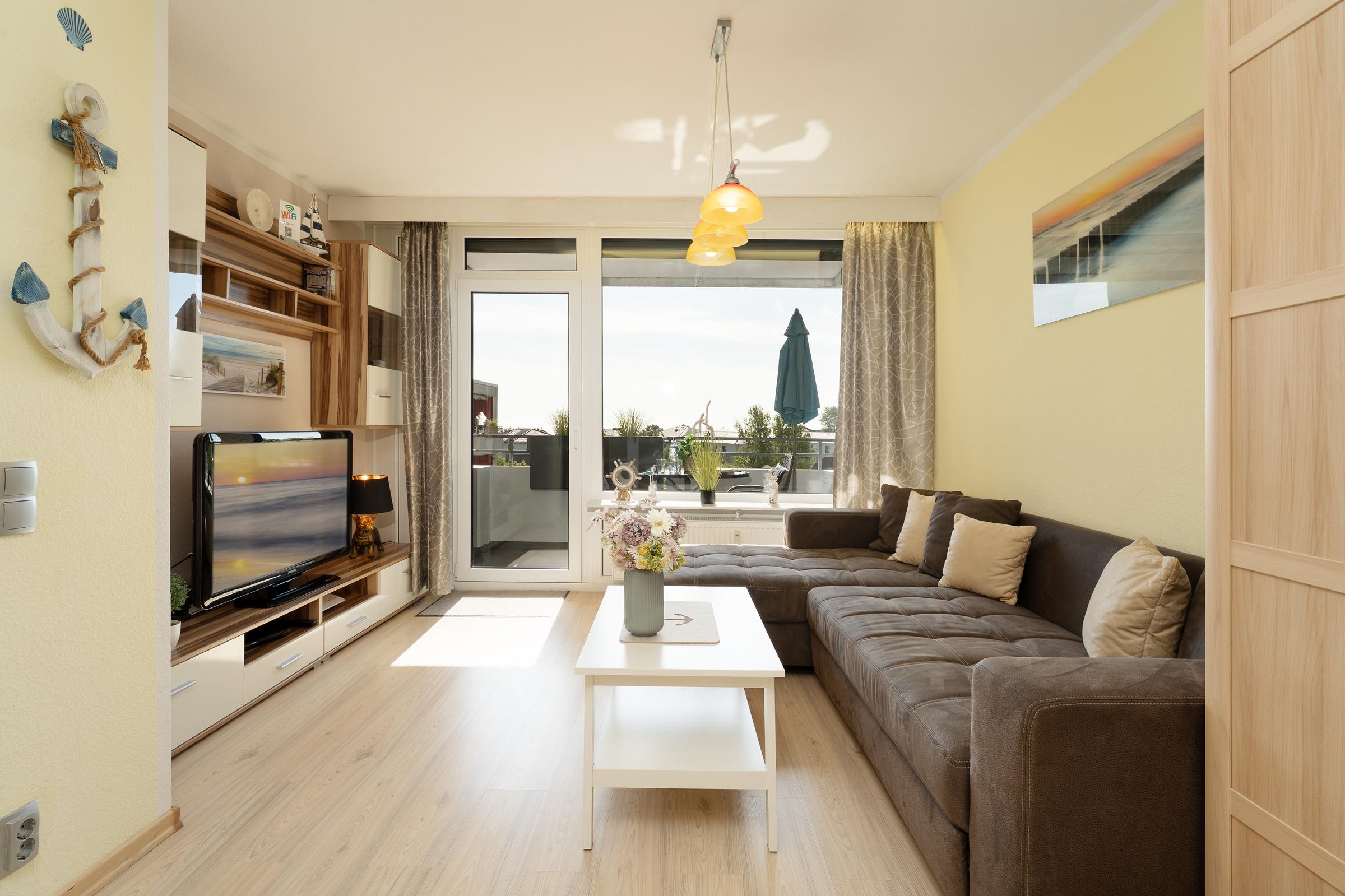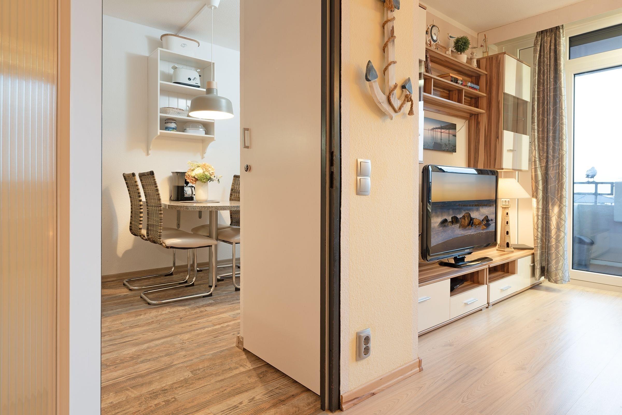 Die Wohnung bietet Ihnen einen kombinierten Wohn- und Schlafraum mit einem hochwertigem Doppelbett (2x 90x200 cm), einem ausziehbaren Ecksofa sowie direktem Zugang zum Balkon mit eingeschränktem Ostsee-Fernblick. Ihre Urlaubsgarderobe können Sie im Kleiderschrank verstauen. Das separate Schlafzimmer ist mit einem Auziehbett (2x 80x200 cm) und einem zweitem Fernseher ausgestattet. In der modernen Küche sind Annehmlichkeiten wie z. B. ein Backofen in praktischer Arbeitshöhe, ein Geschirrspüler, ein 2-Platten-Kochfeld sowie ein gemütlicher Esstisch für 4 Personen vorhanden. Vom Flur aus gelangen Sie in das stilvolle Designbad mit ausreichend Ablagemöglichkeiten. Vom Balkon aus können Sie den Sonnenaufgang genießen. Der WLAN-Anschluss ist inklusive.