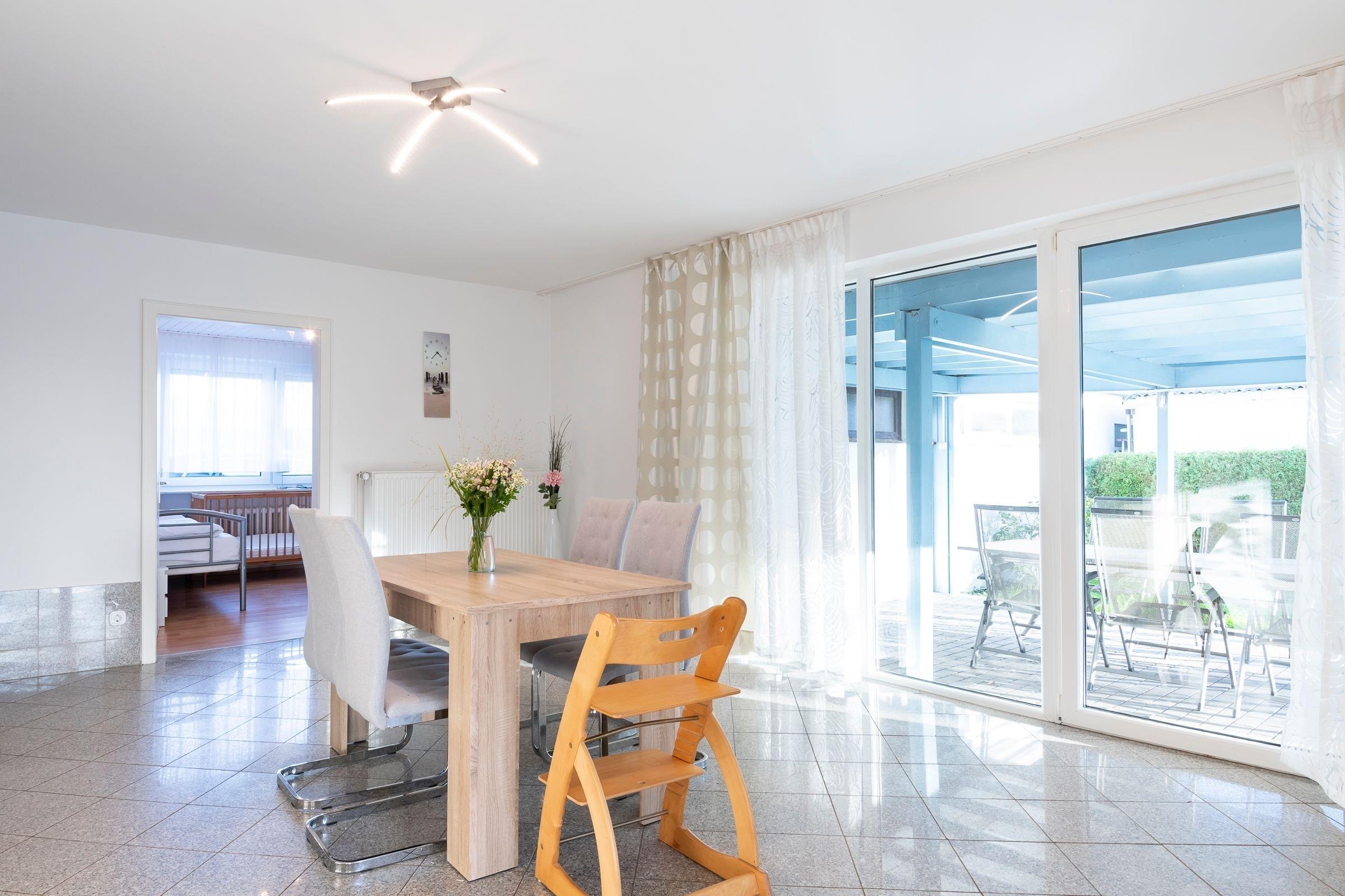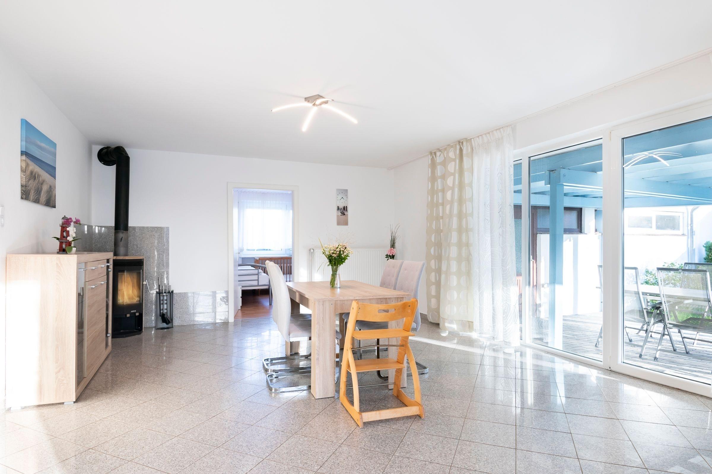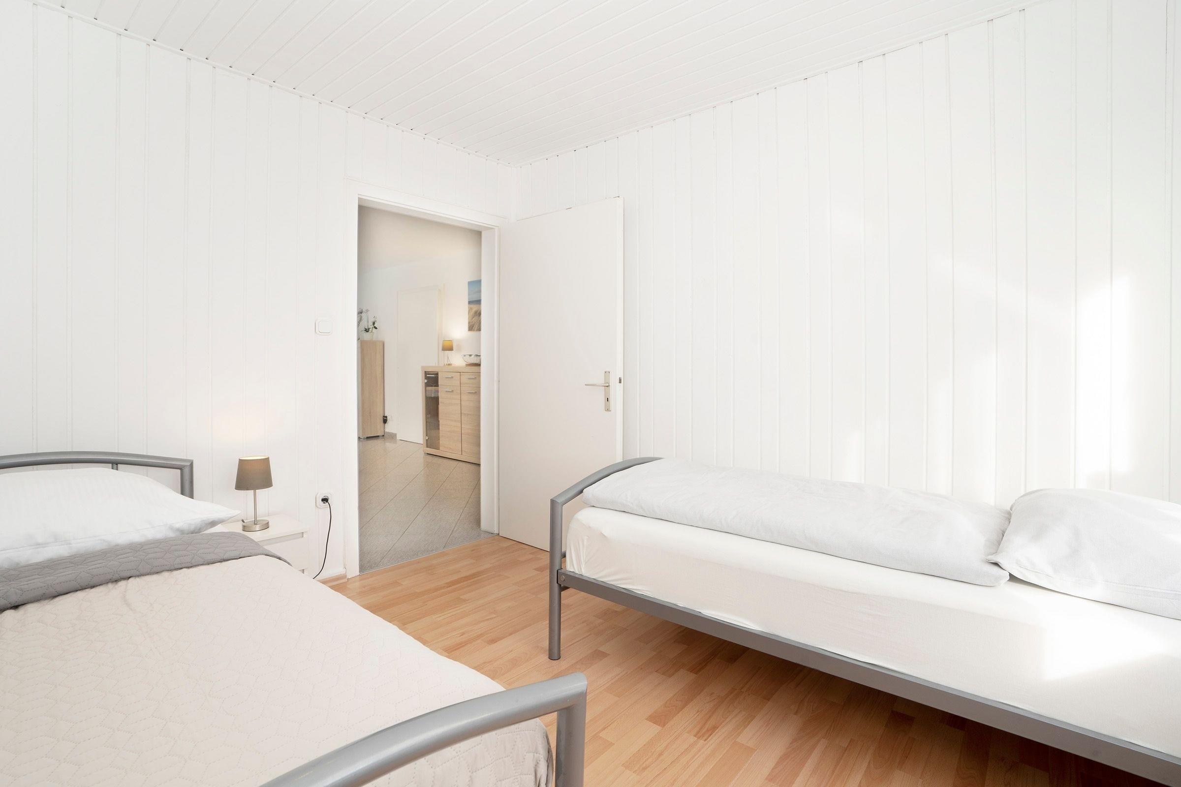 Der lichtdurchflutete Wohnraum ist offen gestaltet - ein Essplatz mit 4 wertigen Stühlen, sowie eine zusätzliche Bank, laden zu geselligen Runden ein und auf der lauschigen Sofalandschaft mit großem Flachbild-TV kann man es sich nach langen Strandtagen gemütlich machen. Von hier aus haben Sie direkten Zugang zum Garten und zwei eigenen Terrassen - eine große überdachte Terrasse und eine weitere mit einem Strandkorb in dem Sie die herrliche Abendsonne genießen können. Das Elternschlafzimmer ist mit komfortablem Doppelbett (2x 80x200 cm), Sideboard und 3-türigem Kleiderschrank ausgestattet, hier gibt es also reichlich Stauraum für Ihre Urlaubskleidung. Das zweite Schlafzimmer ist mit 2 Doppel-Stockbetten, Nachttischen und Leseleuchten eingerichtet, zusätzlich hat ein Kinderbett in diesem Zimmer Platz. Von diesem Schlafzimmer aus hat man Zugang zum großen Badezimmer mit Badewanne und Dusche. Beide Schlafzimmer lassen sich durch Außenrollläden abdunkeln. Die Ferienwohnung verfügt zudem über ein weiteres Badezimmer mit Dusche, WC und Wasch-Trockner. Die separate, gut ausgestattete, Küche verfügt über Annehmlichkeiten wie eine Senseo-Kaffeemaschine, eine Kühl-Gefrierkombination und eine Spülmaschine. Von der Küche führt ebenfalls eine Tür direkt in den Garten.