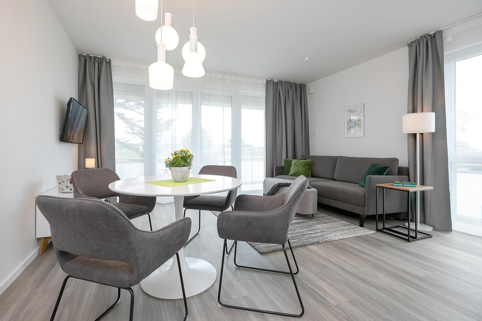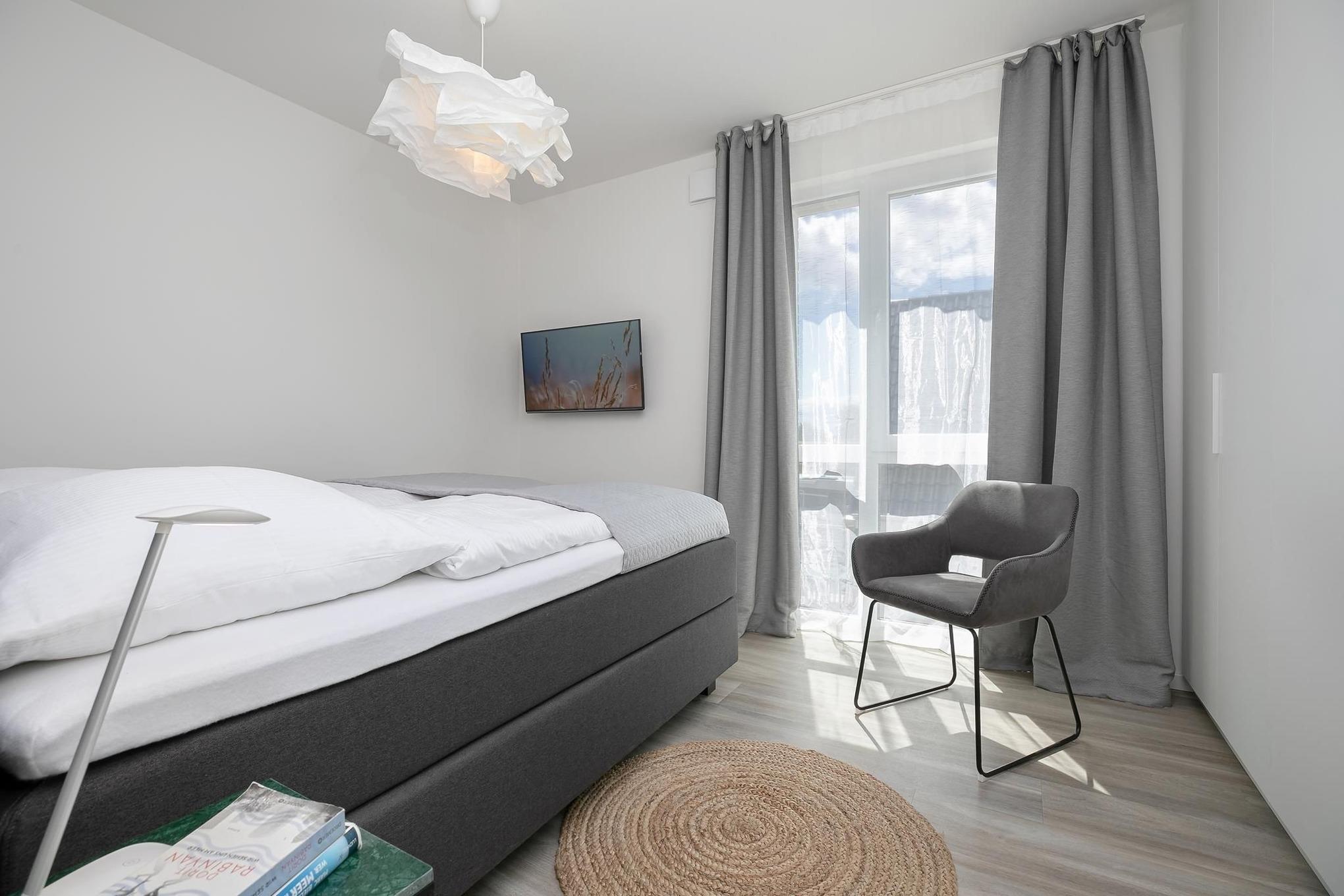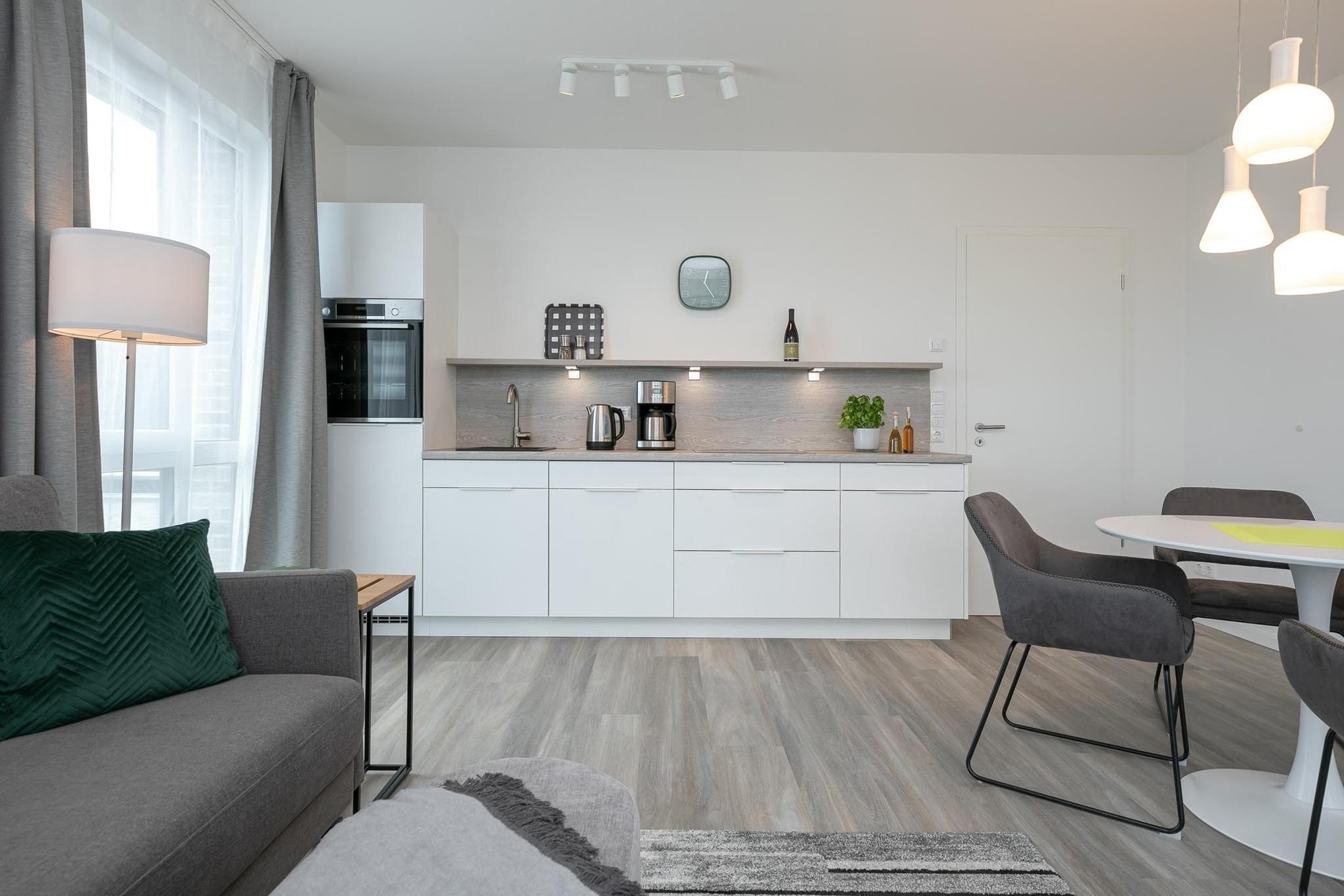 Treten Sie ein in den lichtdurchfluteten Wohnbereich, dem es mit gemütlicher Schlafcouch (160x200 cm), Esstisch und TV an nichts fehlt. Die helle & moderne Küchenzeile fügt sich hervorragend in den Raum ein. Sie bietet Ihnen die Möglichkeit, regionale Zutaten in köstliche Gerichte zu zaubern, die Sie auf dem angrenzenden Balkon genießen können, während Sie die letzten Sonnenstrahlen des Tages abfangen. Nach einem ausgiebigen Tag an der frischen Luft können Sie im separaten Schlafzimmer mit luxuriösem Boxspring-Doppelbett (160x200 cm, durchgehender Topper) und zweitem TV neue Energie tanken. Stilsicher ist die komplette Wohnung mit hellem Holzoptikboden ausgestattet, so auch im geräumigen und modernen Badezimmer mit komfortabler, bodentiefer Dusche und beheizbarem Handtuchhalter.
