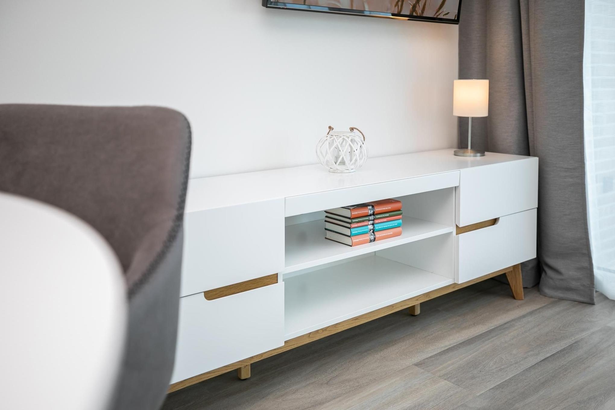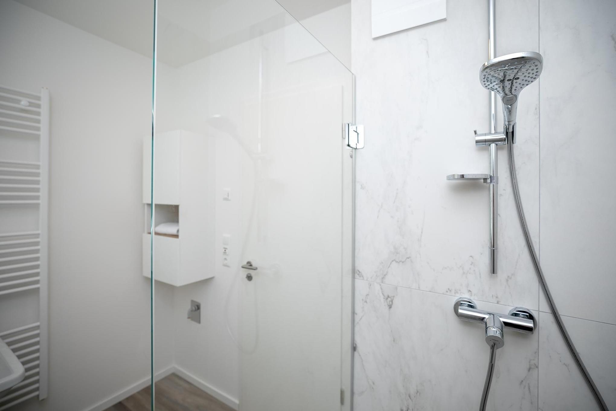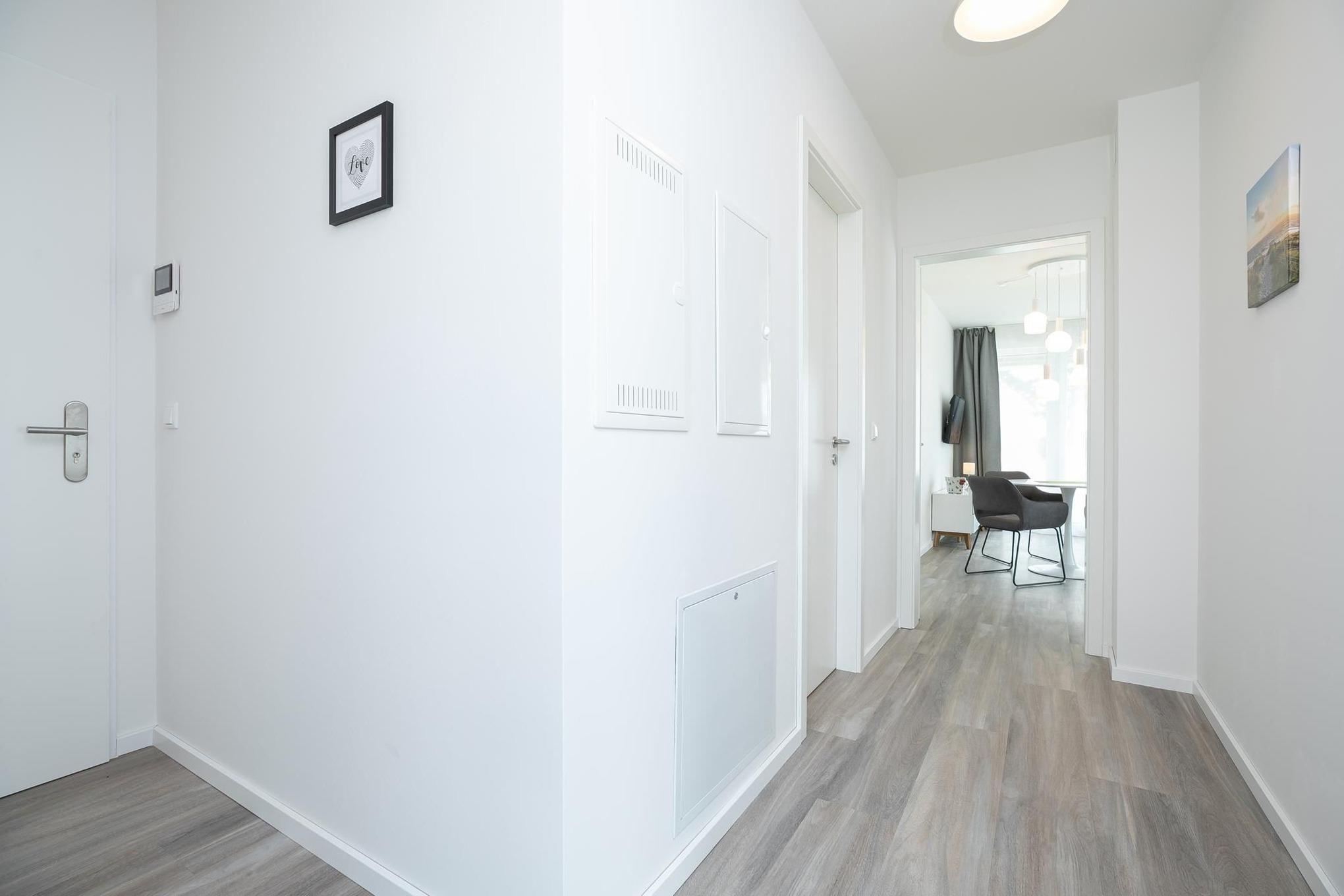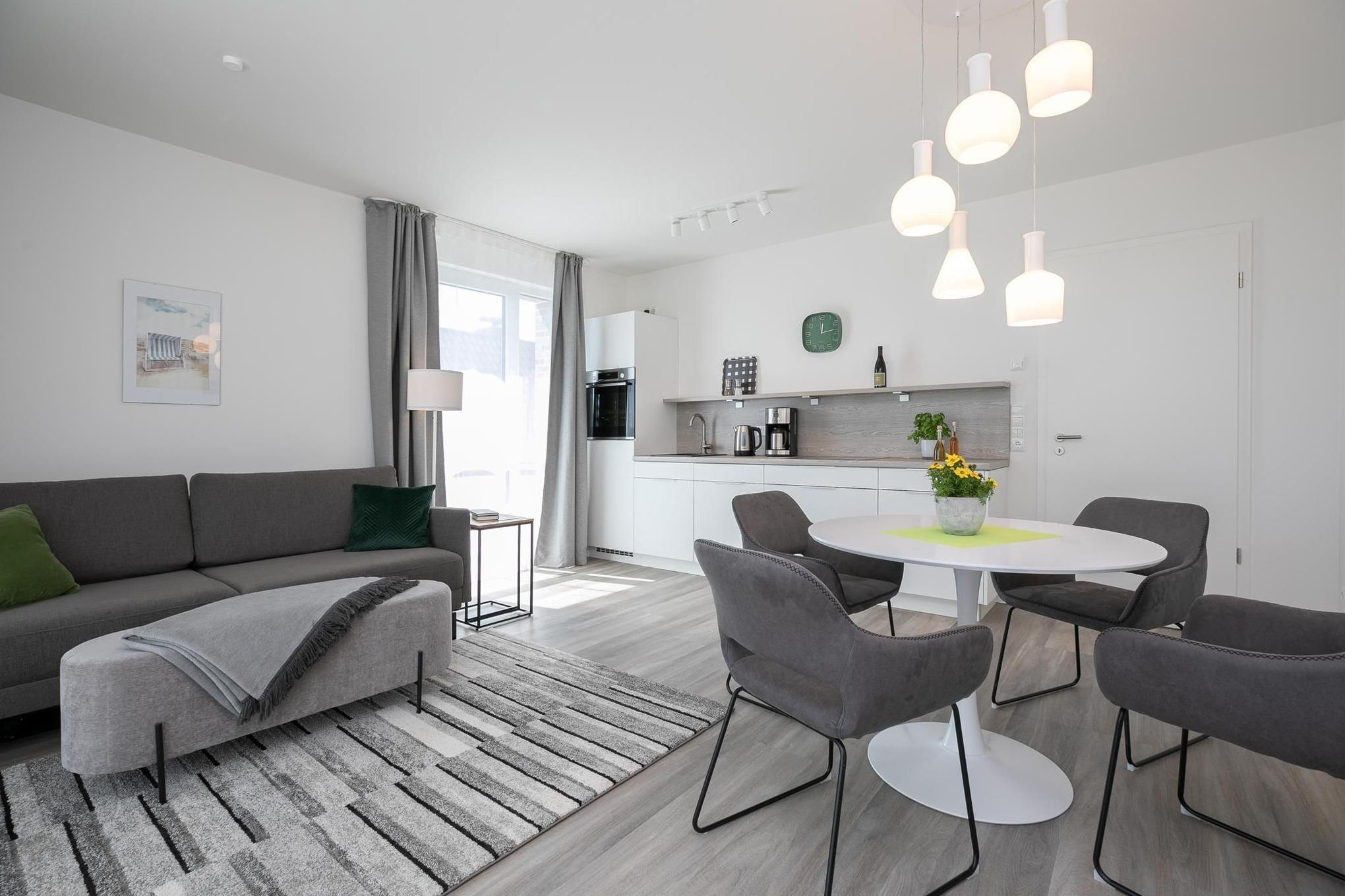 Treten Sie ein in den lichtdurchfluteten Wohnbereich, dem es mit gemütlicher Schlafcouch (160x200 cm), Esstisch und TV an nichts fehlt. Die helle & moderne Küchenzeile fügt sich hervorragend in den Raum ein. Sie bietet Ihnen die Möglichkeit, regionale Zutaten in köstliche Gerichte zu zaubern, die Sie auf dem angrenzenden Balkon genießen können, während Sie die letzten Sonnenstrahlen des Tages abfangen. Nach einem ausgiebigen Tag an der frischen Luft können Sie im separaten Schlafzimmer mit luxuriösem Boxspring-Doppelbett (160x200 cm, durchgehender Topper) und zweitem TV neue Energie tanken. Stilsicher ist die komplette Wohnung mit hellem Holzoptikboden ausgestattet, so auch im geräumigen und modernen Badezimmer mit komfortabler, bodentiefer Dusche und beheizbarem Handtuchhalter.