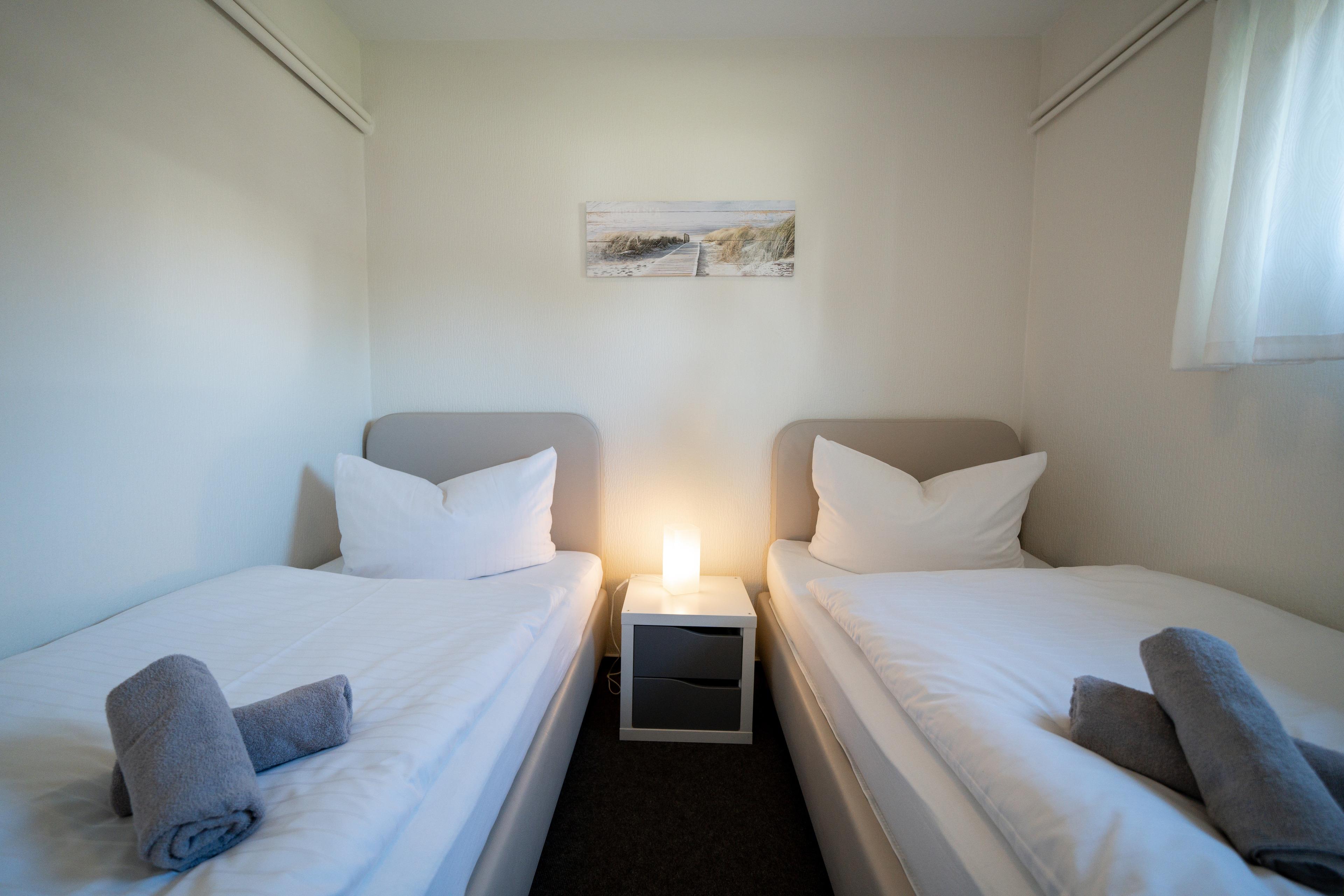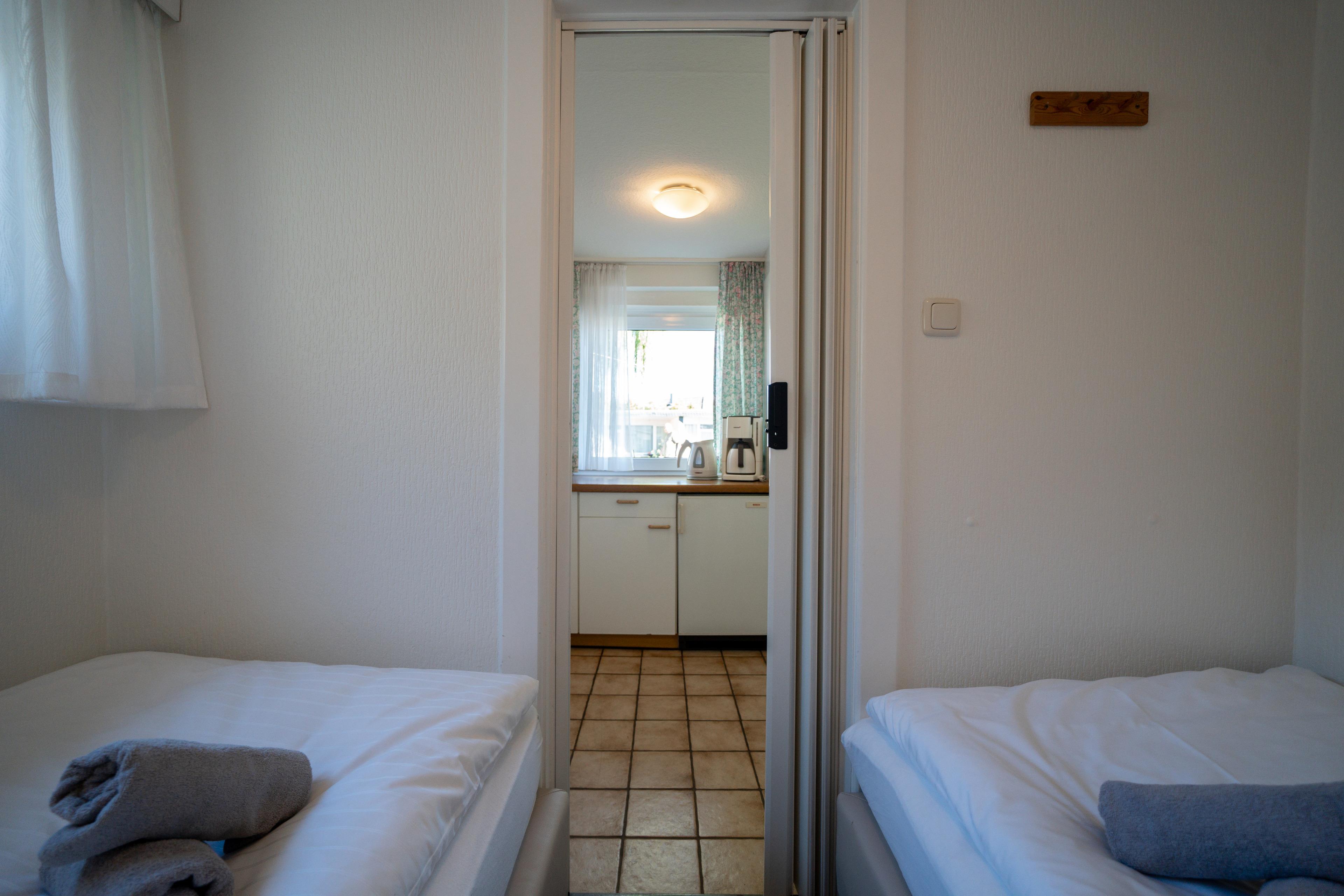 Der Bungalow verfügt über ein Schlafzimmer mit einem Einzelbett ( 90 x 200 cm ) und einem Schlafzimmer mit 2 Einzelbetten ( 90 x 200 cm ).