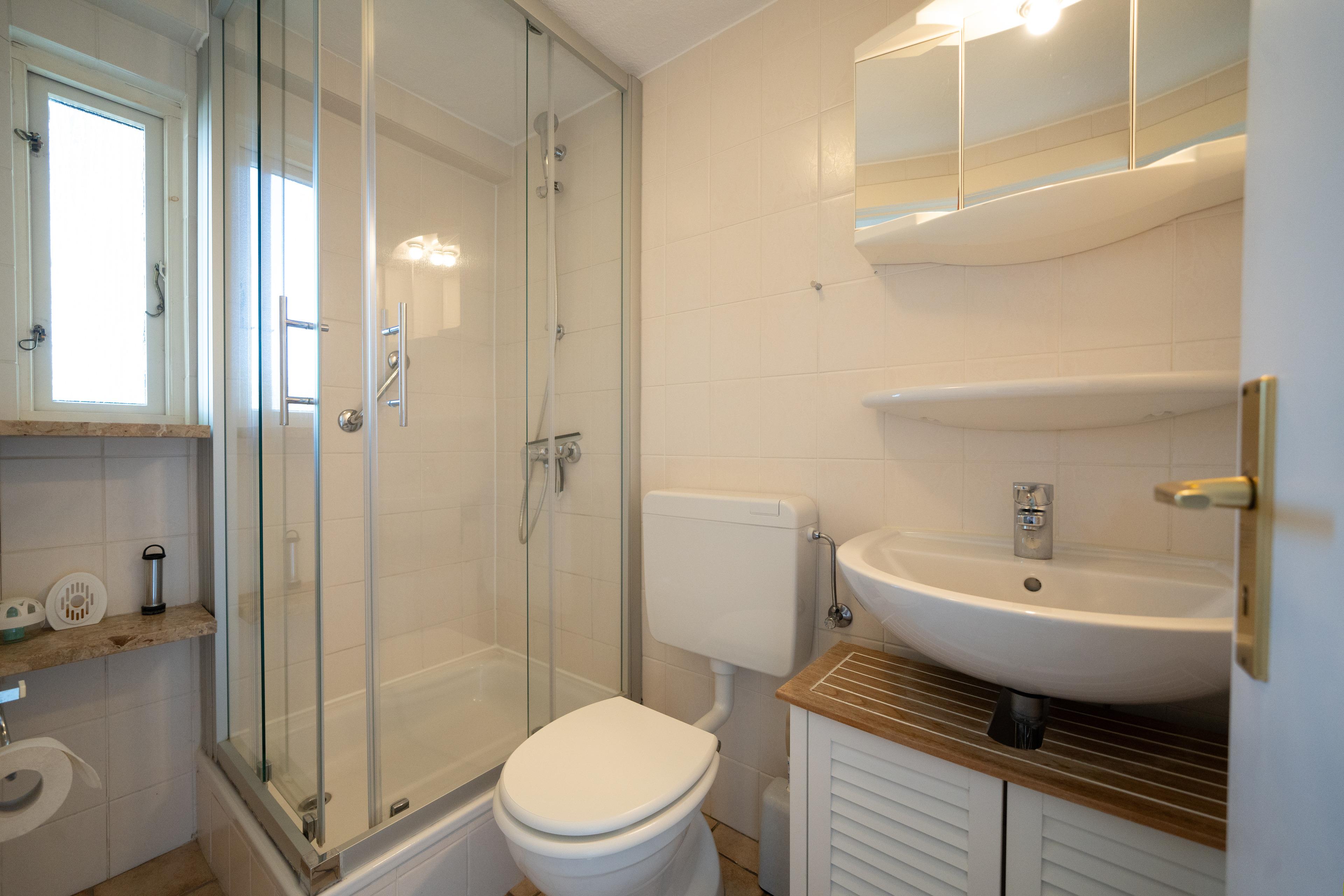 Das Badezimmer ist mit Dusche und WC ausgestattet.