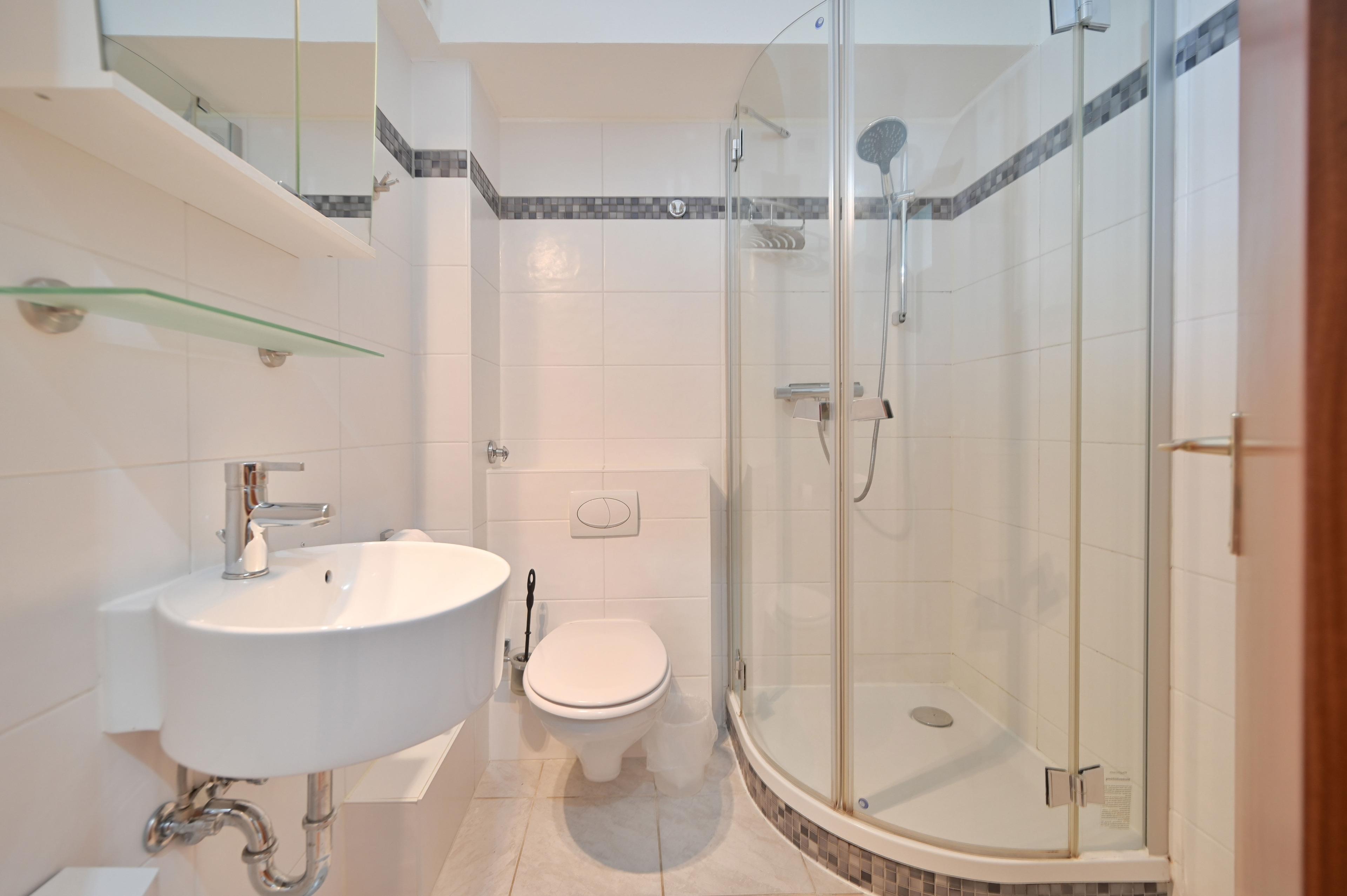 Das moderne, innenliegende Bad ist mit Dusche, WC und Waschtisch ausgestattet.