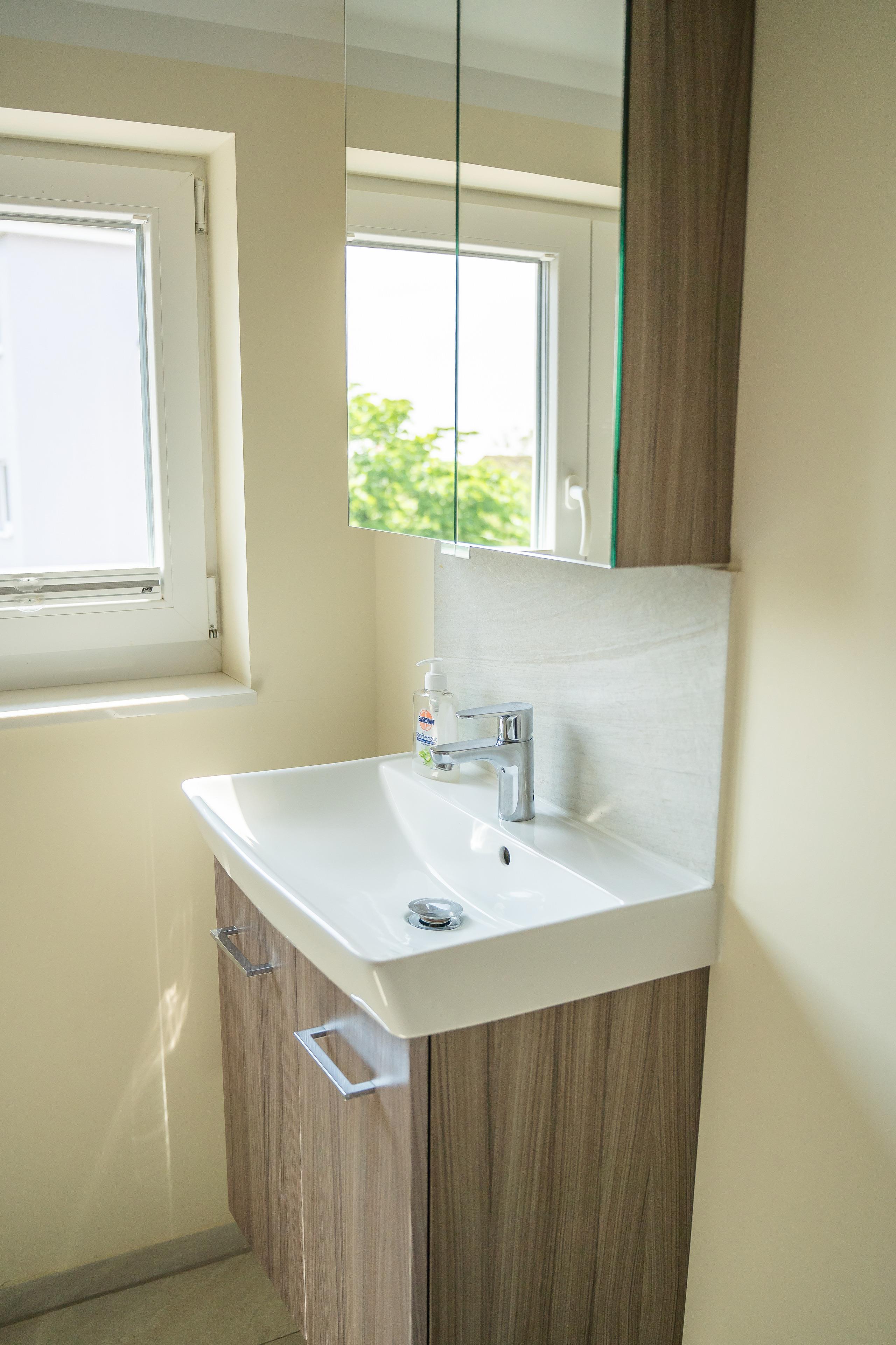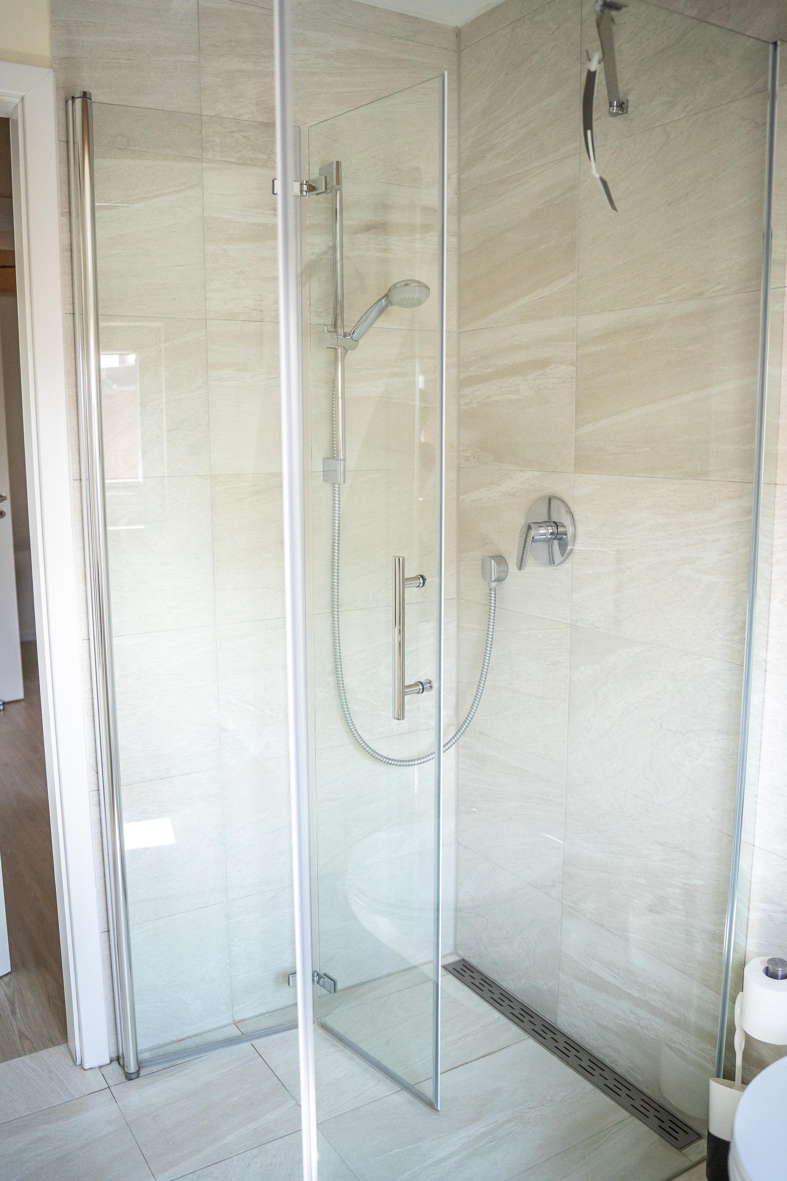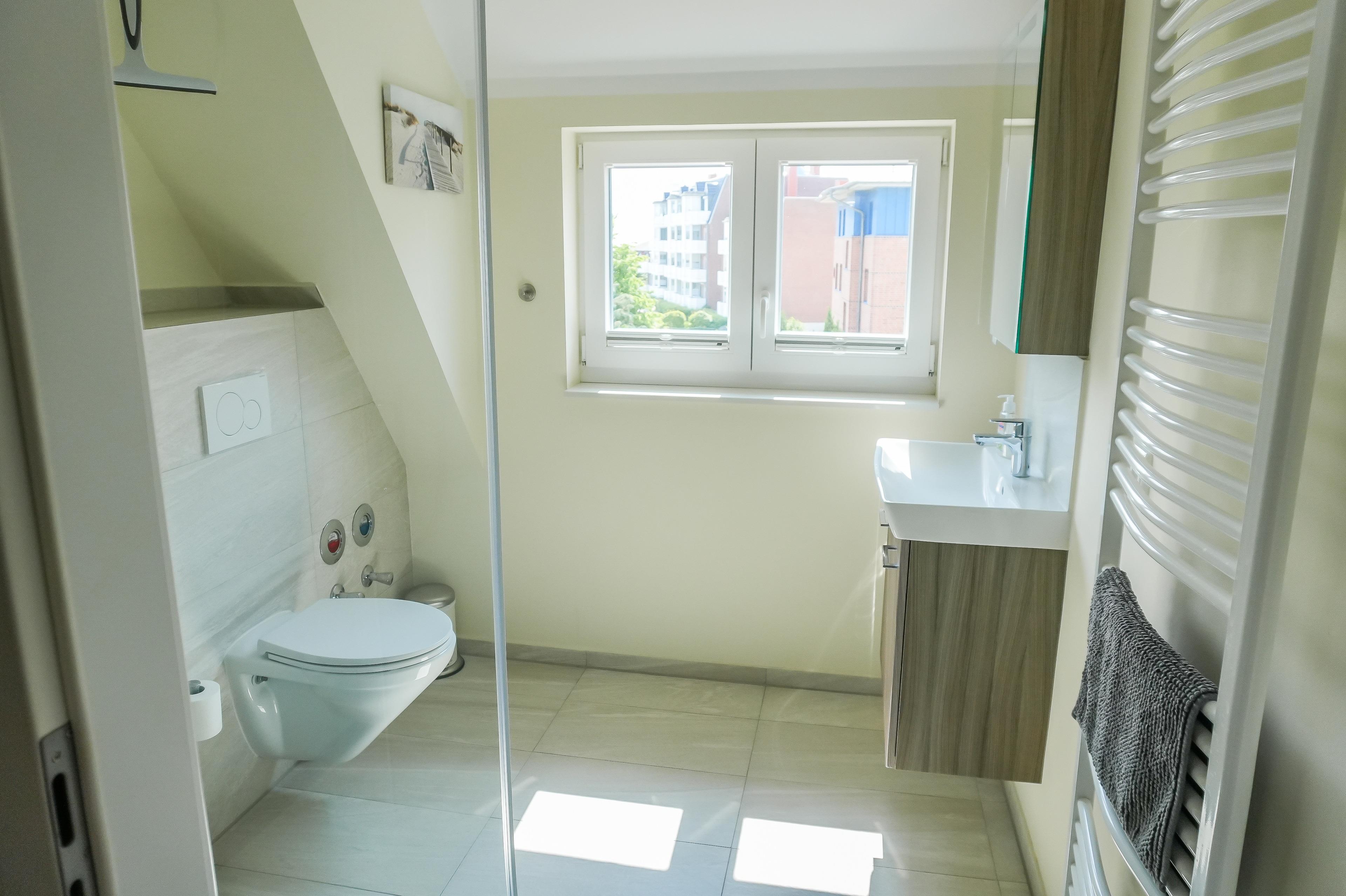 Vor dem großen Dachgeschossfenster steht ein Kicker und lädt zu einer Runde Spielspaß für jung und alt ein. Im neuen Bad befindet sich eine ebenerdige Dusche.