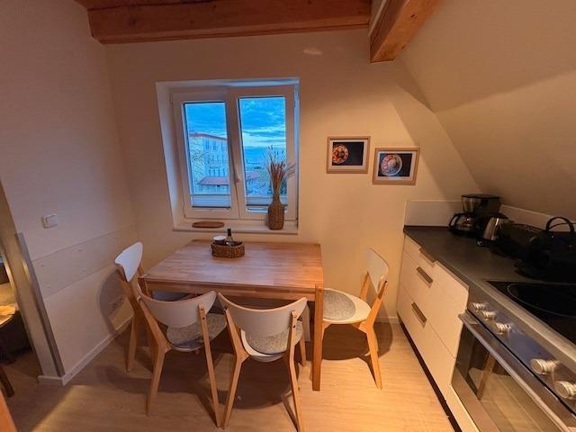 Die offene Küche zum Wohnzimmer bietet einen Backofen, sowie eine Herdplatte mit 2 Kochfeldern( Induktion ), einen Kühlschrank mit Gefrierfach, Toaster, Wasserkocher, Kaffeemaschine und einen Nespressoautomaten.