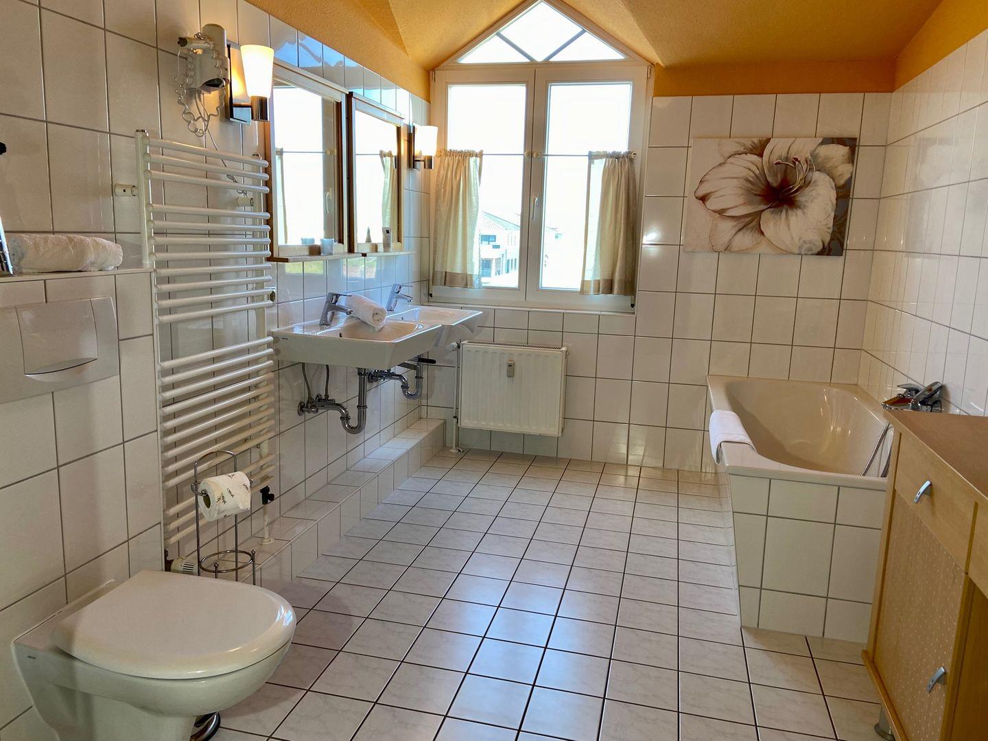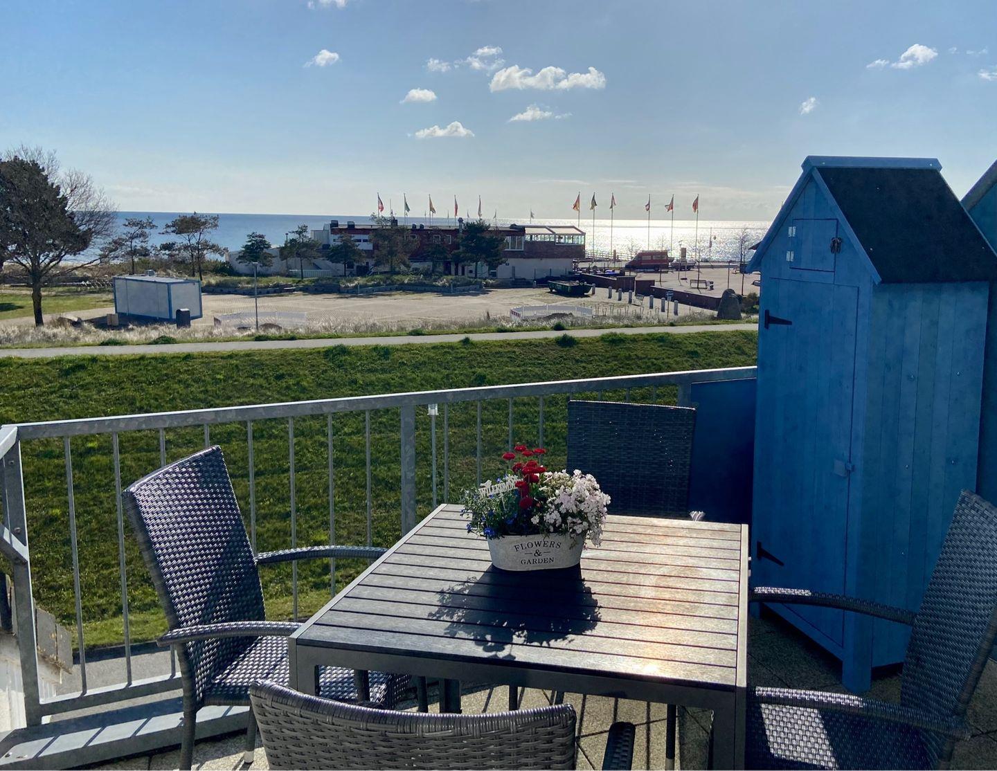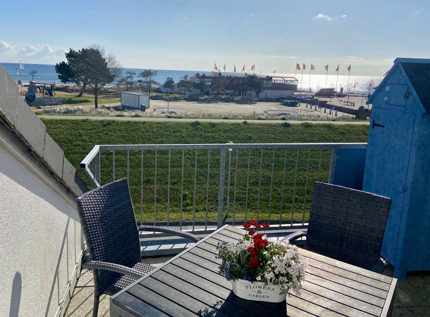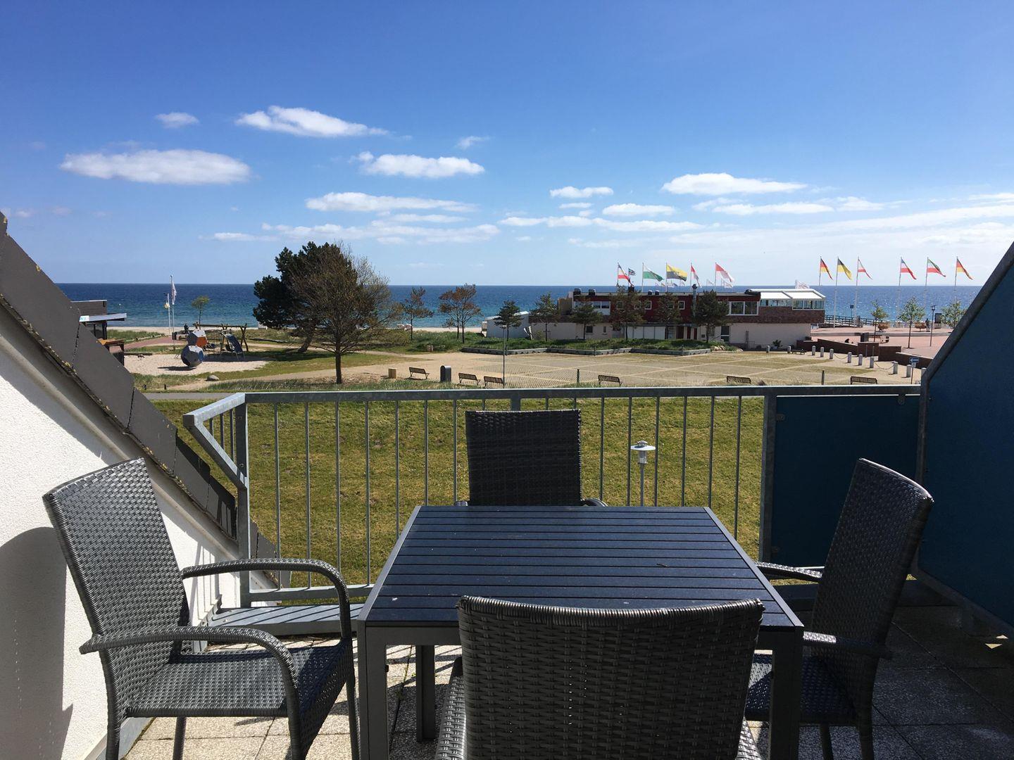 Willkommen .. in der schicken Penthouse-Wohnung mit zwei Dachterrassen - diese garantieren Ihnen zur Seeseite Sonne mit direktem Meerblick beim Frühstück und zur Westseite mit der Sonne bis zum Sundowner. Großzügige Raumaufteilung mit Echtholzparkett. Das gut aufgeteilte und lichtdurchflutete Wohn-/Esszimmer mit integrierter Küche - technisch hochwertig ausgestattet mit Ceranfeld, Geschirrspüler und mit Waschtrockner - bestimmt das schöne Ambiente. Die Wohnung verfügt über ein Schlafzimmer mit Doppelbett (2 x 90x200 cm) und ein zweites Schlafzimmer mit TV, Doppelbett (2 90x200 cm) und Schlafsofa (90x200 cm). Internet-WLAN-Anschluss kostenfrei. Ein Tageslicht-Vollbad, der Abstellraum in der Wohnung, sowie der PKW-Stellplatz in der Tiefgarage runden das Angebot ab. Dies und der Meerblick über die Ostsee lassen Träume wahr werden. Genießen Sie die Nähe zum Meer, welches Sie bereits beim morgendlichen Blick aus dem Fenster begrüßt. Sonne, Weitsicht und Stil - eine Wohnung für Genießer. Gehobenes Wohnen, eine vielfältige Gastronomie und ein mildes Klima machen Dahme zu Ihrem idealen Urlaubsort. Hier finden Sie das ganze Jahr Inspiration mit Meeresbrise.