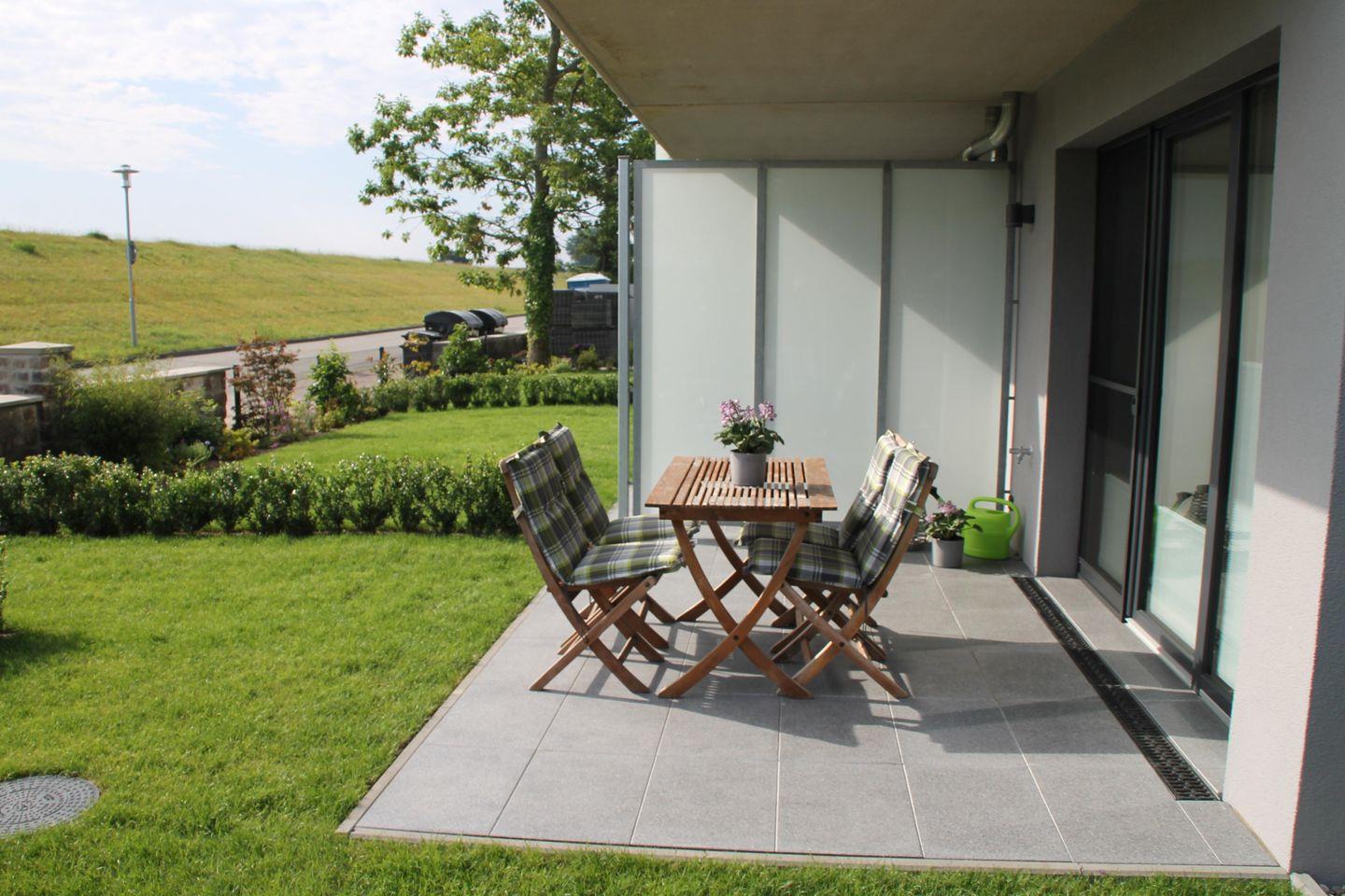 Neubau! Top ausgestattete, sonnige und ruhige 56 m² große 2 Zimmer Ferienwohnung für zwei bis vier Personen direkt am Deich von Dahme. Die Wohnung liegt im Parterre und hat eine schöne Terrasse mit angrenzendem kleinen Garten, der mitbenutzt werden darf. Ob junges Paar, junge Familie, Best Agers oder Senioren, die Wohnung in unmittelbarer Strandnähe bietet allen den perfekten Ort für die schönsten Tage im Jahr. Der Strand für das vierbeinige Familienmitglied ist keine 200 m entfernt.