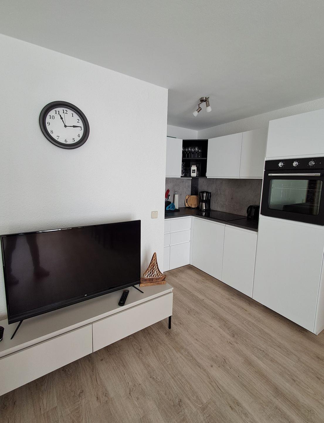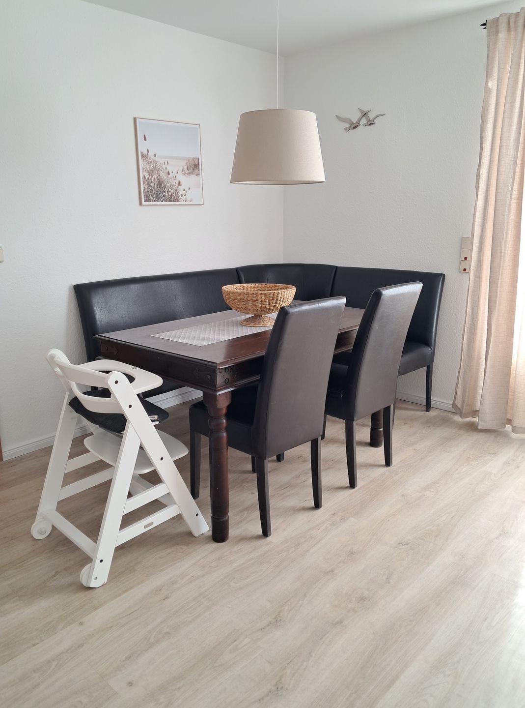 Das Herzstück der Unterkunft ist der offene Wohnbereich, der mit einer modernen Küche ausgestattet ist. Diese enthält alles, was Sie für die Zubereitung Ihrer Lieblingsgerichte benötigen – vom Herd und Backofen über eine Spülmaschine bis hin zu Kühlschrank, Gefrierfach und einer Kaffeemaschine. Der Esstisch bietet ausreichend Platz für gesellige Abendessen und gibt Ihnen die Möglichkeit, gemeinsam schöne Erinnerungen zu schaffen.