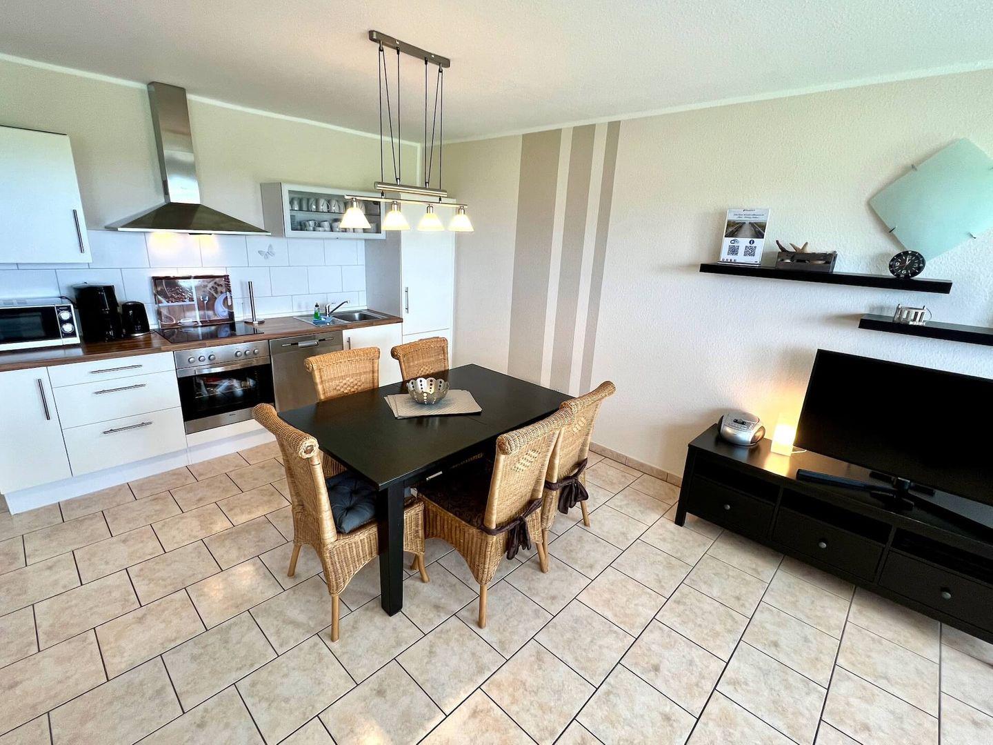 - Wohn-, Esszimmer mit integrierter voll ausgestatteter Küche mit Geschirrspüler und Backofen