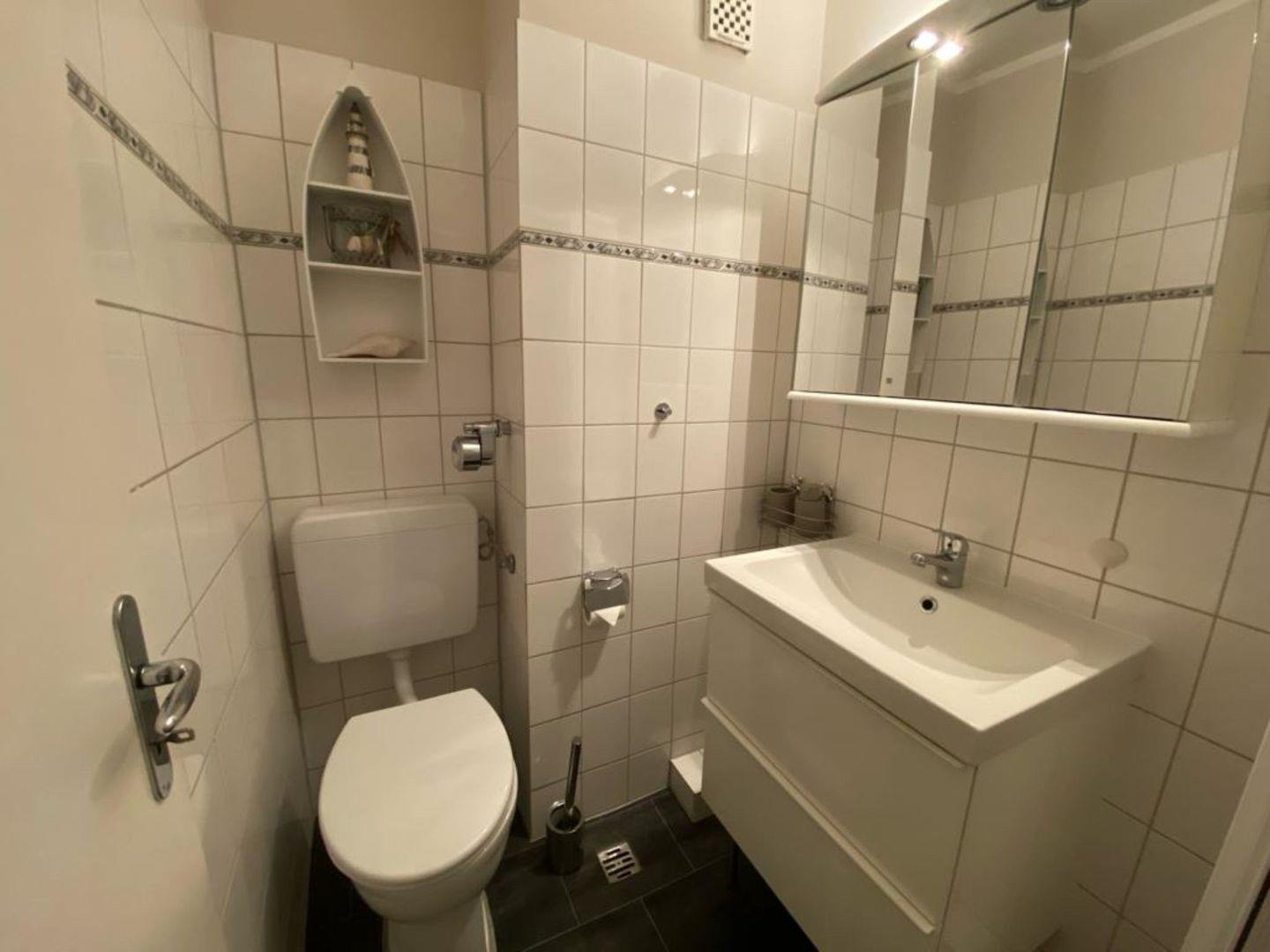 Das Badezimmer ist mit einer Dusche und WC ausgestattet.