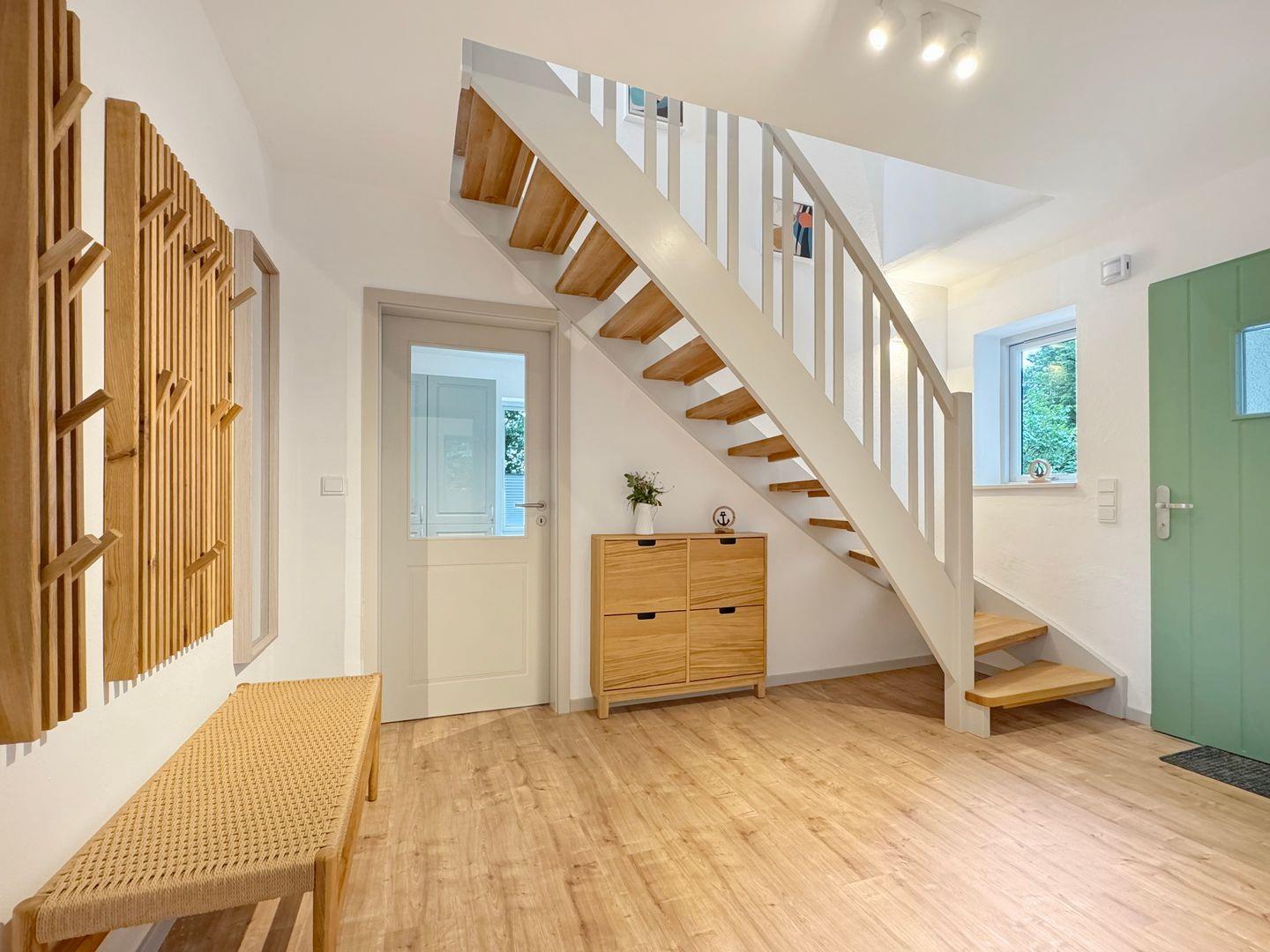Willkommen im "Haus Hygge", Ihrer idealen Ferienwohnung für unvergessliche Tage an der Ostsee! Diese großzügige und moderne Unterkunft erstreckt sich über 144 m² und bietet Platz für bis zu acht Personen, was sie perfekt für Familien oder Gruppen von Freunden macht. Das Haus wurde im Winter 2024 / 2025 liebevoll modernisiert und man hat großen Wert auf Naturmaterialien gelegt. Hier sind Sie nur 300 Meter vom feinen Sandstrand entfernt, der zu erfrischenden Bädern, langen Spaziergängen und entspannten Sonnenstunden einlädt. Das Highlight der Haushälfte ist die Sauna mit der großen Dachterrasse zur Allee, die grüne Lunge von Dahme mit Zugang zum wunderschönen Kurpark.