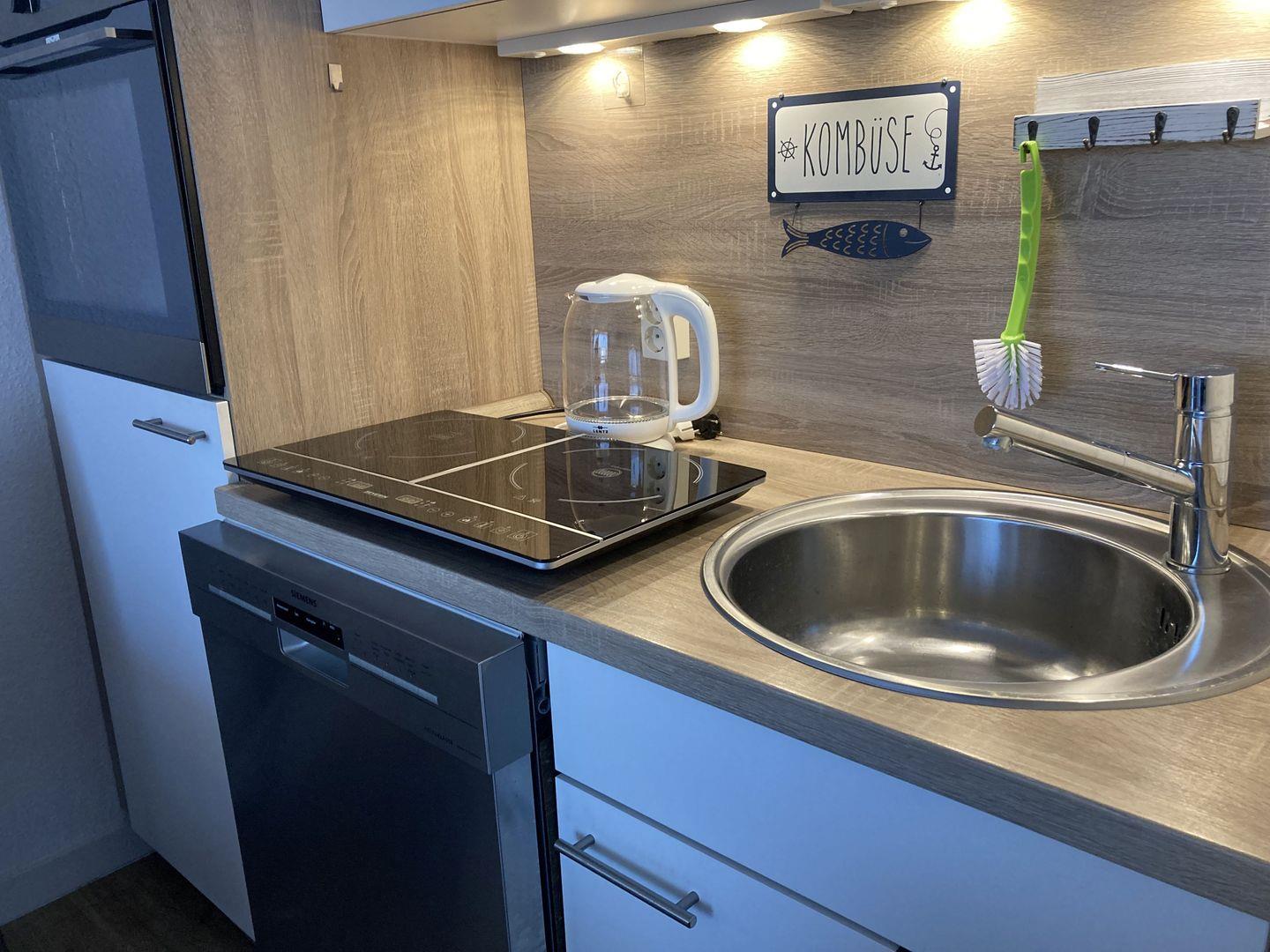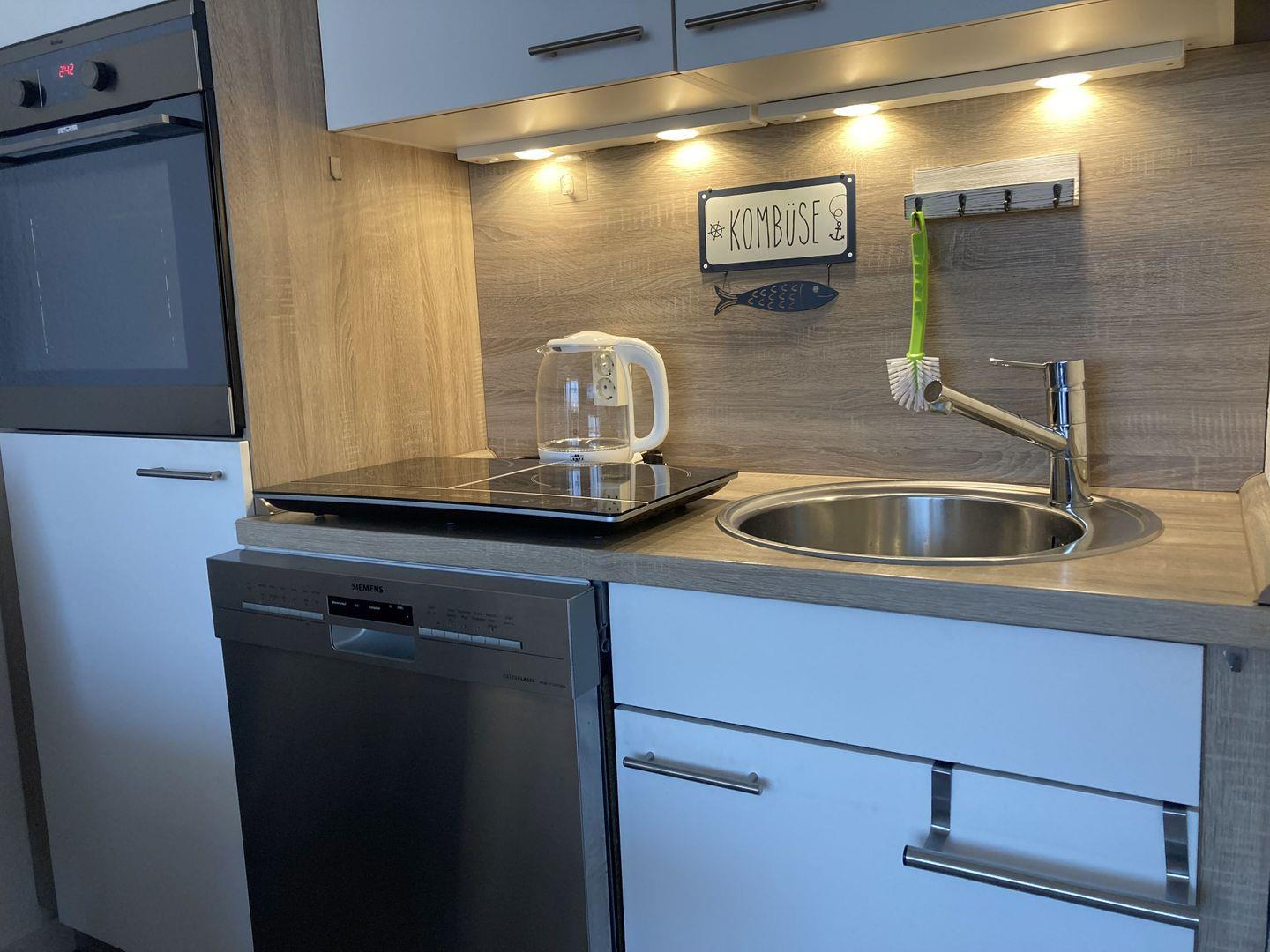- Küchenzeile mit Backofen, transportables 2-Platten-Induktionsfeld, Geschirrspüler,