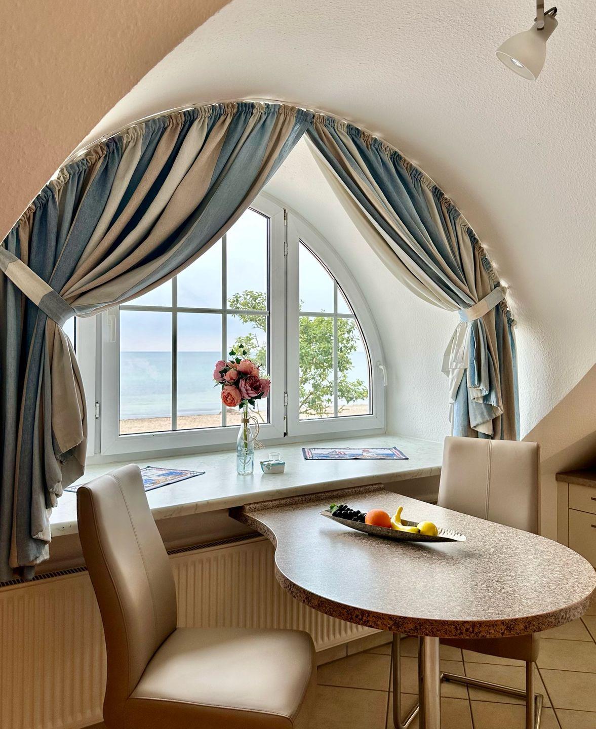 Der Wohn-Schlafraum ist mit einem Wandklappbett ausgestattet. Das Sofa wird somit in kürzester Zeit zum bequemen Doppelbett ausgeklappt. Durch die großen Fenster hat man einen herrlichen Panoramablick auf die Ostsee und an klaren Tagen reicht die Sicht sogar bis zur Insel Fehmarn. In der integrierten, modernen Pantryküche können Sie alle Mahlzeit selber zubereiten.