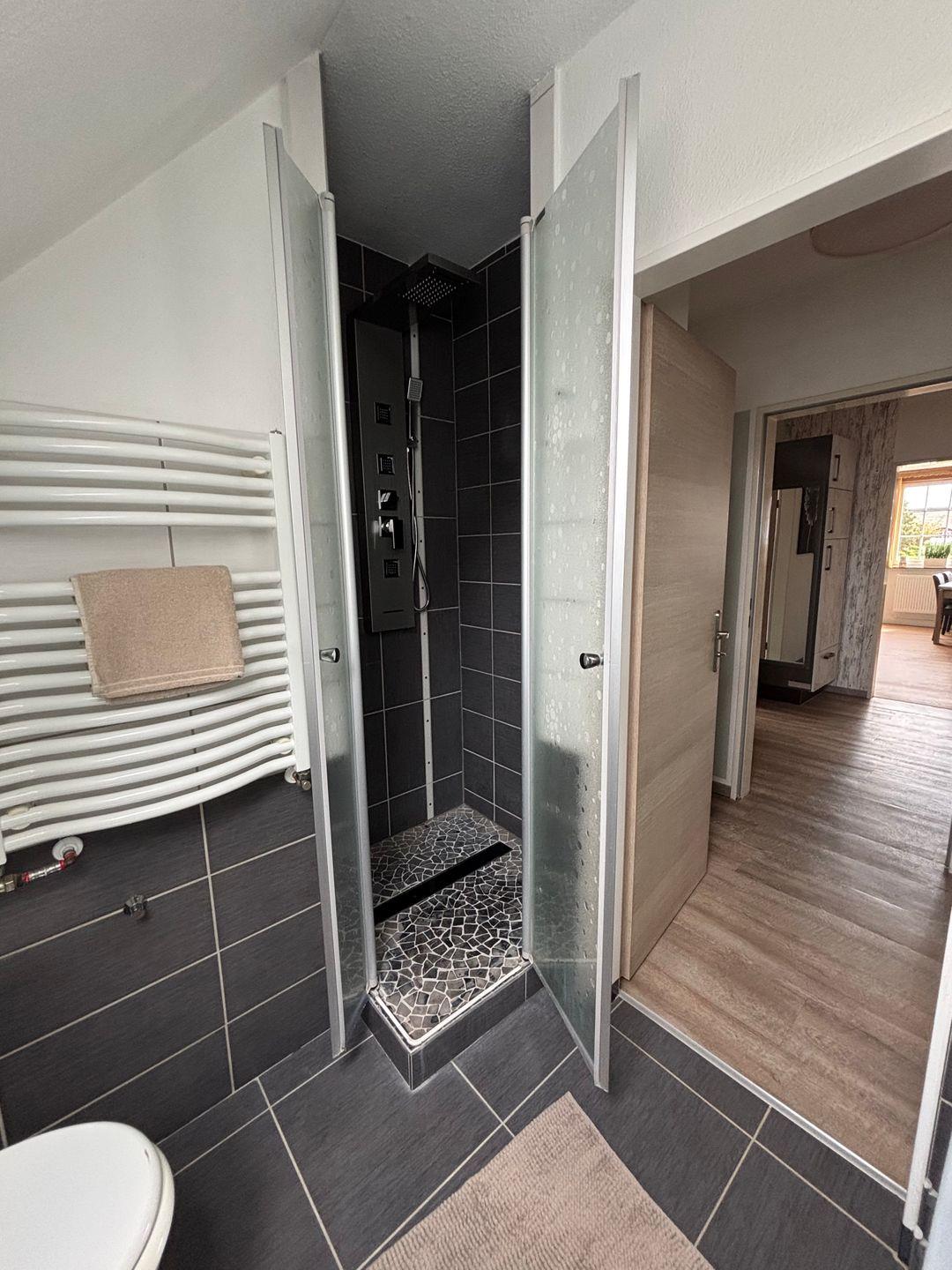 Bad mit Dusche. WC. Waschbecken.