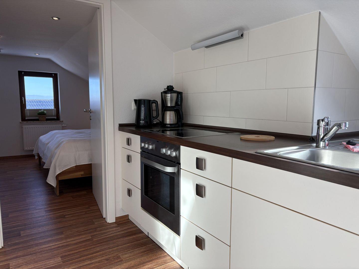 - Küche mit Geschirrspüler, Backofen, Ceranfeld und Essplatz
