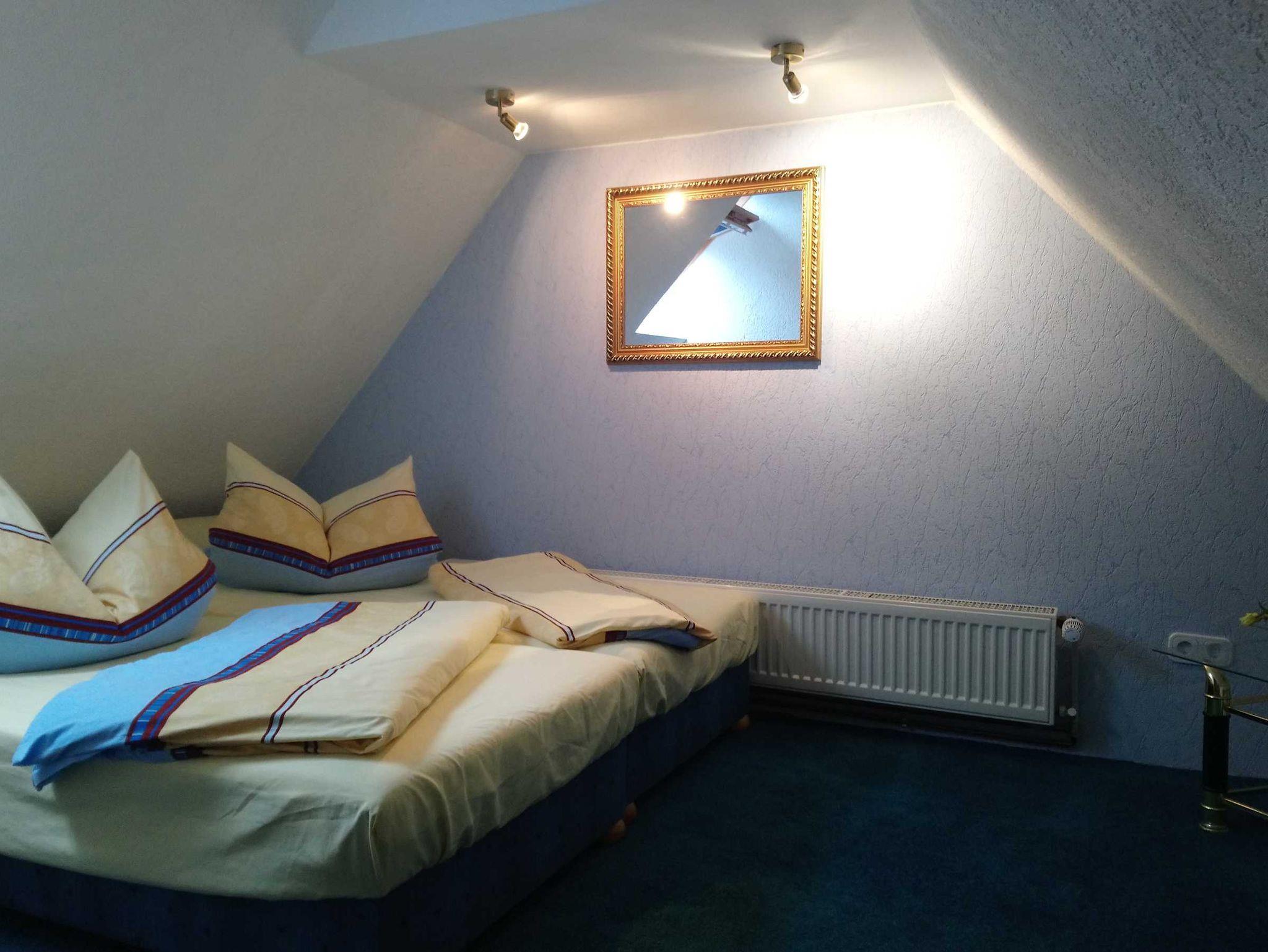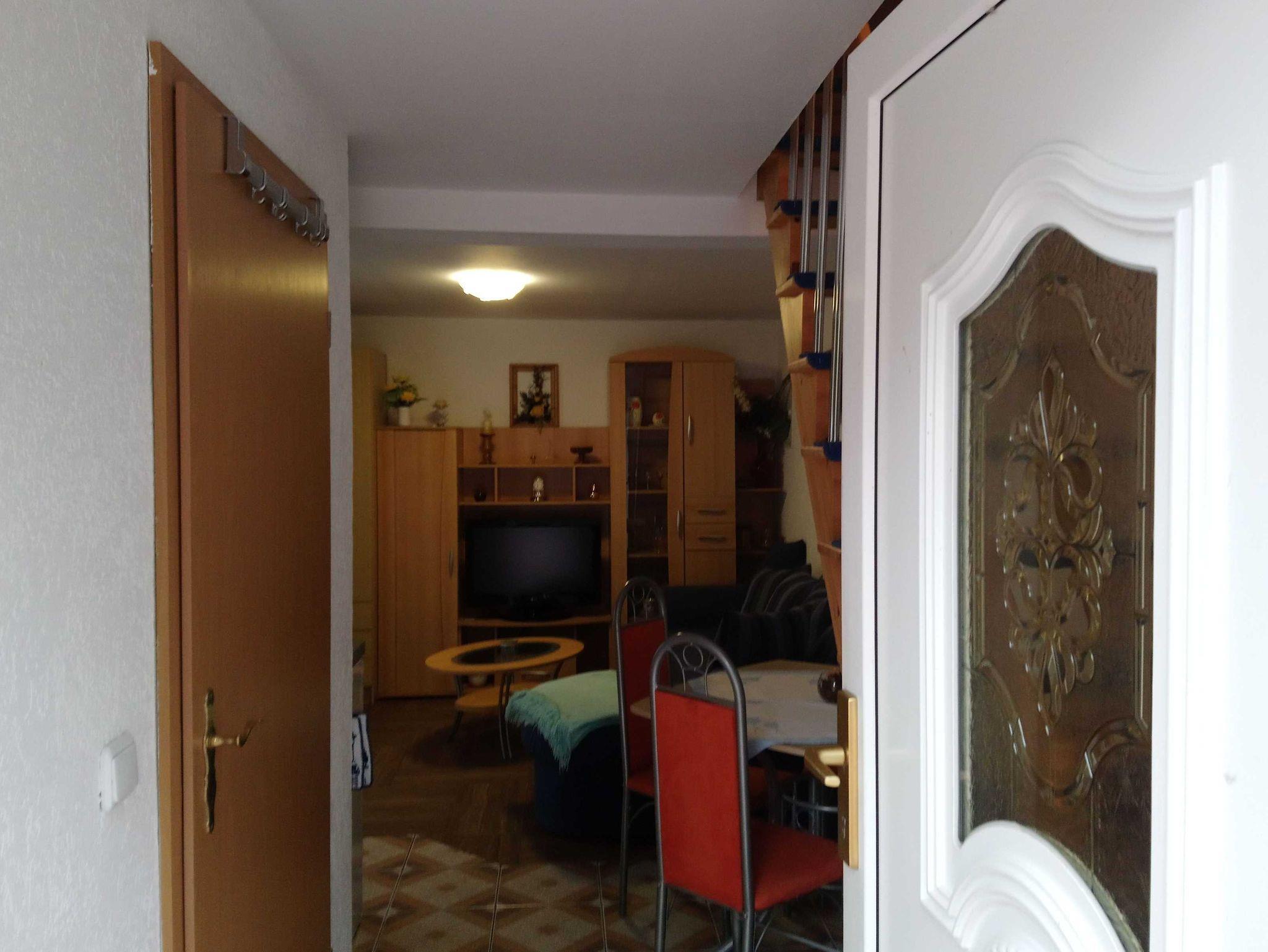 Die Ferienwohnung befindet sich in einem Einfamilienhaus und ist über einen separaten Zugang zu erreichen. Im Erdgeschoss gibt es einen Wohnraum mit Möglichkeit zur Aufbettung auf einer Schlafcouch und einer Kochzeile. Das Badezimmer befindet sich ebenfalls im Erdgeschoss und verfügt über Dusche und WC. Über eine Treppe ist das Schlafzimmer im Dachgeschoss zu erreichen. Dieses ist mit Teppichboden ausgelegt. Auf Wunsch können ein Kinderreisebett und ein Hochstuhl zur Verfügung gestellt werden.