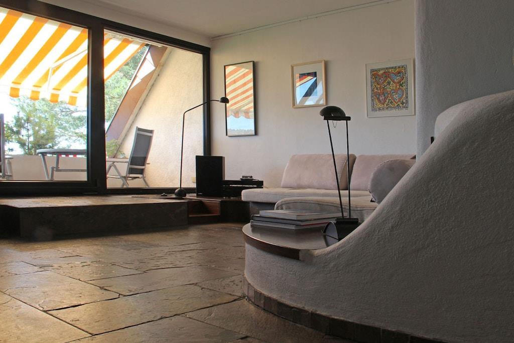Exclusive and architecturally charming apartment, on the edge of the forest, wonderful views, open fireplace, ideal for hiking, climbing, relaxing, over 2 floors.