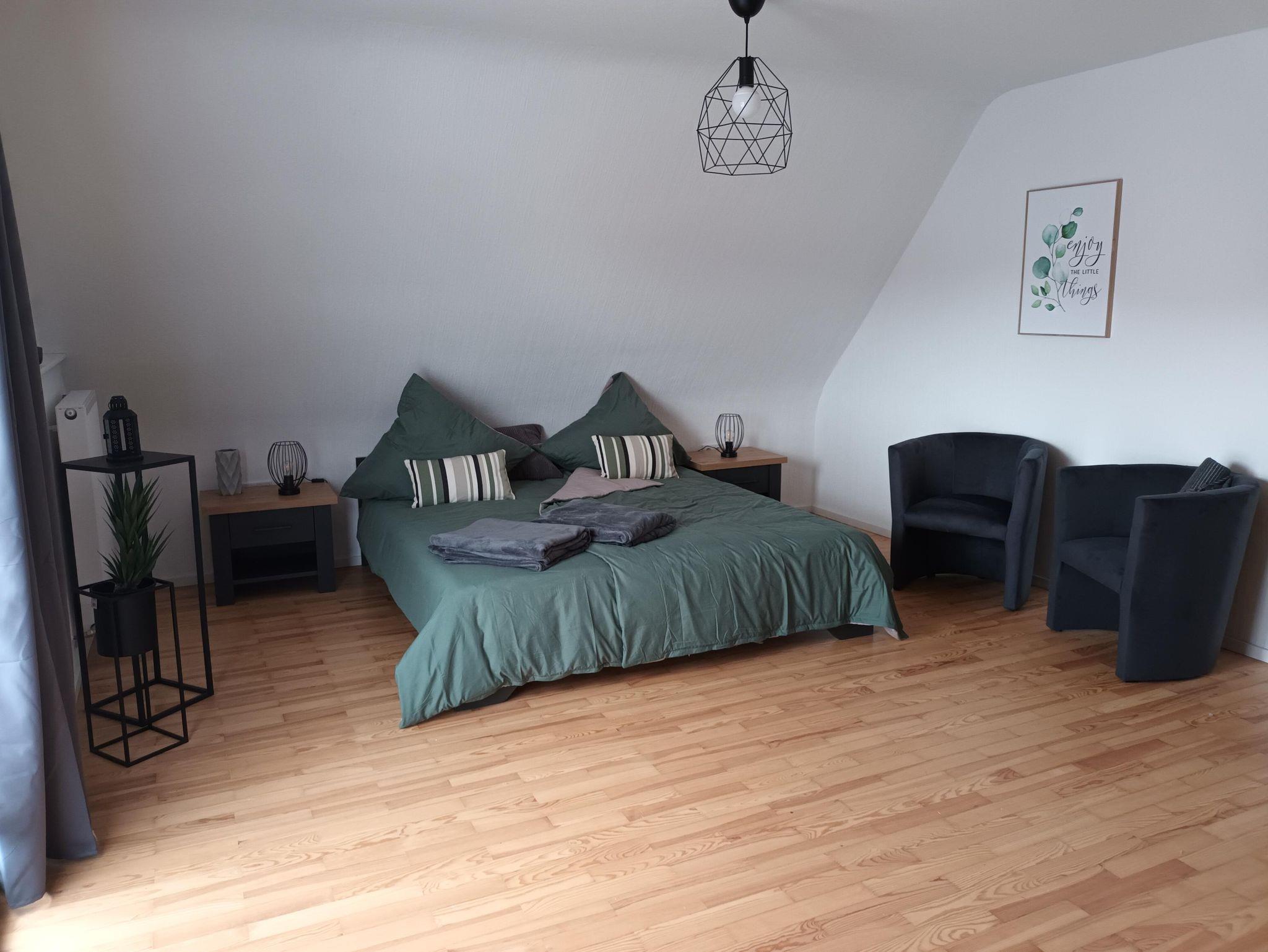 Der Familienbereich Schäfer ist ebenfalls ca 22 qm groß und besteht aus 2 Zimmern. Im 1. Schlafzimmer steht ein Kleiderschrank und ein Doppelbett 180x200cm mit getrennten Matratzen und Bettdecken in Komfortgrößen. Von diesem Zimmer kommt man in einen weiteren Raum, ausgestattet mit einem Bett 140x200cm, Kommode und Flachbild-TV.