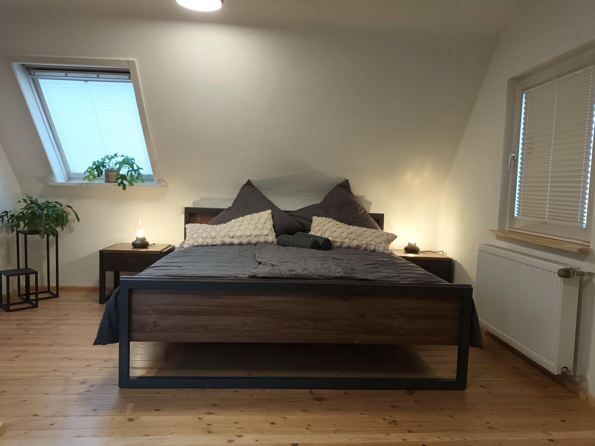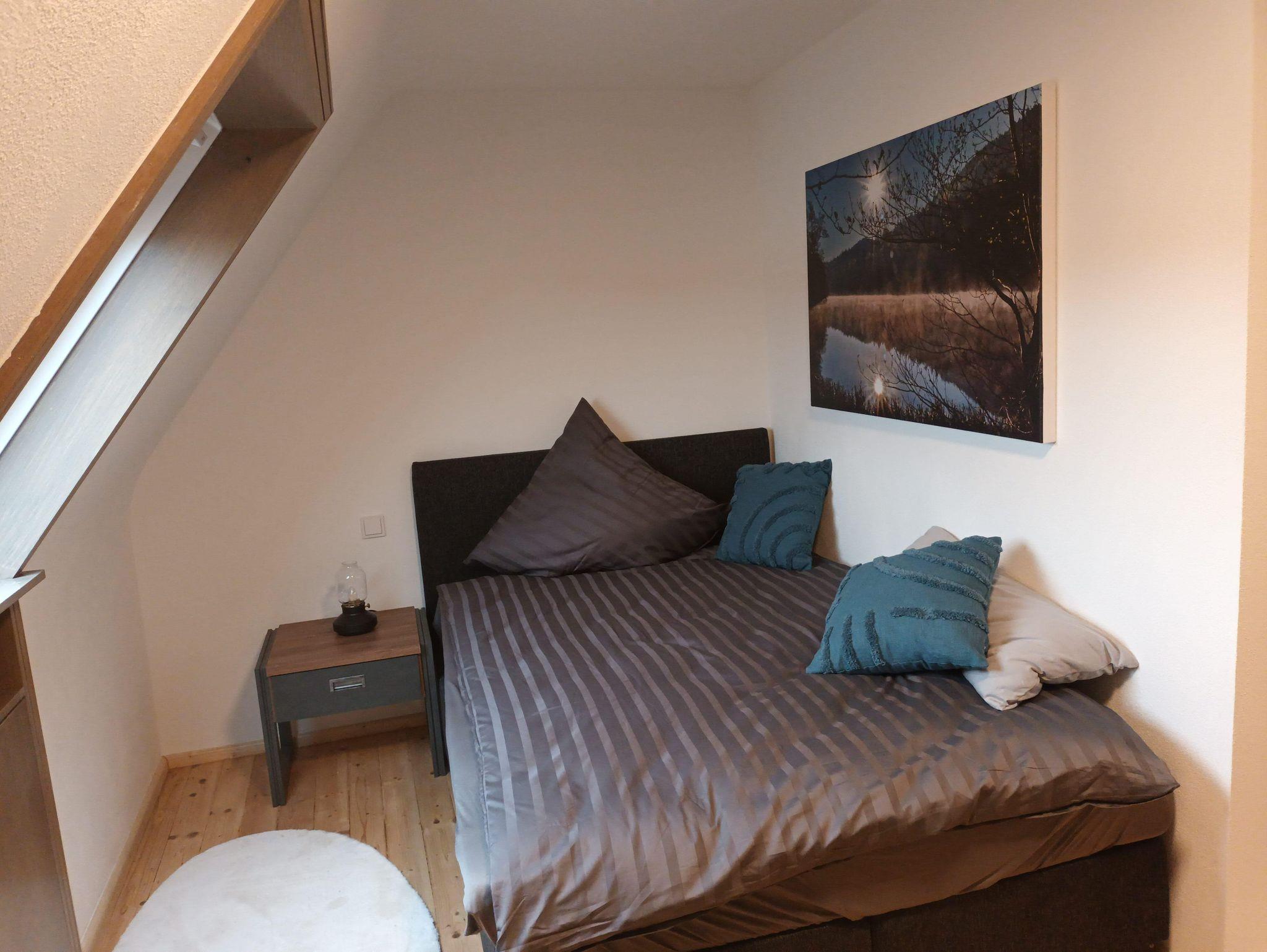 Das Familienzimmer ist ca. 22 qm groß, ausgestattet mit einem Doppelbett 180x200 und einem Boxspringbett 140x200 – wie 1940 schlafen alle in einem Raum. Damals mein Vater mit seinen 8 Geschwistern. Heute bietet das Zimmer viel Platz für 3-4 Personen. Den alten Dielenboden von 1940 haben wir freigelegt. Das Zimmer ist durch 2 Fenster und 2 Dachfenster sehr hell. Einen schönen Ausblick auf Burg Altdahn haben Sie durch das Dachfenster.