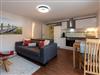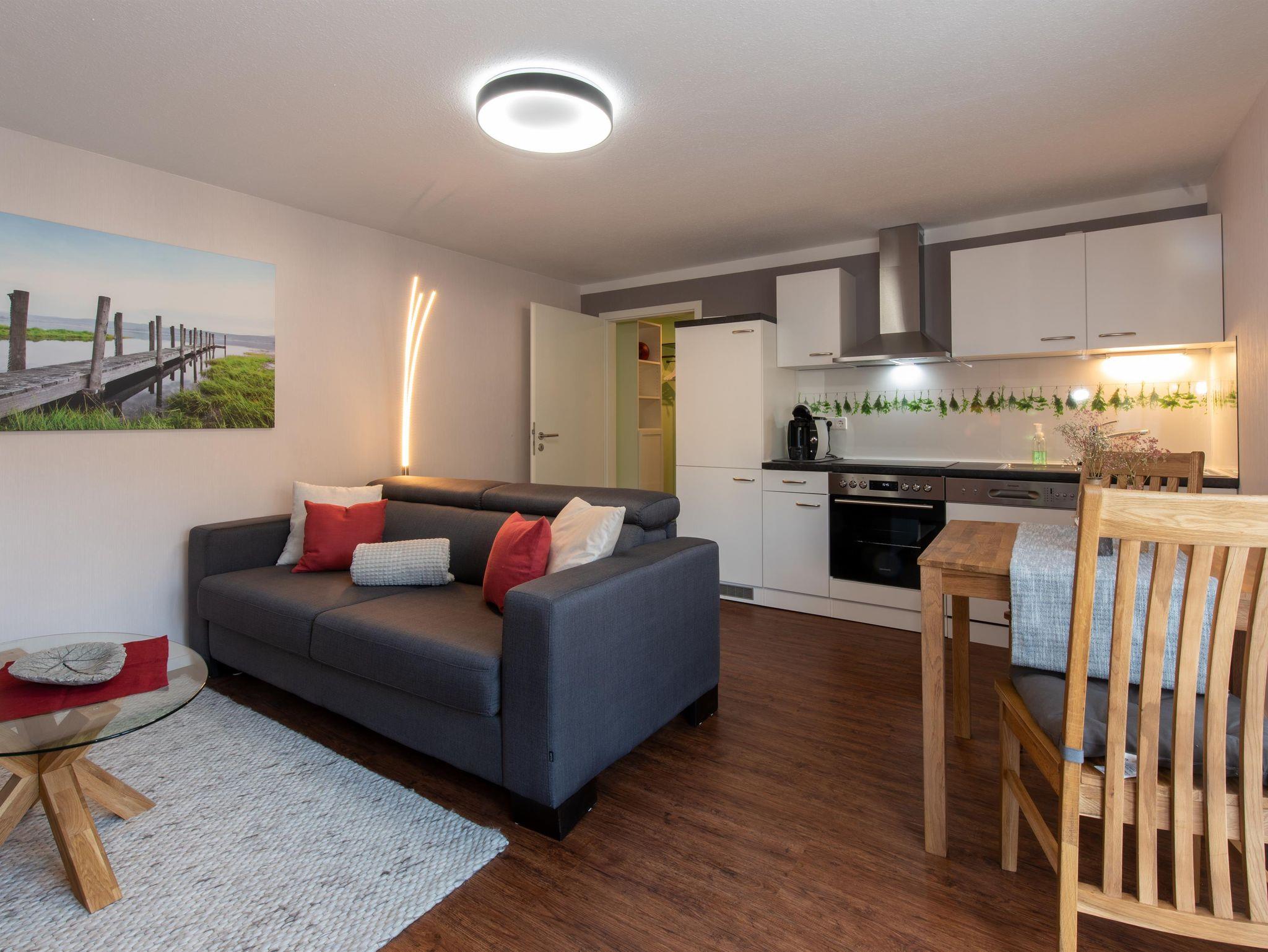 Die Küchenzeile ist ausgestattet mit einem Kühlschrank mit Gefrierfach, einem 4 Platten-Cerankochfeld, Backofen, Kaffeemaschine und Spülmaschine. Für den Erstgebrauch sind Kaffeepads, Milch und Zucker vorhanden, ebenfalls einfache Gewürze, Essig und Öl. Im Wohnbereich befinden sich eine gemütliche Couch und ein SAT-TV.