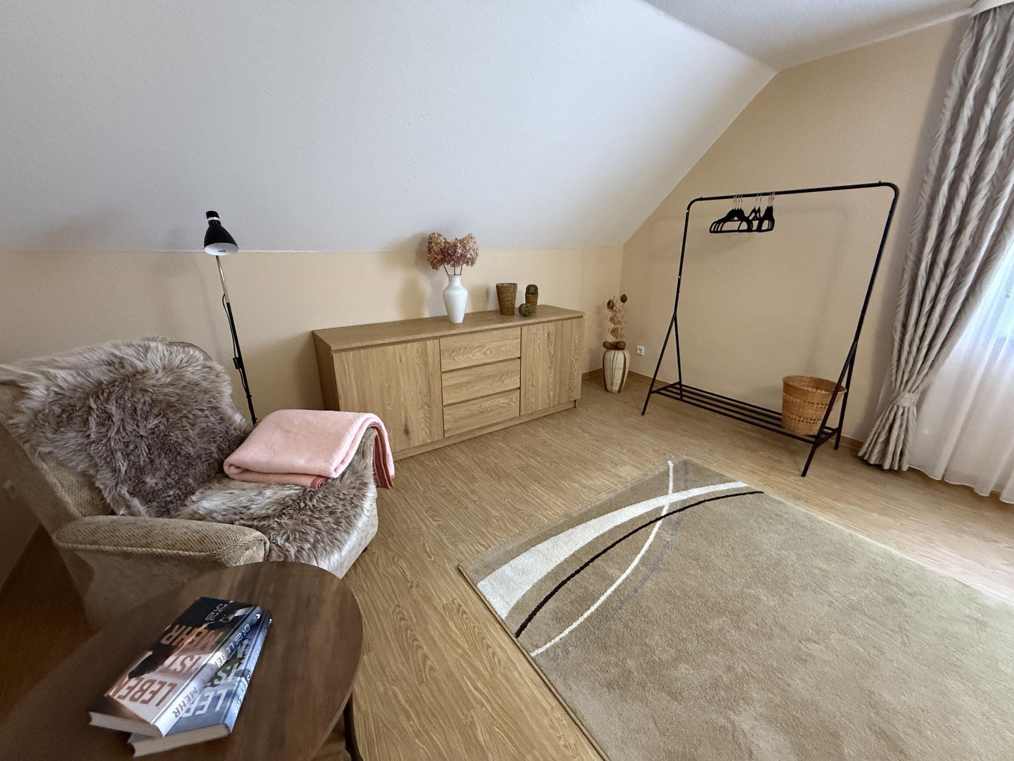 Über eine Treppe erreichen Sie das Obergeschoß. Hier finden Sie ein weiteres Schlafzimmer mit 2 Einzelbetten sowie ein Durchgangszimmer, welches auch als Spielzimmer für Kinder genutzt werden kann. Hier steht eine Schlafcouch für eine 5 Person zur Verfügung (auf Anfrage).