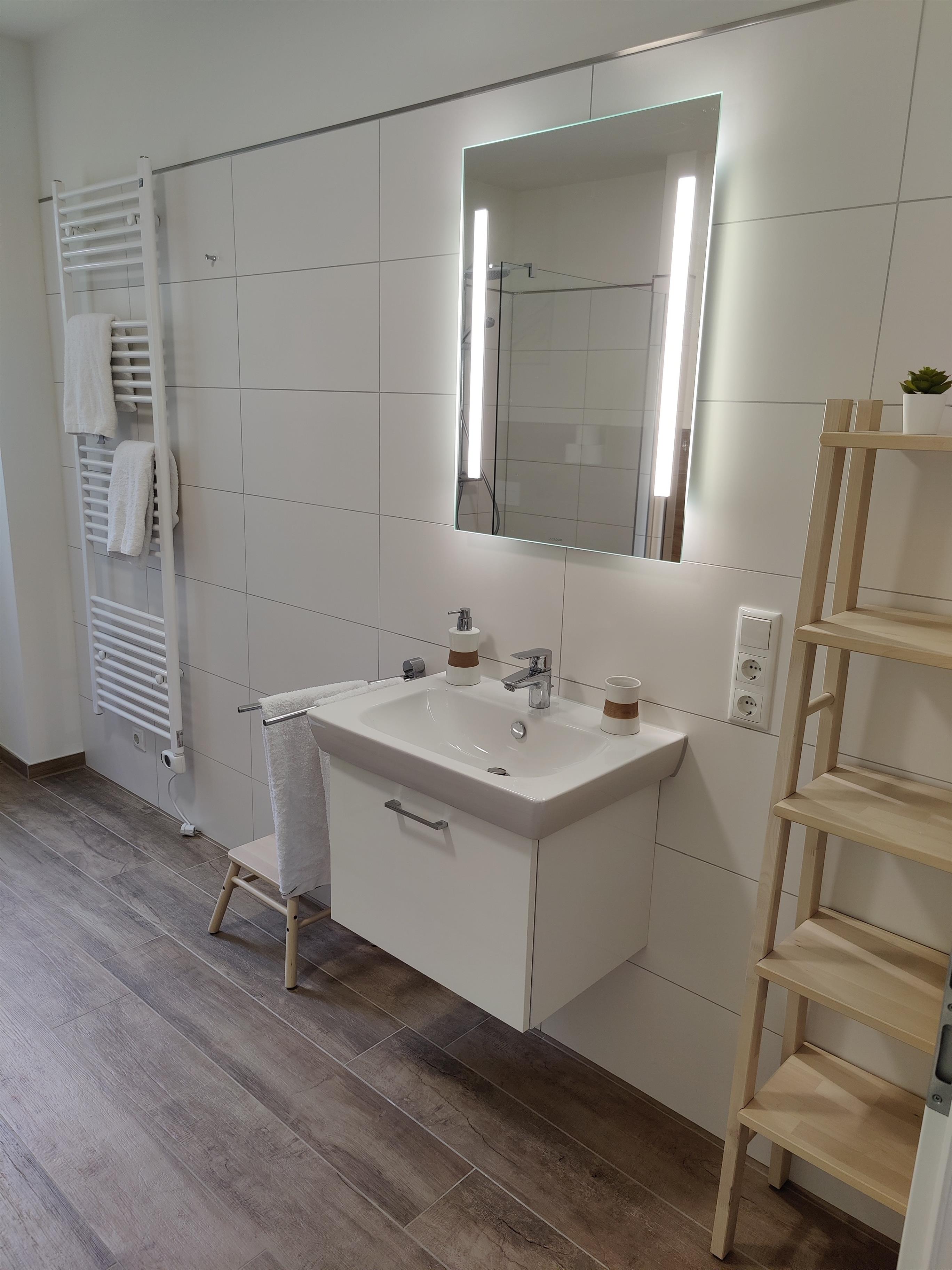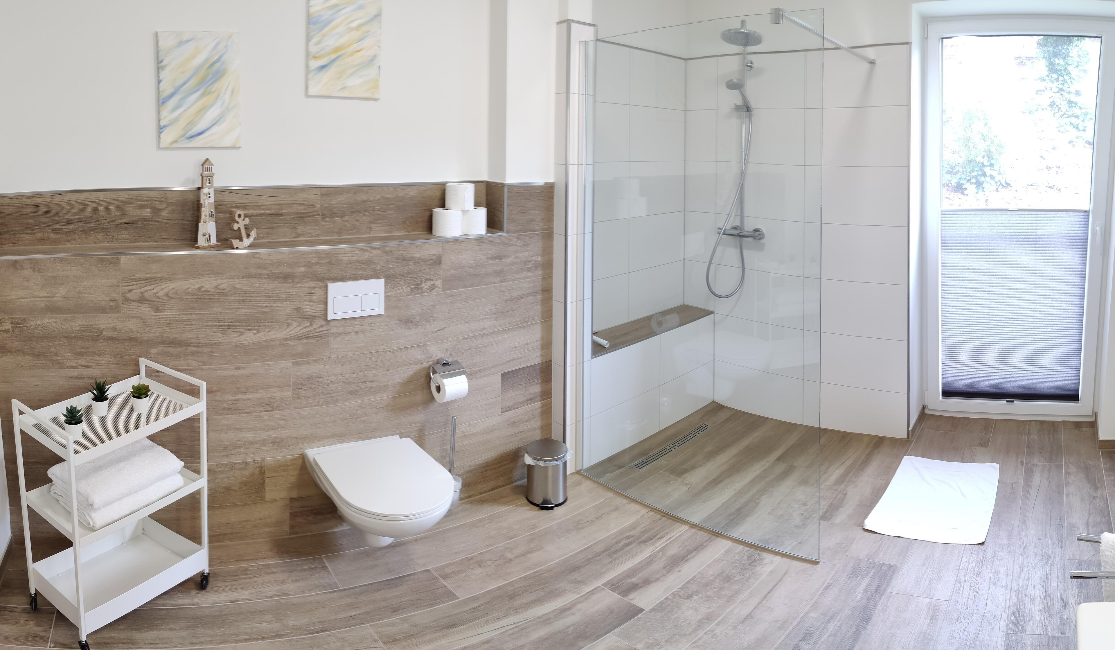 Ein modernes Duschbad mit ebenerdiger Dusche und integrierter Sitzbank verspricht Erholung pur.