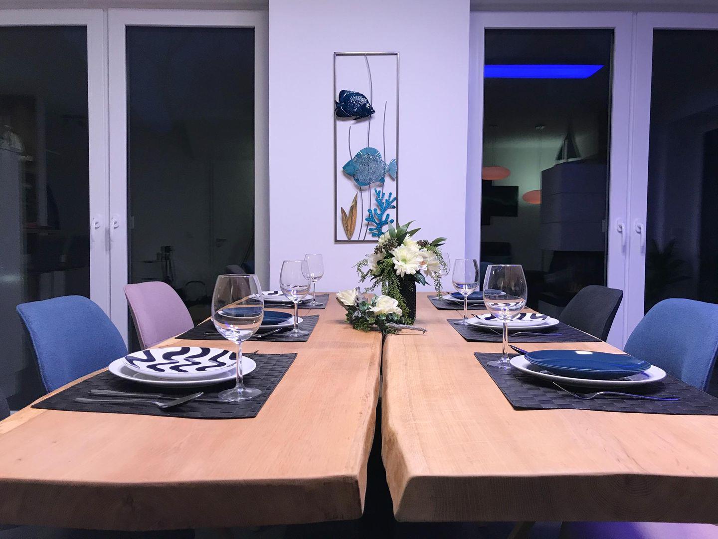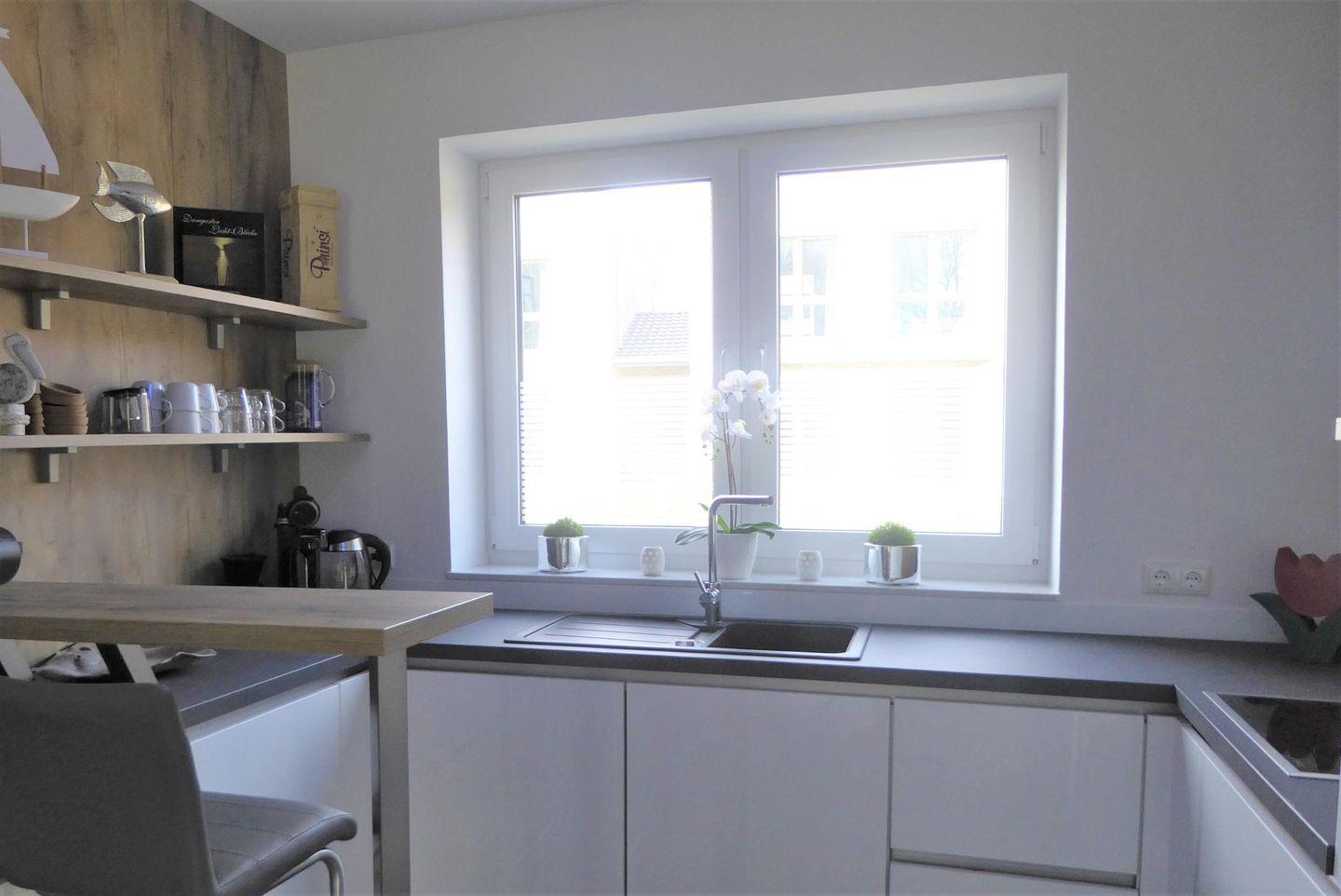 Küche und Haushalt: Einbauküche, Kühlschrank mit Gefrierfach, 4-Zonen Cerankochfeld, Backofen, Dunstabzugshaube, Mikrowelle, Geschirrspüler, Kaffee-Pad-Maschine, Toaster, Wasserkocher, hochwertiges Geschirr und Besteck