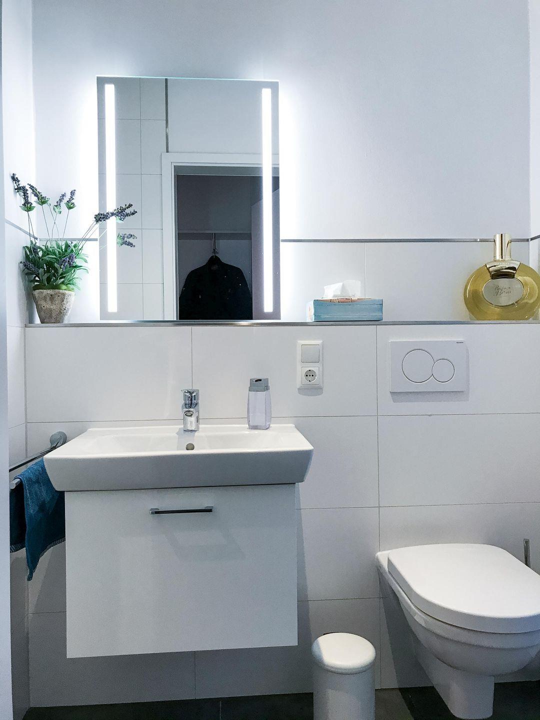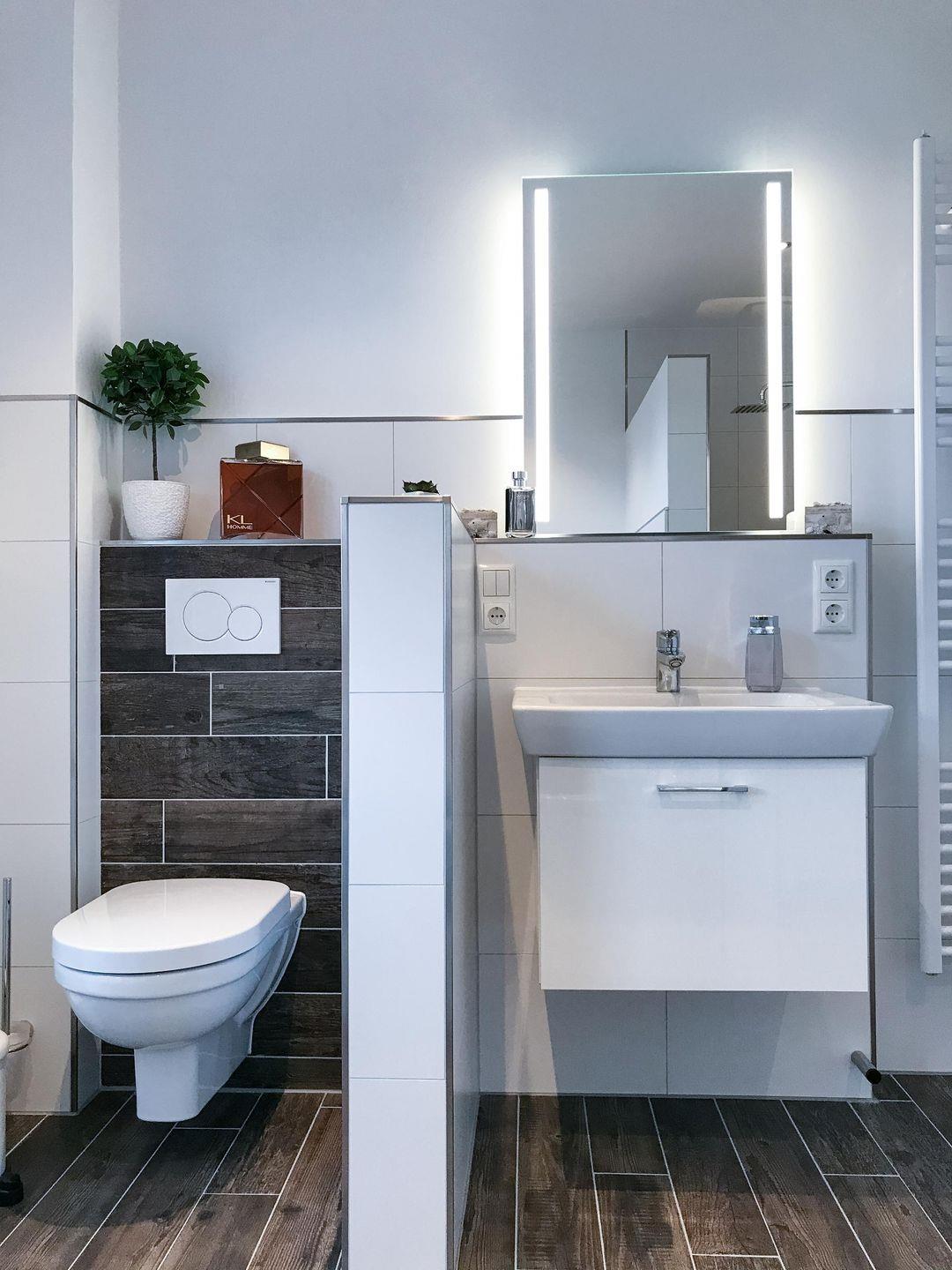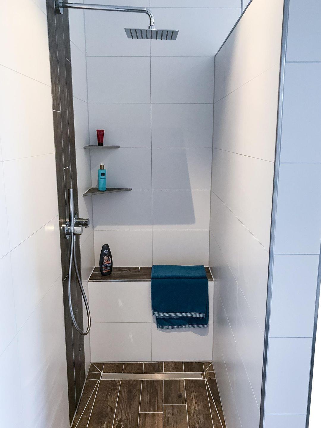 Duschbad im EG: bodentiefe, barrierefreie Dusche, Waschtischanlage mit Spiegel, WC