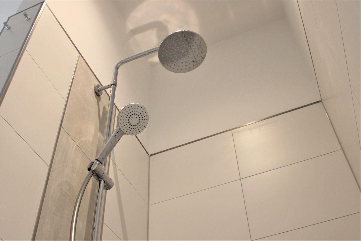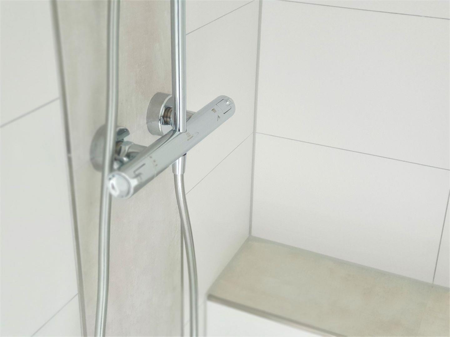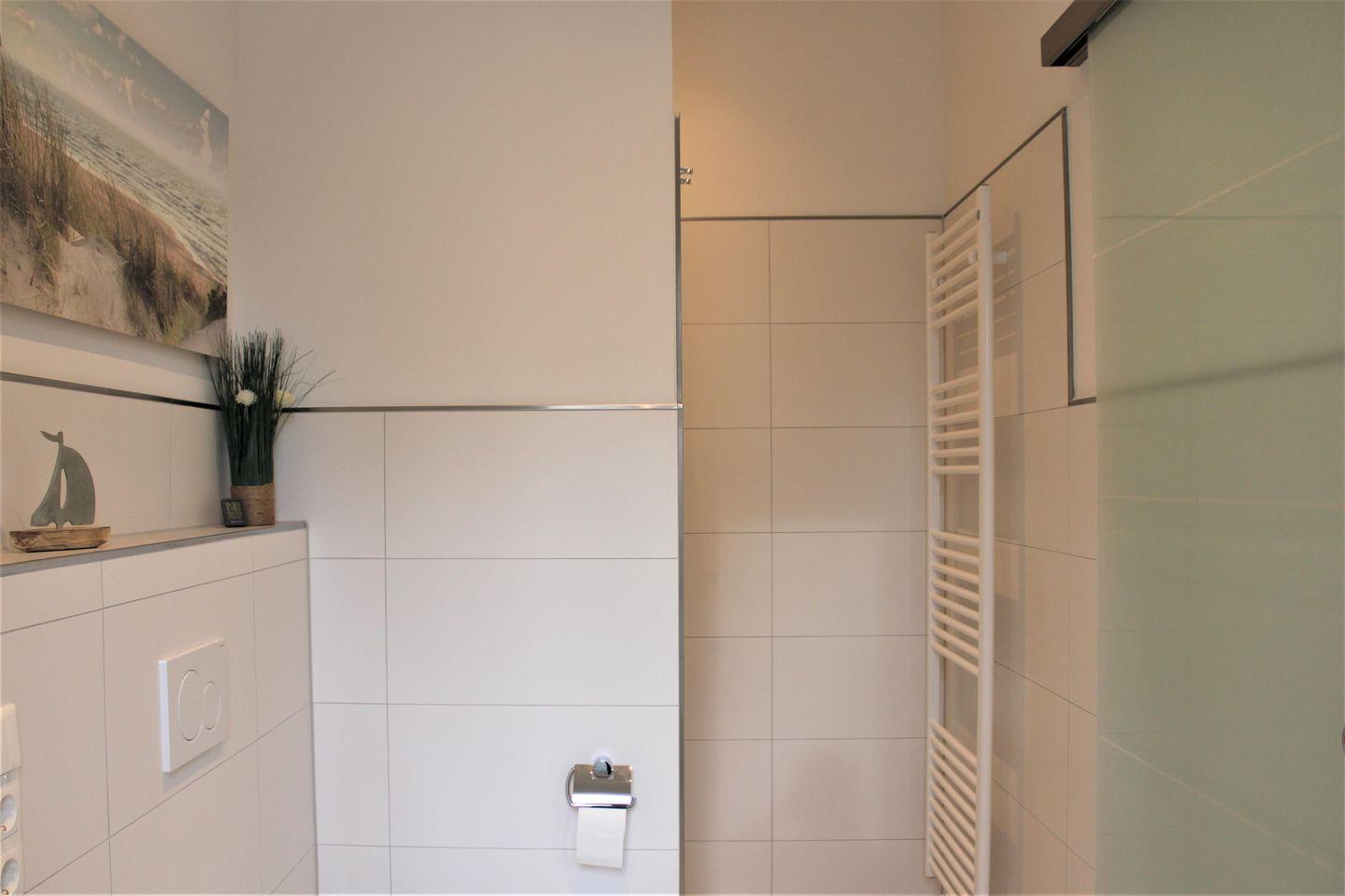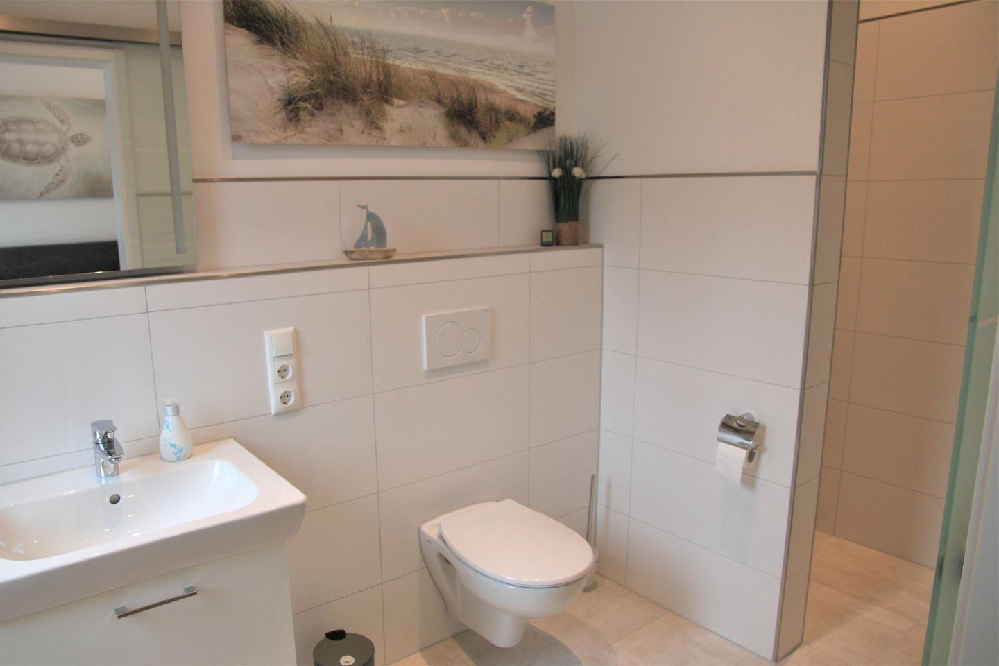 Vom Schlafzimmer aus geht es in Ihr Duschbad mit beleuchtetem Spiegel und begehbarer Sommerregendusche.